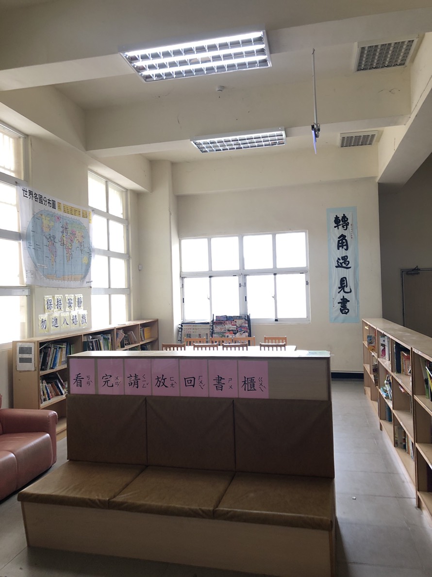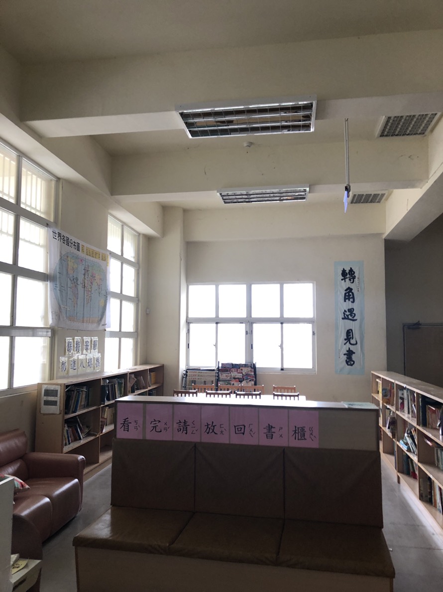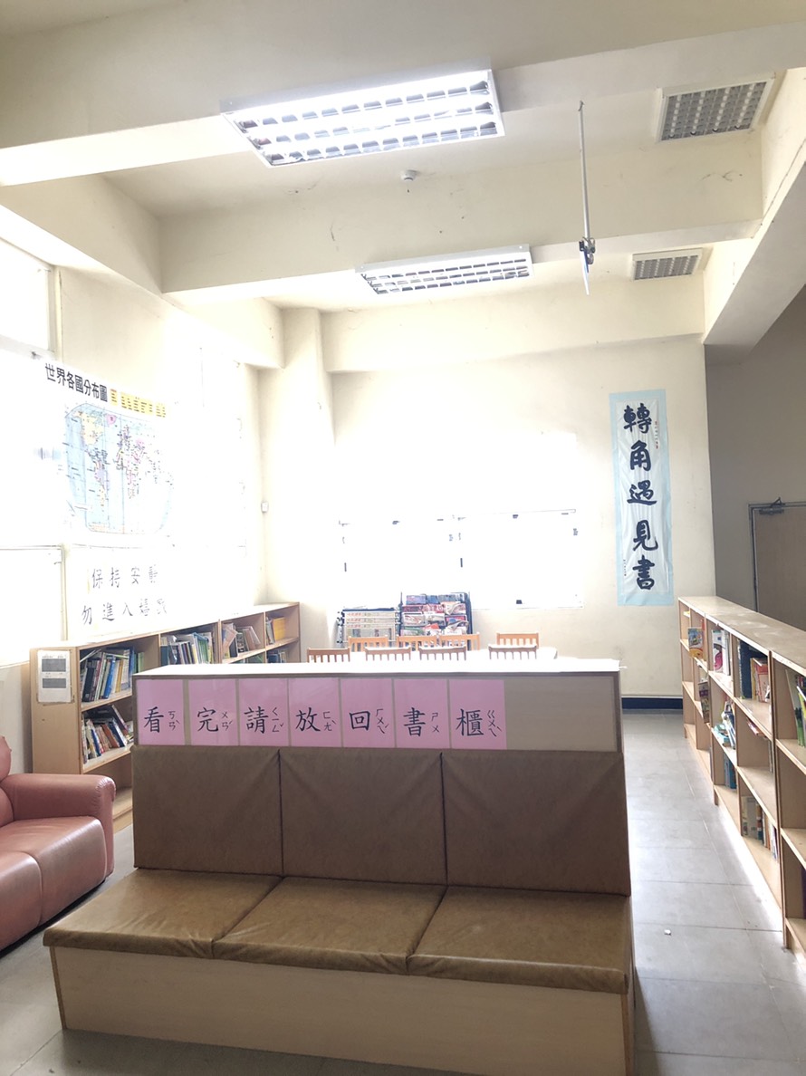 本校轉角遇見書區於105學年度在學校體一廣場轉角處設置,設置初期有鑒於燈源不足,於閱讀區旁側裝置2盞燈源, 但由於此區屬挑高樓層且未有輕鋼架天花板,造成上方燈源仍有不足,為使學生閱讀時更加清晰,並且維護學童視力健康,於是總務處於閱讀區上方依勢於柱子下方,利用學校原有燈架請廠商裝設2具大型燈源,提供優良閱讀環境,讓閱讀區能有充足燈源,便利學生、家長閱讀。