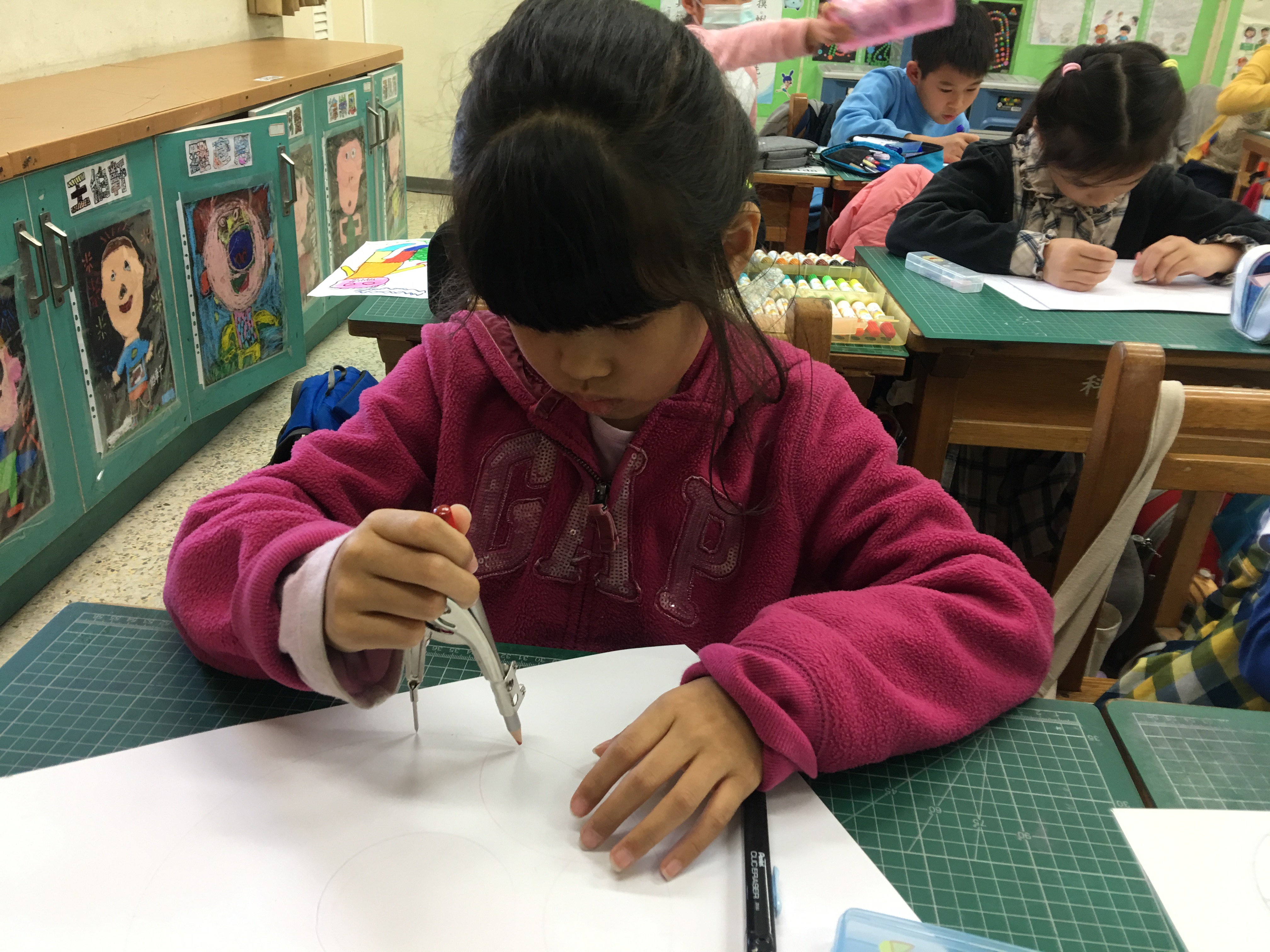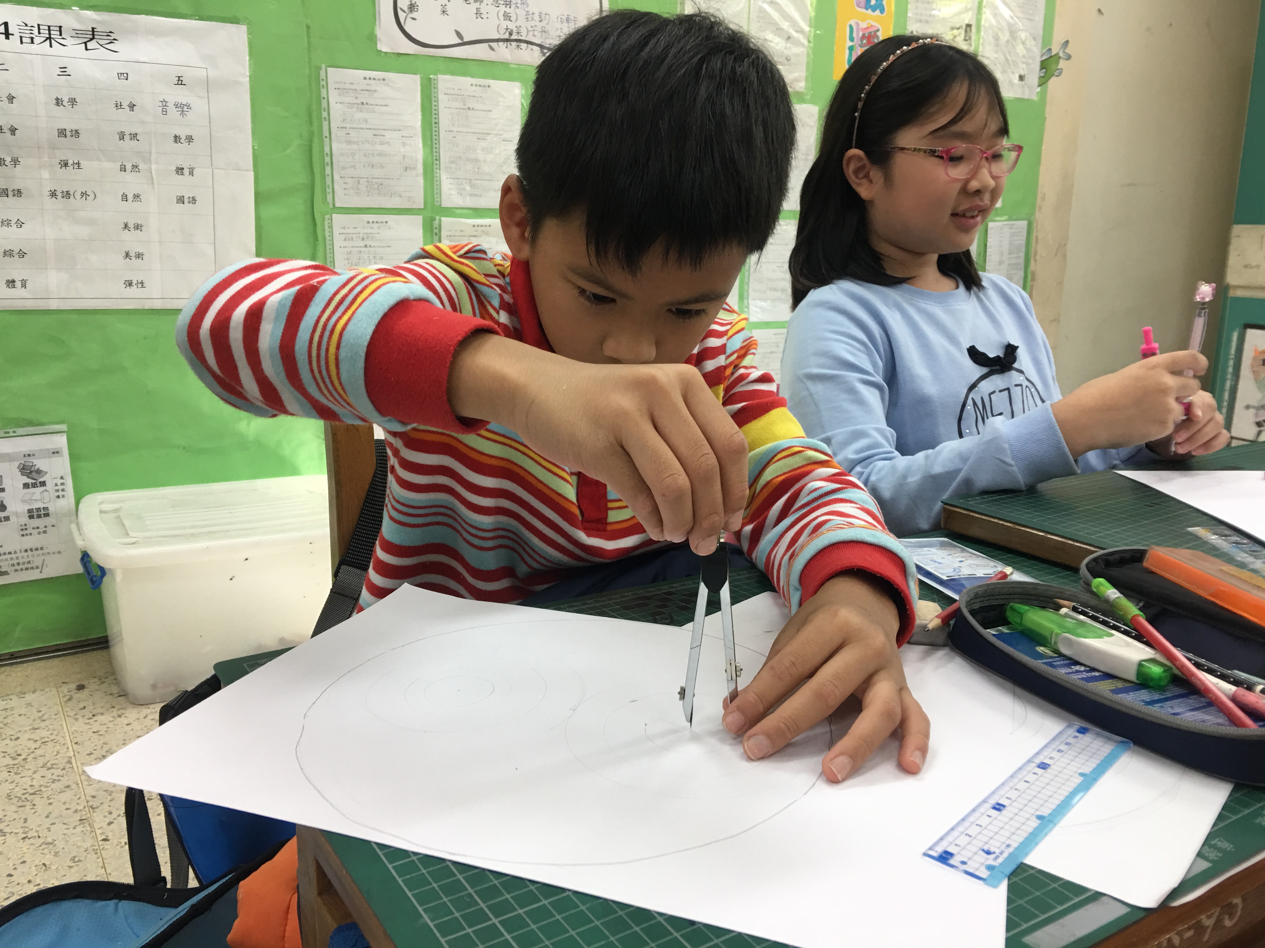 三年級數學領域進入圓與角單元,學生們第一次用圓規畫圓,覺得既新奇又有趣,有些孩子已經拿著教室的回收紙用圓規創作,於是老師將數學領域結合藝術與人文領域,來場圓規創作,孩子們畫著一個一個大大小小的圓,加上巧思變成各種圓形圖案:有花朵、電扇、星球......真是令人驚艷呢!