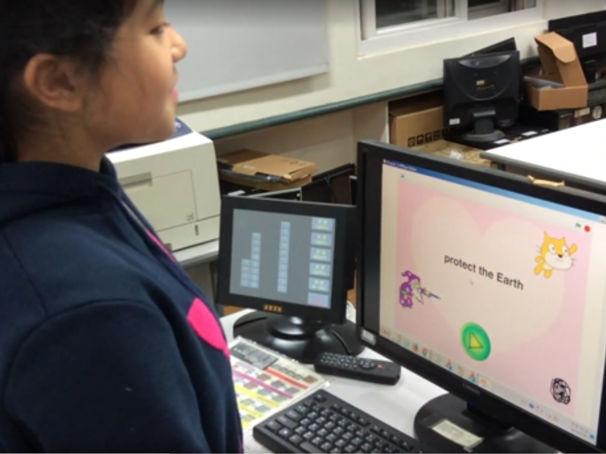 在2019年1月16日最後一堂課的作品中,在一片設計遊戲的男同學中,比較特別的作品是林同學以女生的角度,設計宣達環保愛地球的動畫,在培養邏輯運算思維的能力同時,也展現了諾丁斯關懷倫理學中對於環境的關懷心。