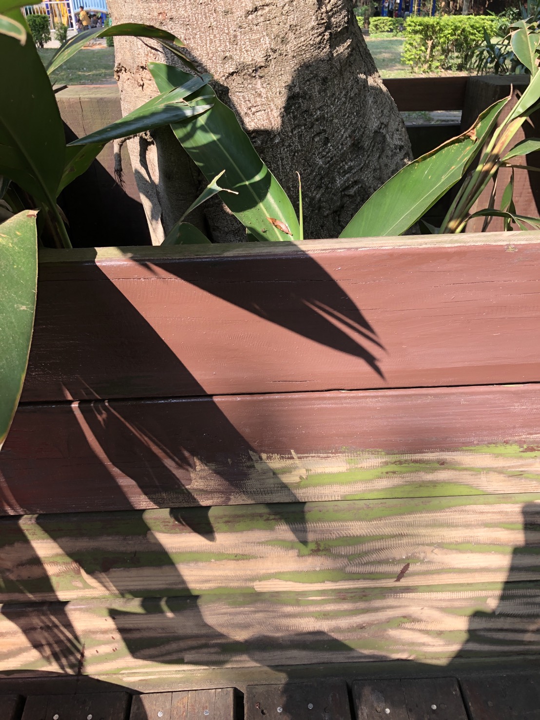 本校設校已經16年,校園生態區圍繞著大樹設置的木椅除了已經木條剝落又重釘好幾回之外,外漆顏色也剝落斑駁。