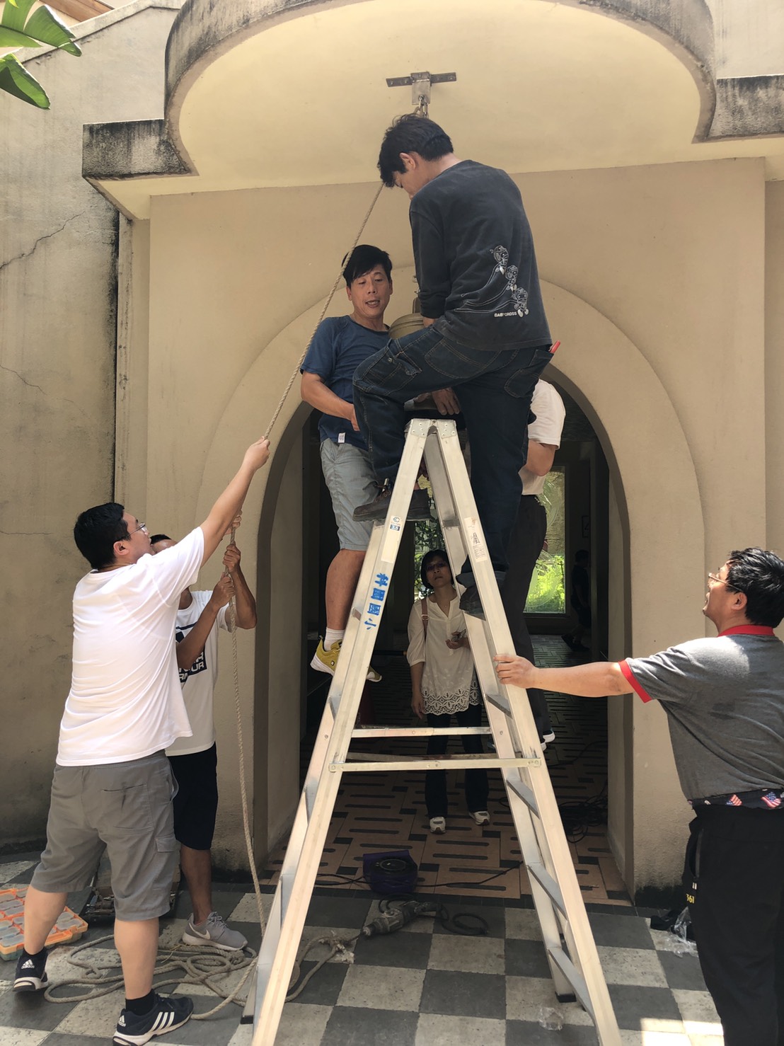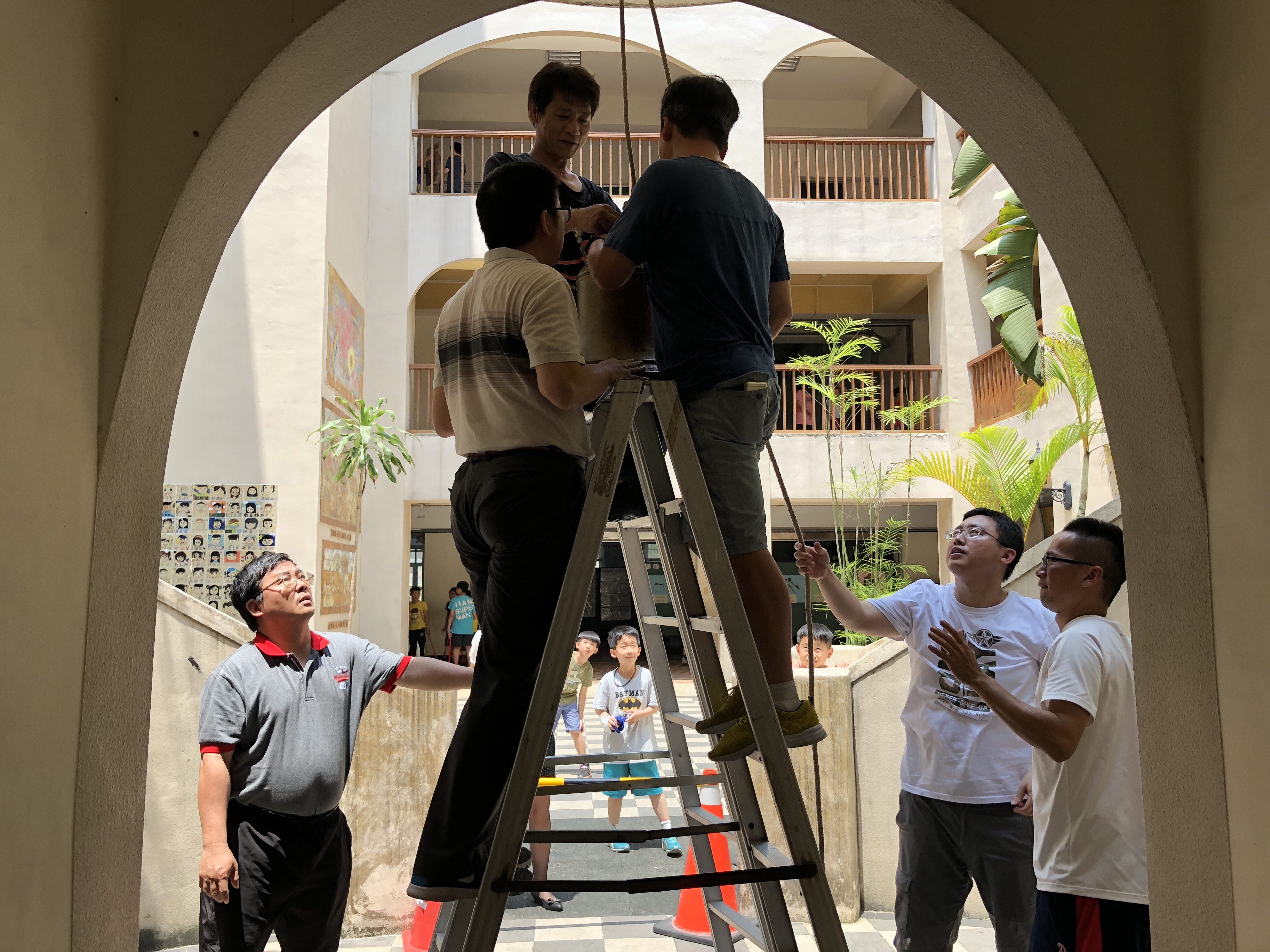 由於感恩鐘由重達將近50斤的銅體鑄造而成,裝設時本校王校長、輔導主任、學務主任、生教組長、事務組長及警衛鍾先生都輪番上陣協助感恩鐘的裝設,在眾多人合力之下,終於完成母親節感恩鐘的裝設,讓科園國小校園頓時增添栩栩如生的書香校園情懷,更期待母親節活動時,悠揚悅耳的感恩鐘聲響起,傾訴孩子們的感恩之情。