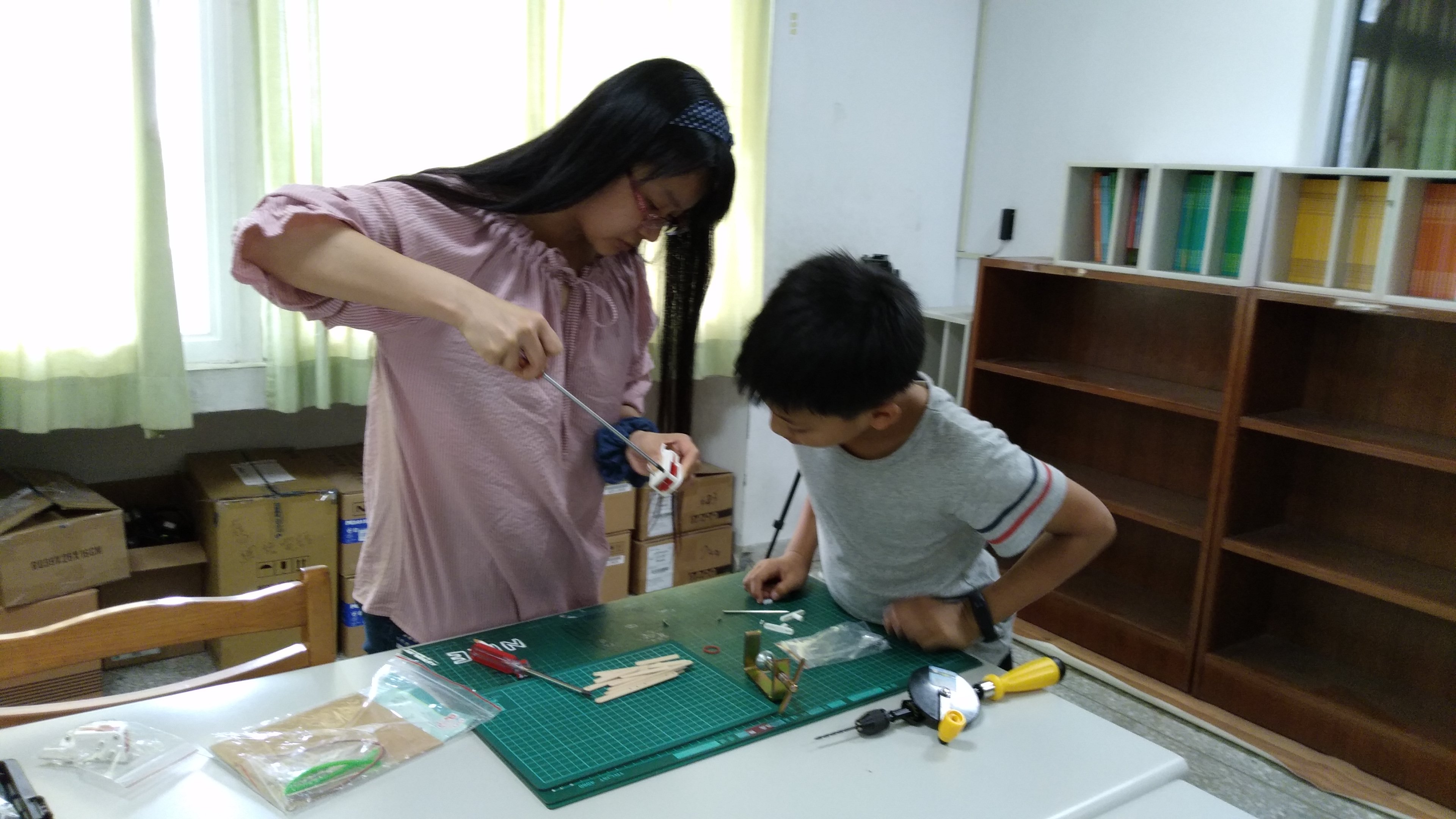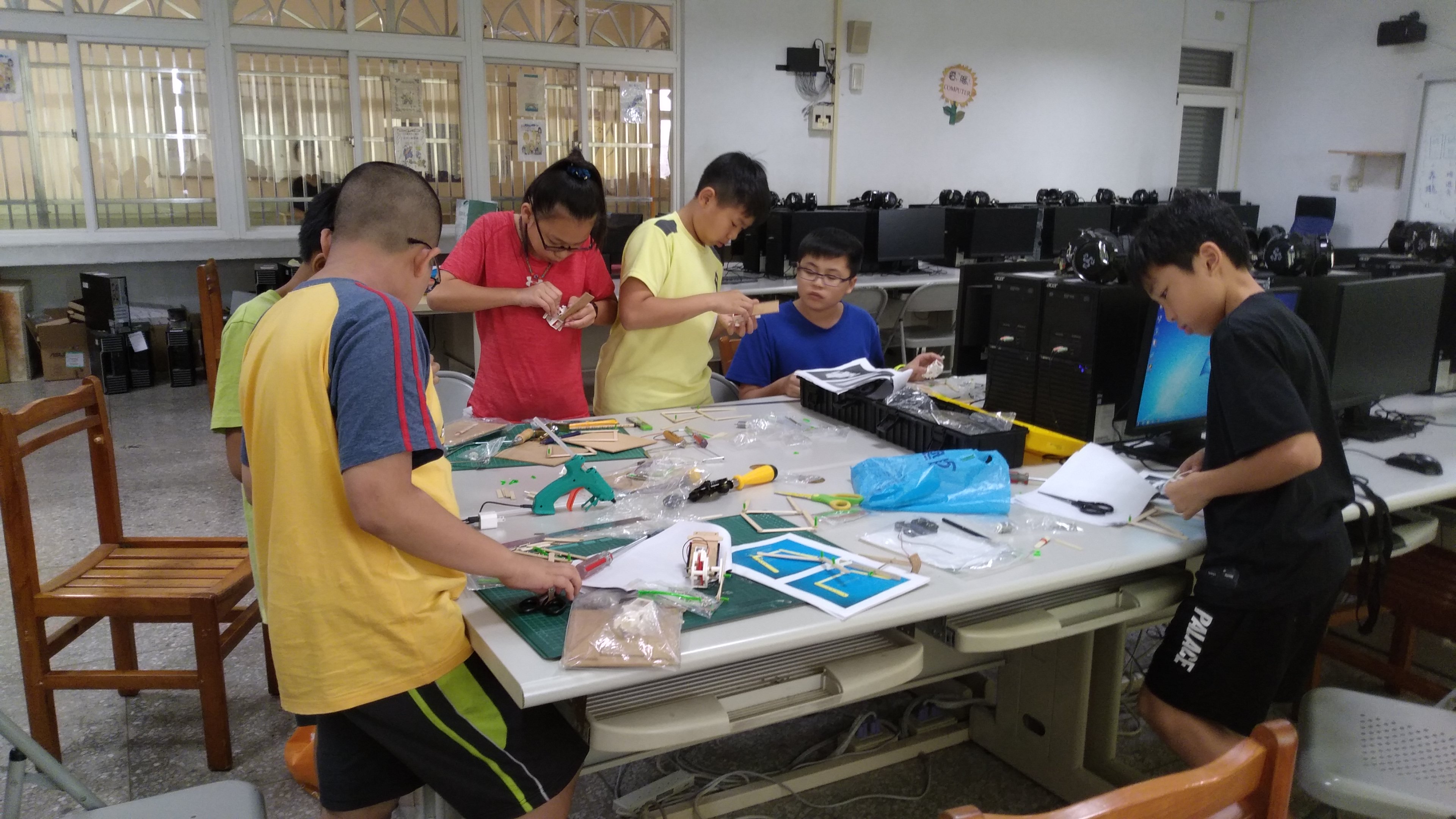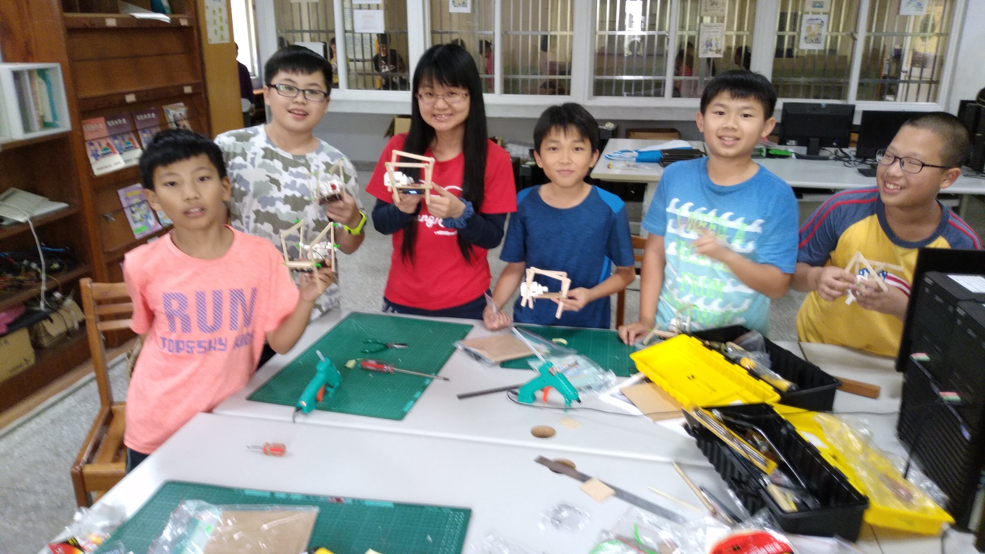 詠琳老師利用午休時間,為期兩個多月帶領感興趣的六年級孩子,一起玩百變機器人,從一片木心板、幾根冰棒棍、一堆螺絲釘…..開始,孩子們學會了手線鋸、手搖鑽、螺絲起子、熱熔槍、電烙鐵、C型夾、尖嘴鉗…等的使用,也學會了齒輪與馬達的組裝,瞭解了機器人傳動之原理,更利用切割、鑽孔、接合、電熔…等方法,動手實作將機器人(齒輪組、馬達、底座、冰棒棍前後腳…)組裝完成。