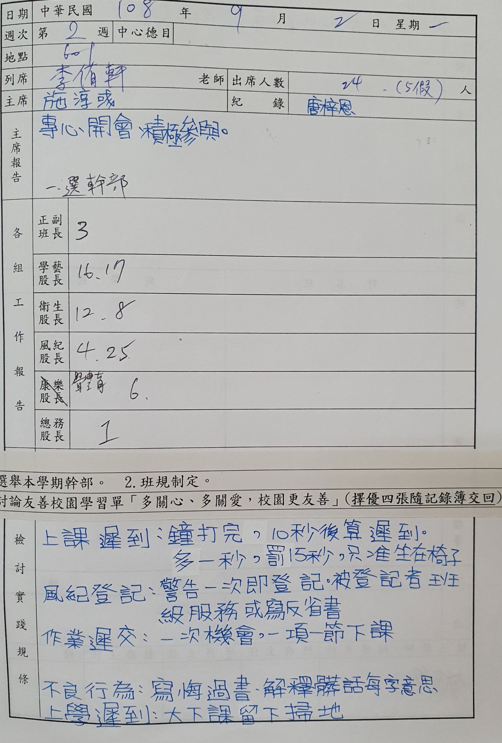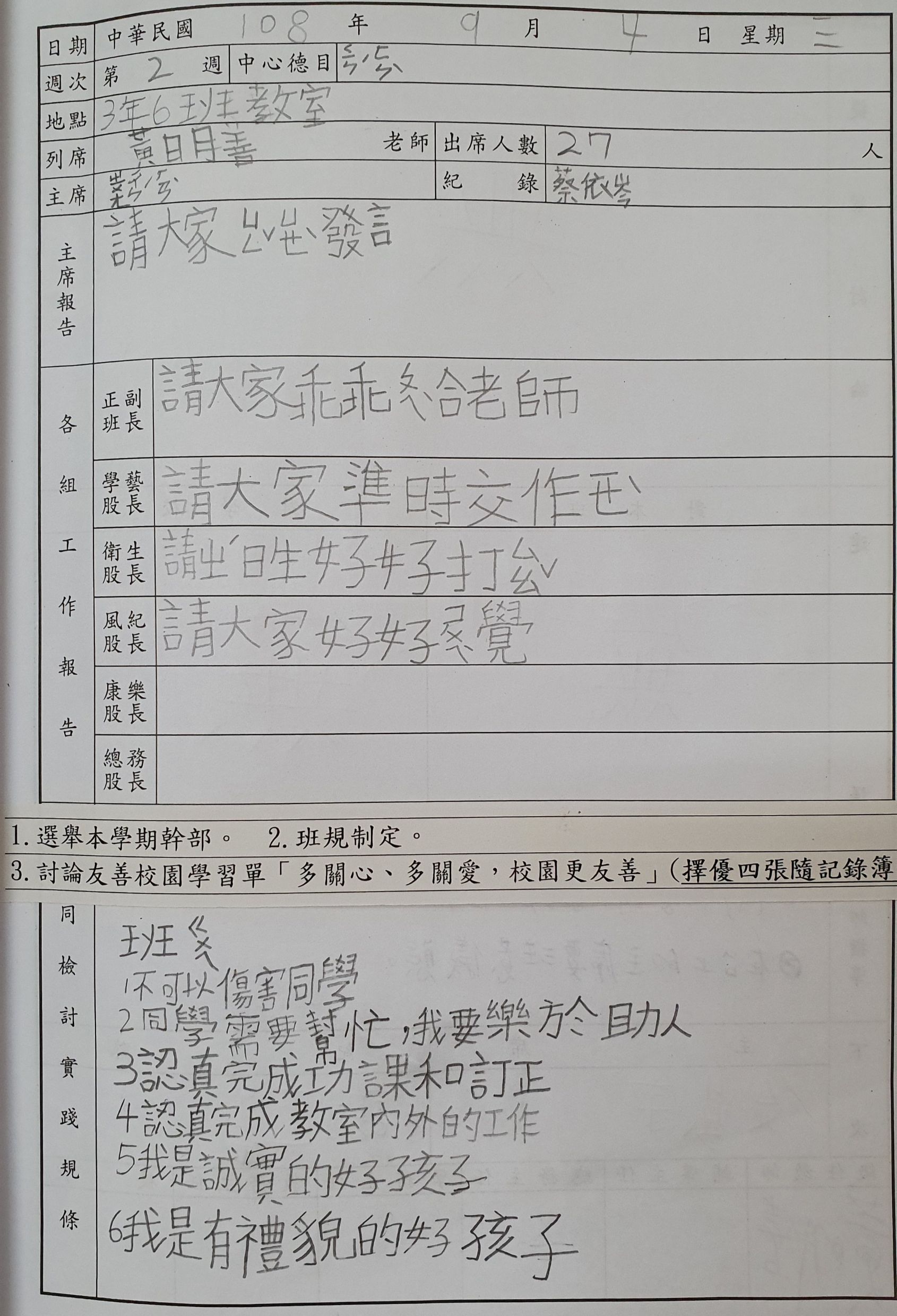 本次為108學年度第一次班會之召開,配合剛開學之九月初,以選舉各班幹部及訂定各班生活公約為重要討論之法治相關議題。此外,更利用這全班集合之時間,增列友善校園週之討論,並配合學習單撰寫,供師生討論並分享,達到落實和宣導之目的和最佳方式。