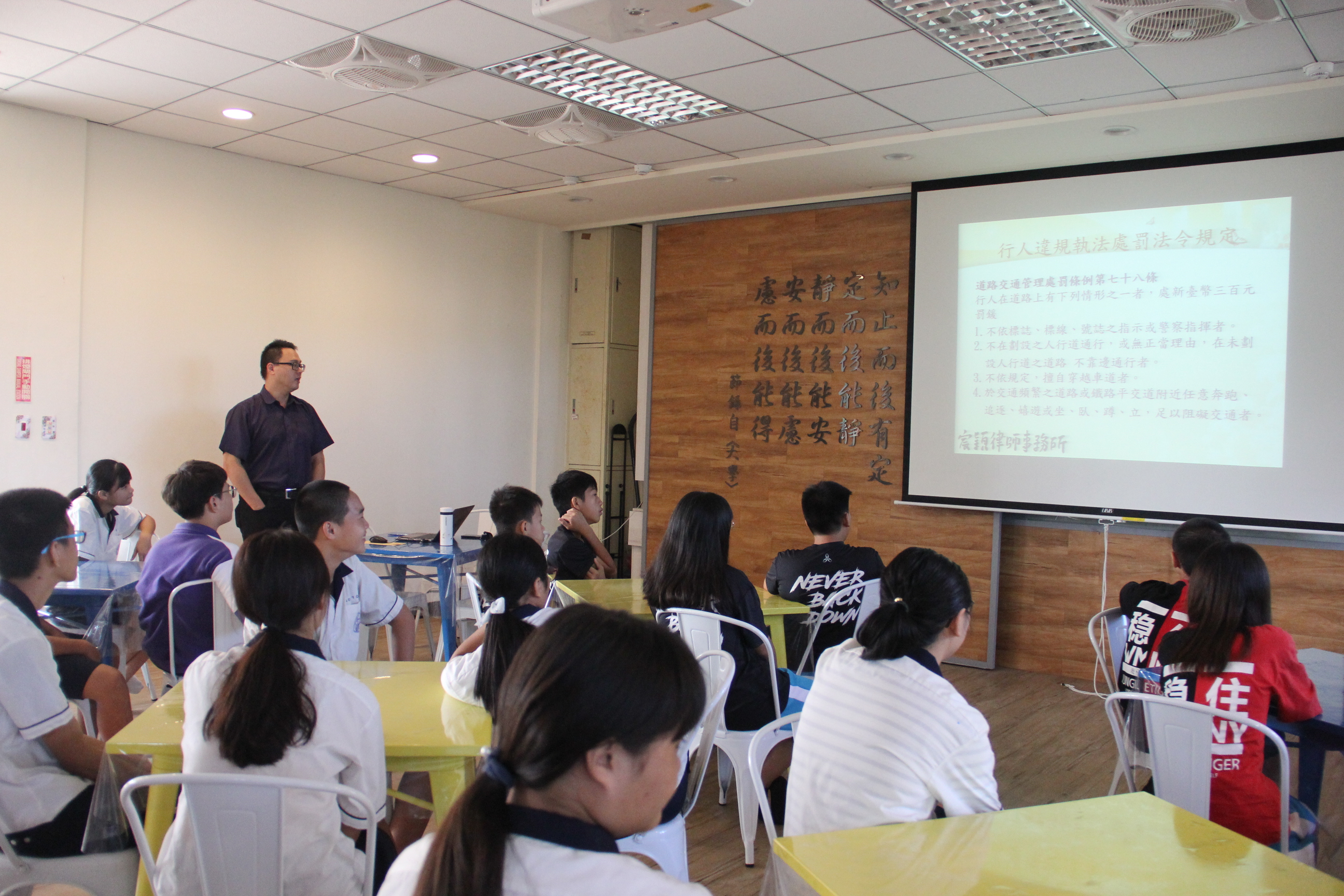 為落實校園民主自治,培養學生守法、守秩序、自我管理的態度,並訓練交通糾察隊學生執勤要領。本校於108年9月12日,辦理學生交通糾察隊培訓研習,特請李典穎律師到校演講,為20位八、九年級糾察隊學生們上課,李律師先以常見的國中生交通意外事件開頭,結合其在律師的工作上所接觸的個案向學生說明,也以交通安全影片探討相關法律責任,學生們認真聽講學習,也能深刻體認到交通安全的重要。