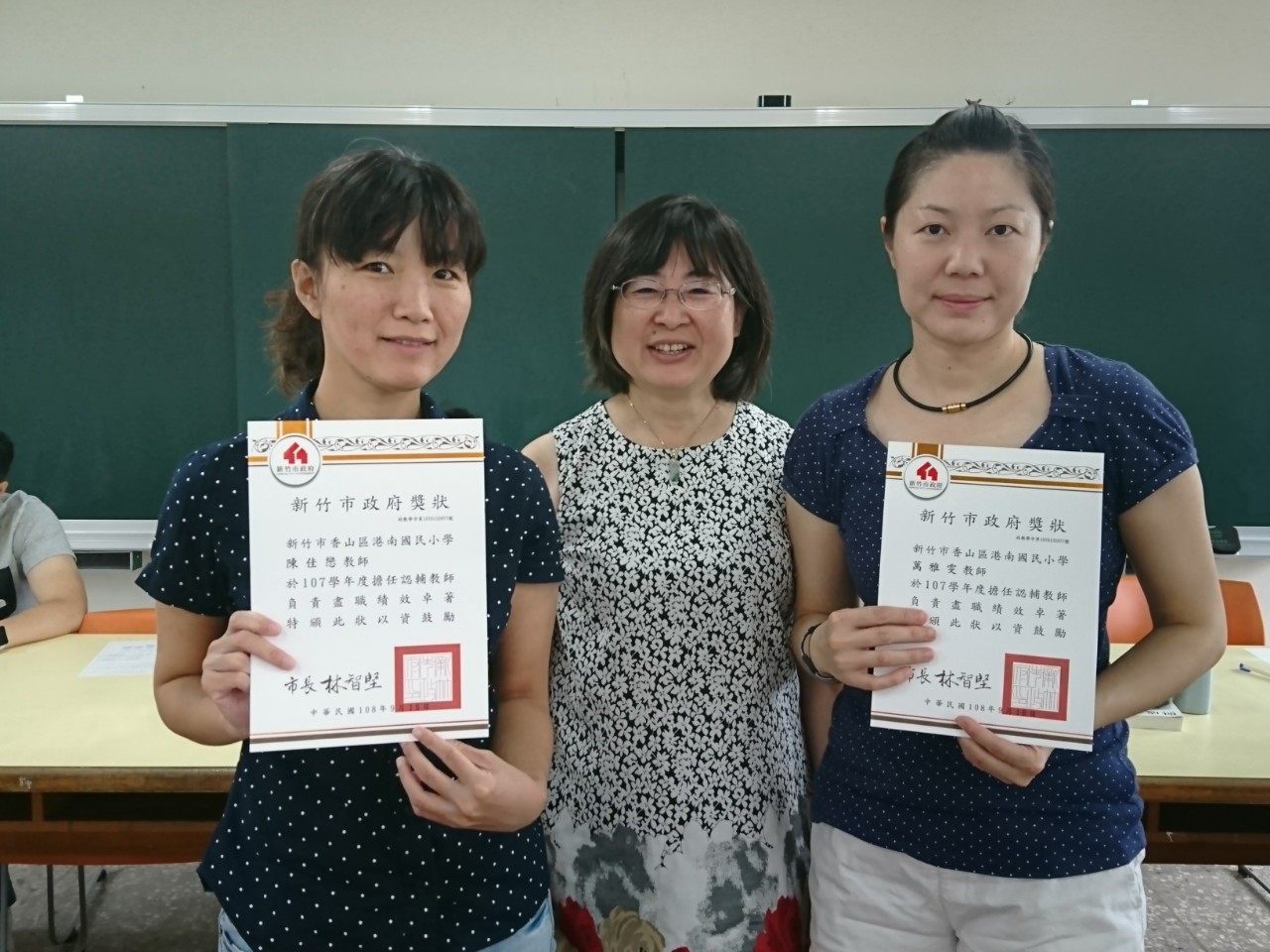 108.09.17 本日教師晨會由麗雲校長親自頒獎給本校107學年度認輔教師-雅雯老師及佳戀老師。新竹市政府特地頒發此獎感謝老師負責盡職 績效卓越,為孩子們盡心負責!