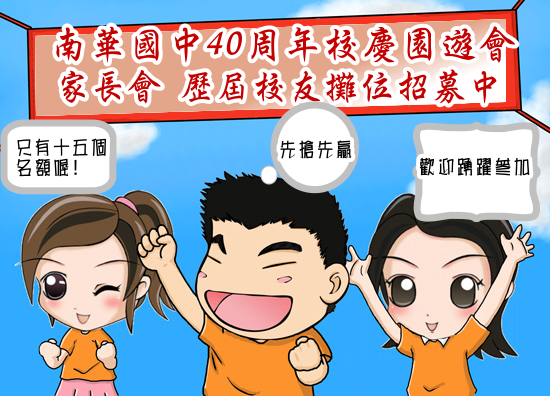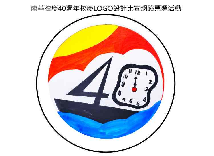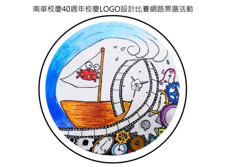 創作理念:由帆船和時鐘代表「40週年」,船上的帆布有著南華的吉祥物(螃蟹),而在時鐘上,校徽則分別代表了「時」針、「分」針和「秒」針。下面的齒輪是時光的象徵,上面的波浪是代表我們在海邊的快樂活力,整個表現了開心活潑,就是南華的象徵。