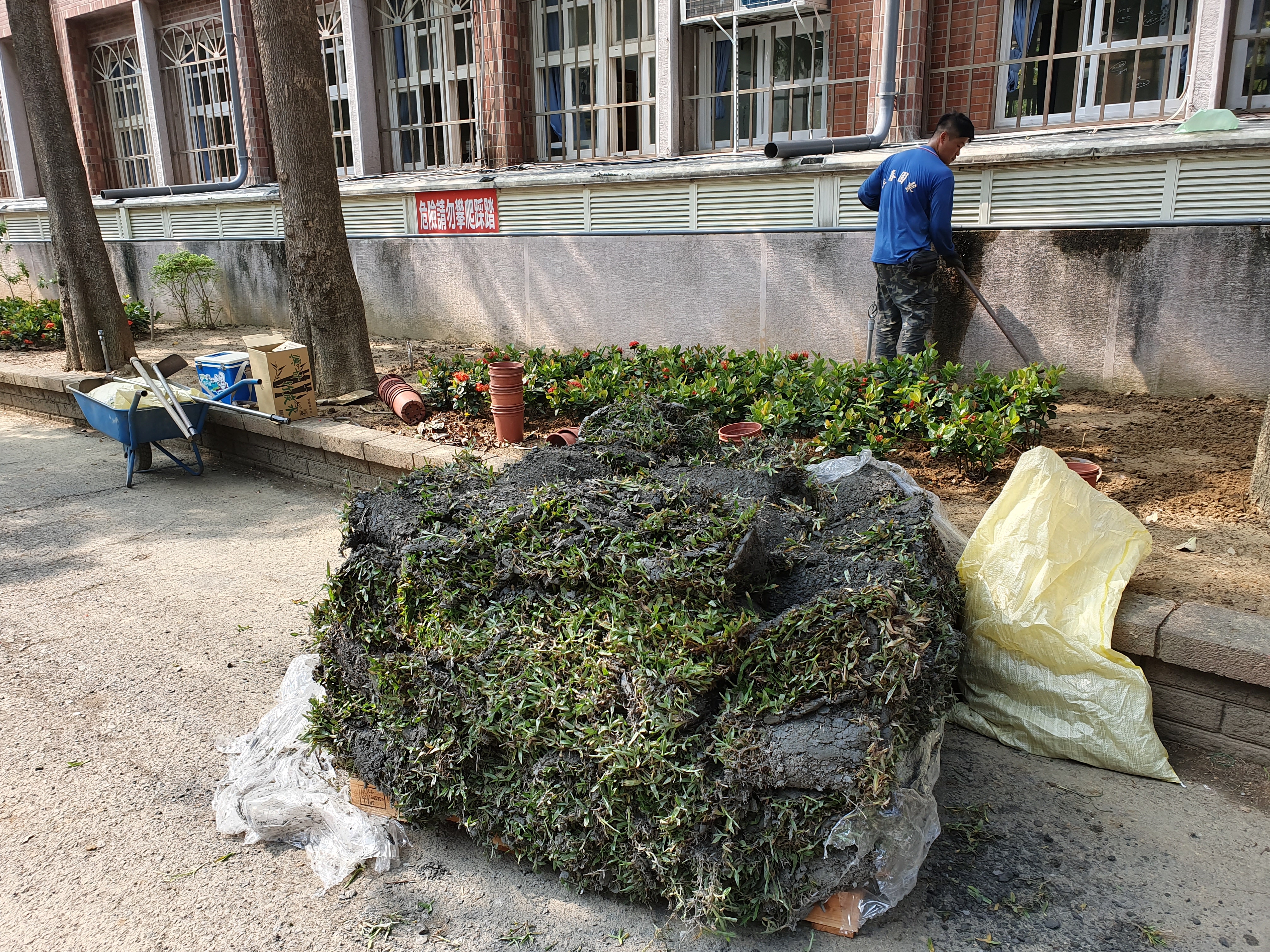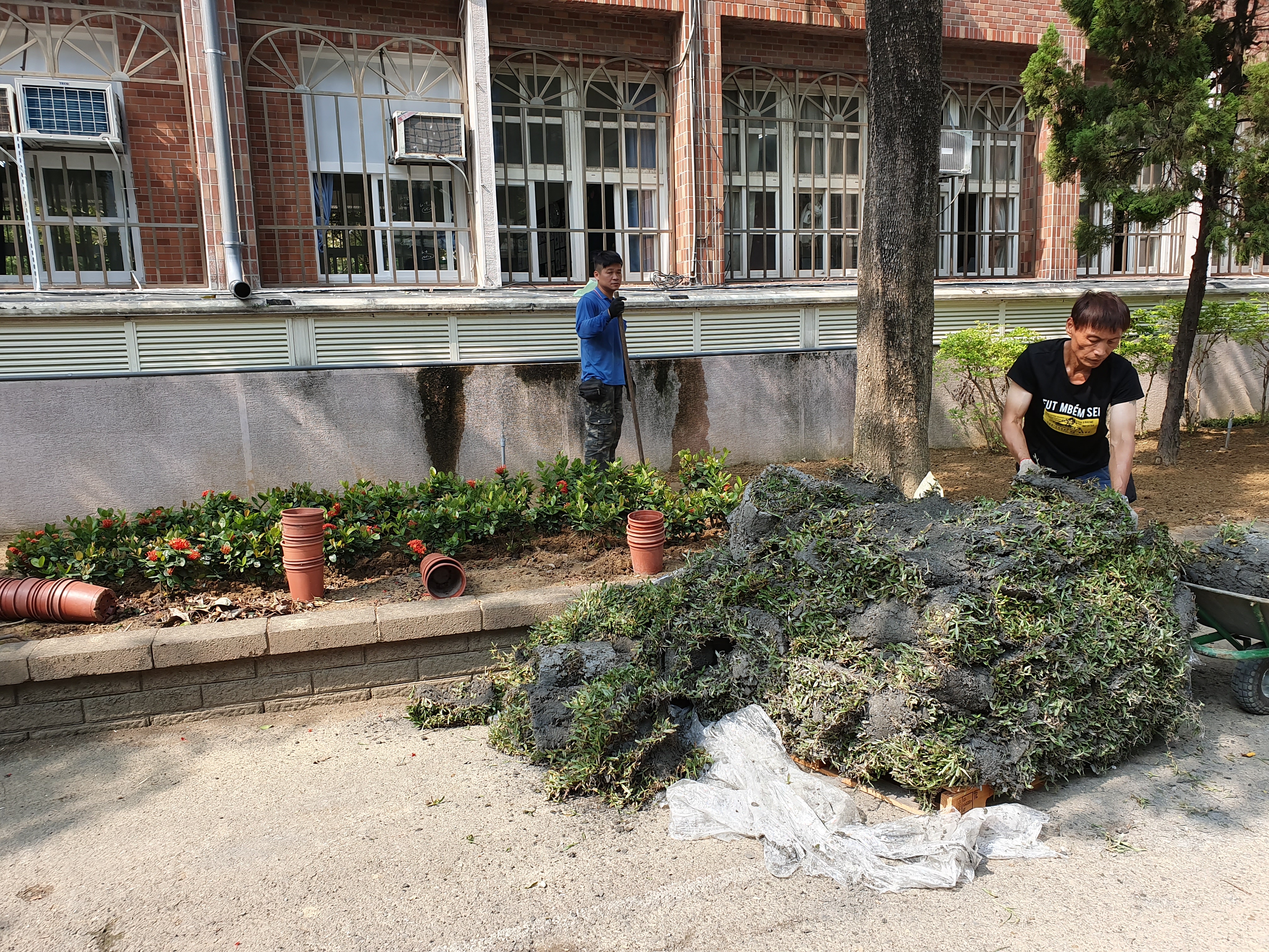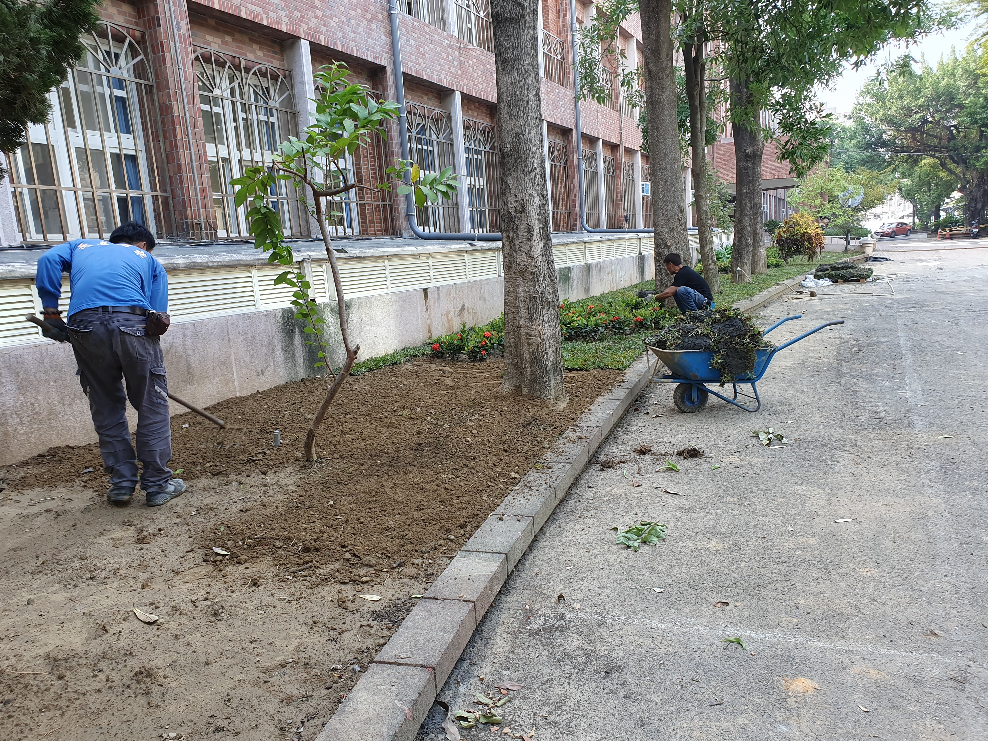 此次西大路校門兩側花圃綠美化,首要工作就是將原有泥土全部更新,然後重新規畫花圃,再種植上便於維護的植栽「熊貓仙丹」、「地毯草」,以減輕目前服務人員人力不足的工作負荷。