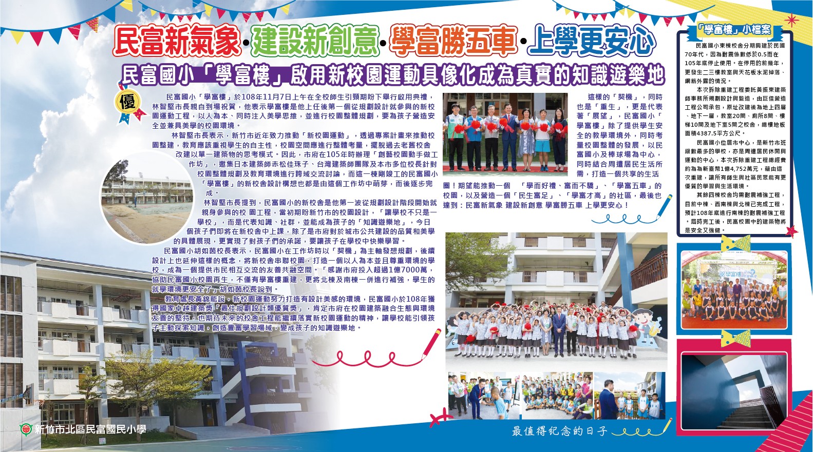 108年10月7日是民富國小最值得紀念的日子,這一天是我們東棟校舍拆除重建「學富樓」落成剪綵的大日子,我們把這一天的喜悅祝福與歡欣鼓舞,用校園布置保存在校園的角落裡,希望大家共享我們這歷史的一刻。