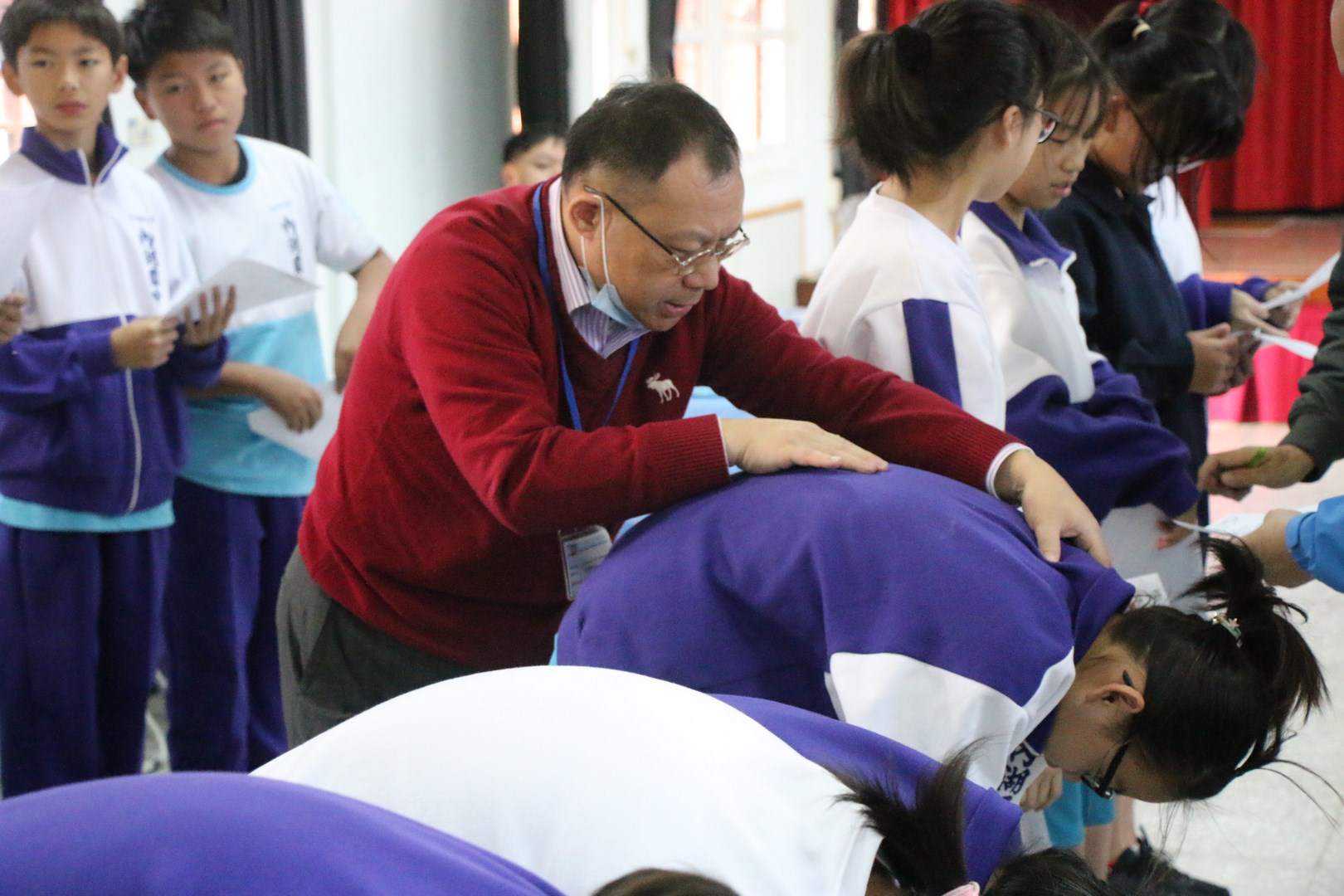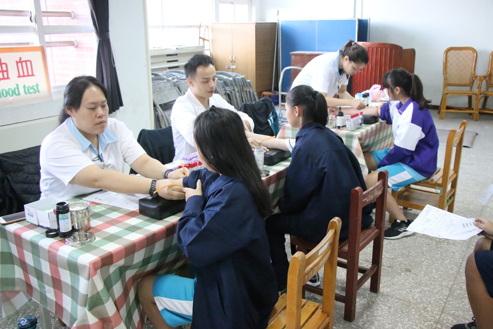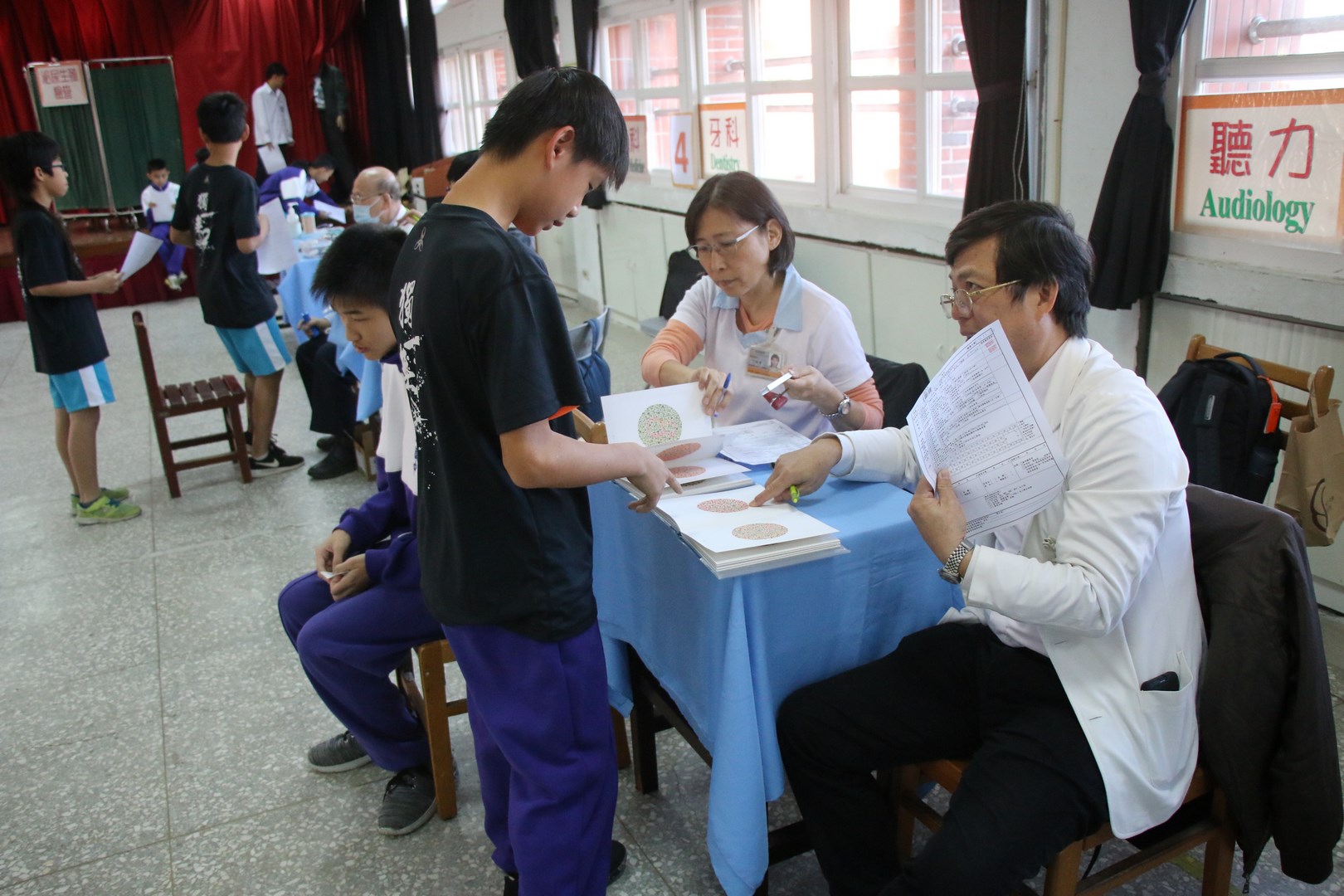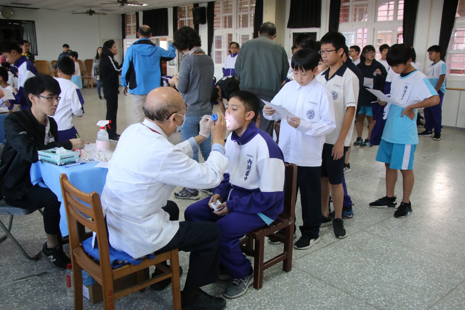 本校108年11月20日早自修於3F小禮堂辦理108學年度國一新生健康檢查,一開始新生雖懷著忐忑不安的心情前往受檢,但是在學務處老師們及各班導師的陪伴引導,以及前來協助健檢工作的醫生叔叔與護士阿姨們愛心與耐心的溫柔對待下,七年級所有同學們皆井然有序、很順利地完成整個健康檢查的流程。