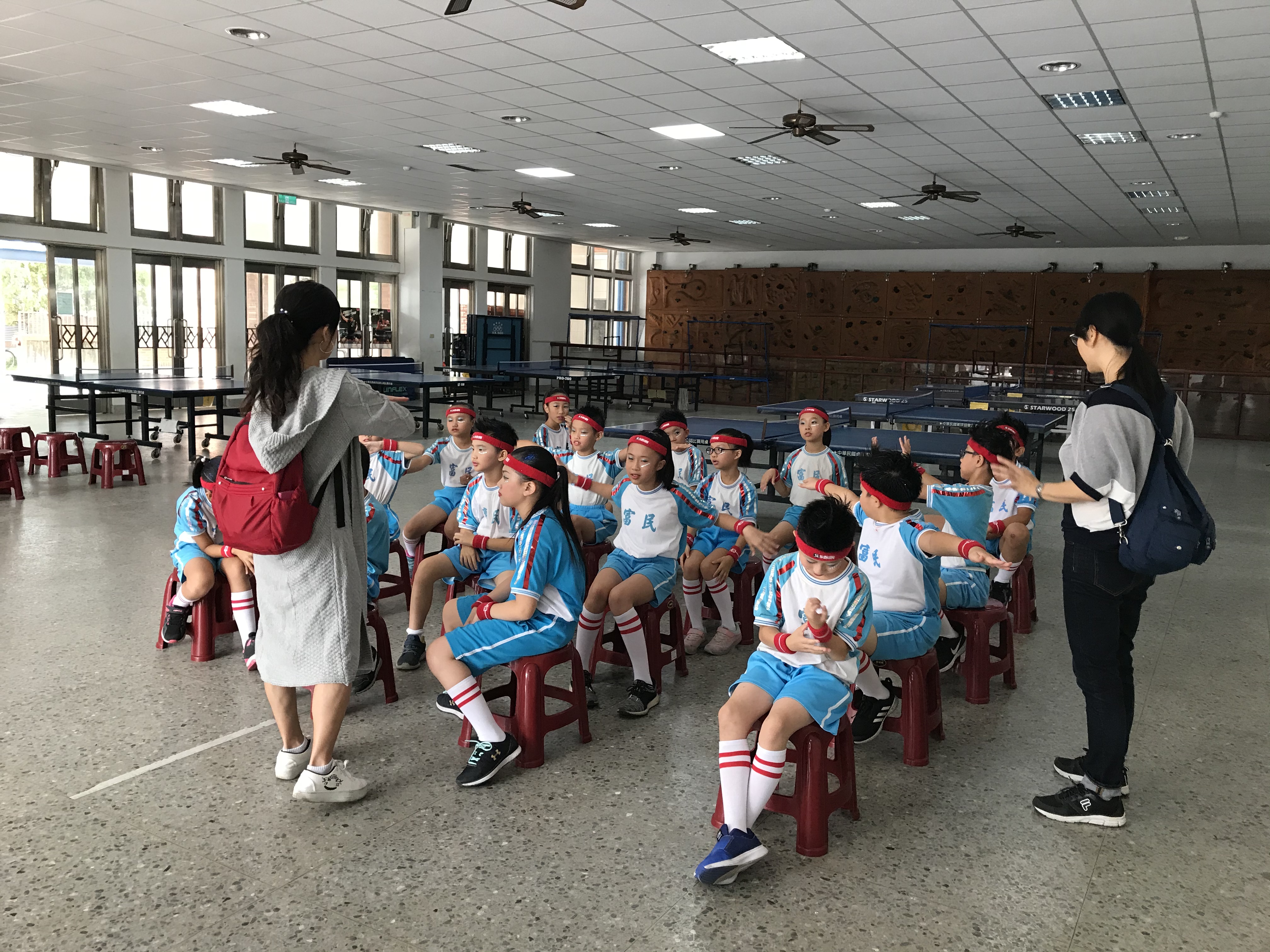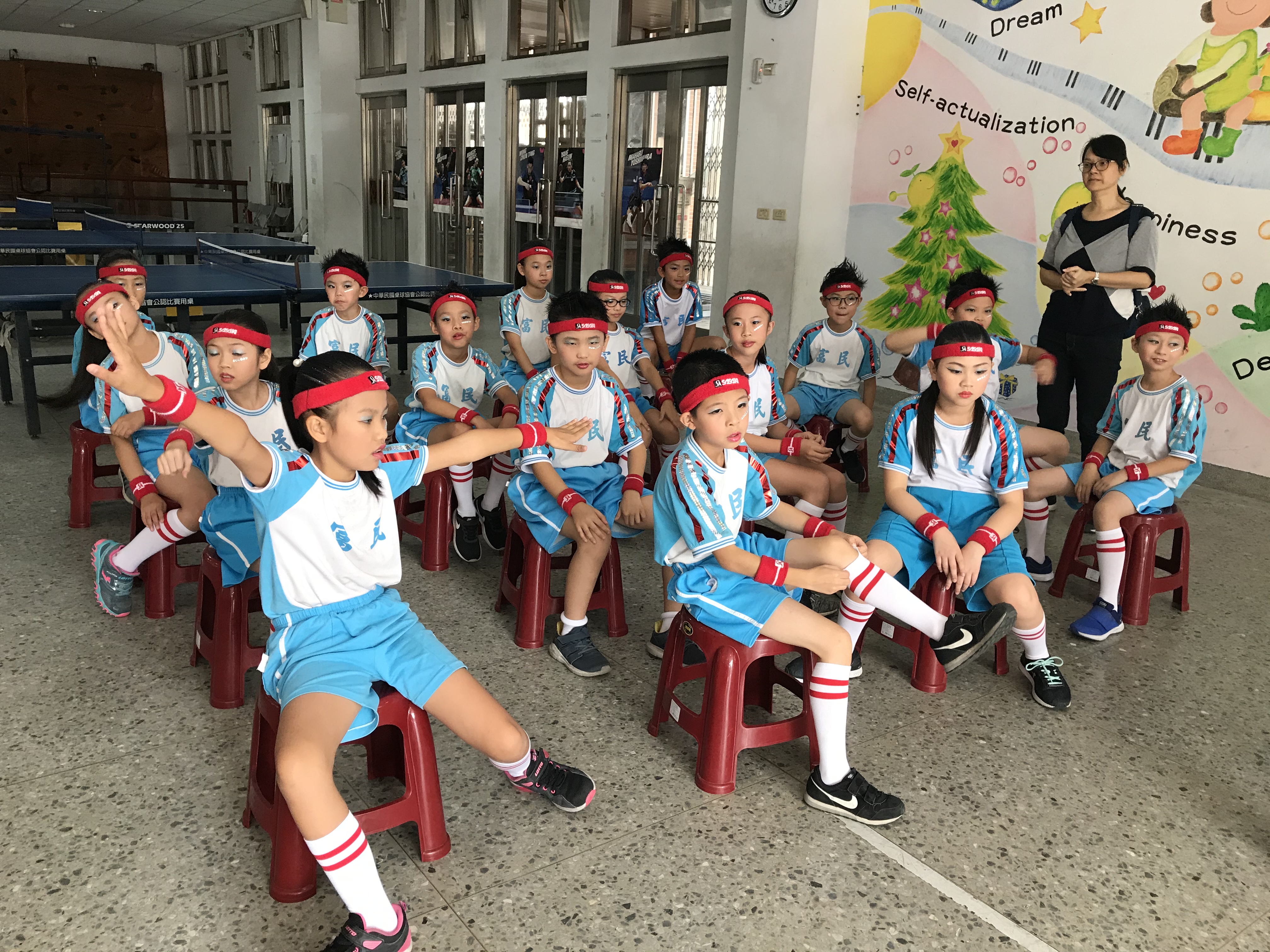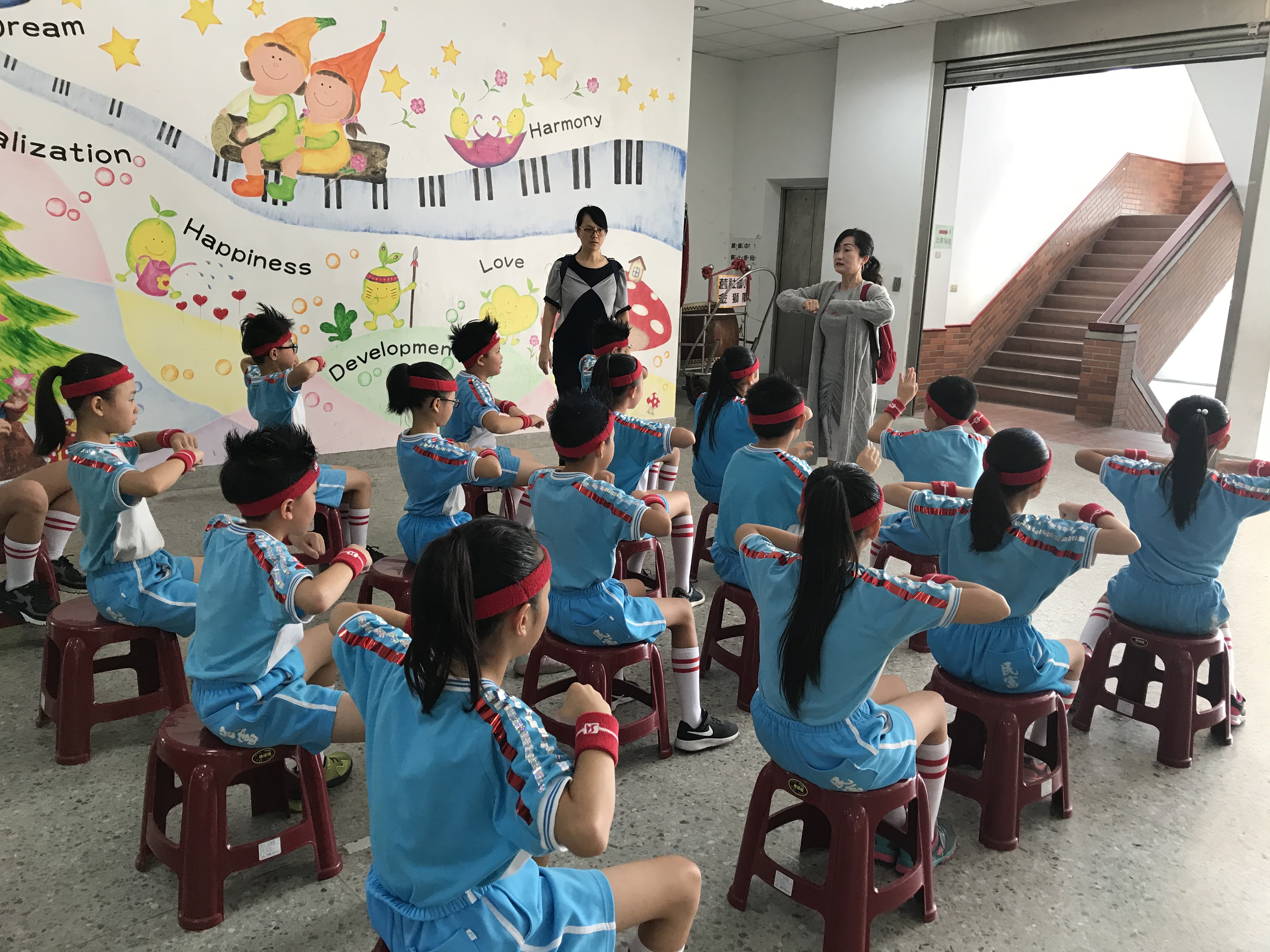 教育部體育署108學年度第十一屆中小學生普及化運動/四年級健身操新竹市複賽,本校四年八班的孩子們,在慧菁老師與國玓老師的帶領之下已摩拳擦掌蓄勢待發準備上場。上場前,國玓老師再次細細叮嚀需要注意的動作,孩子們滿懷期待,希望承接昨日三年級第一名的氣勢再創佳績!