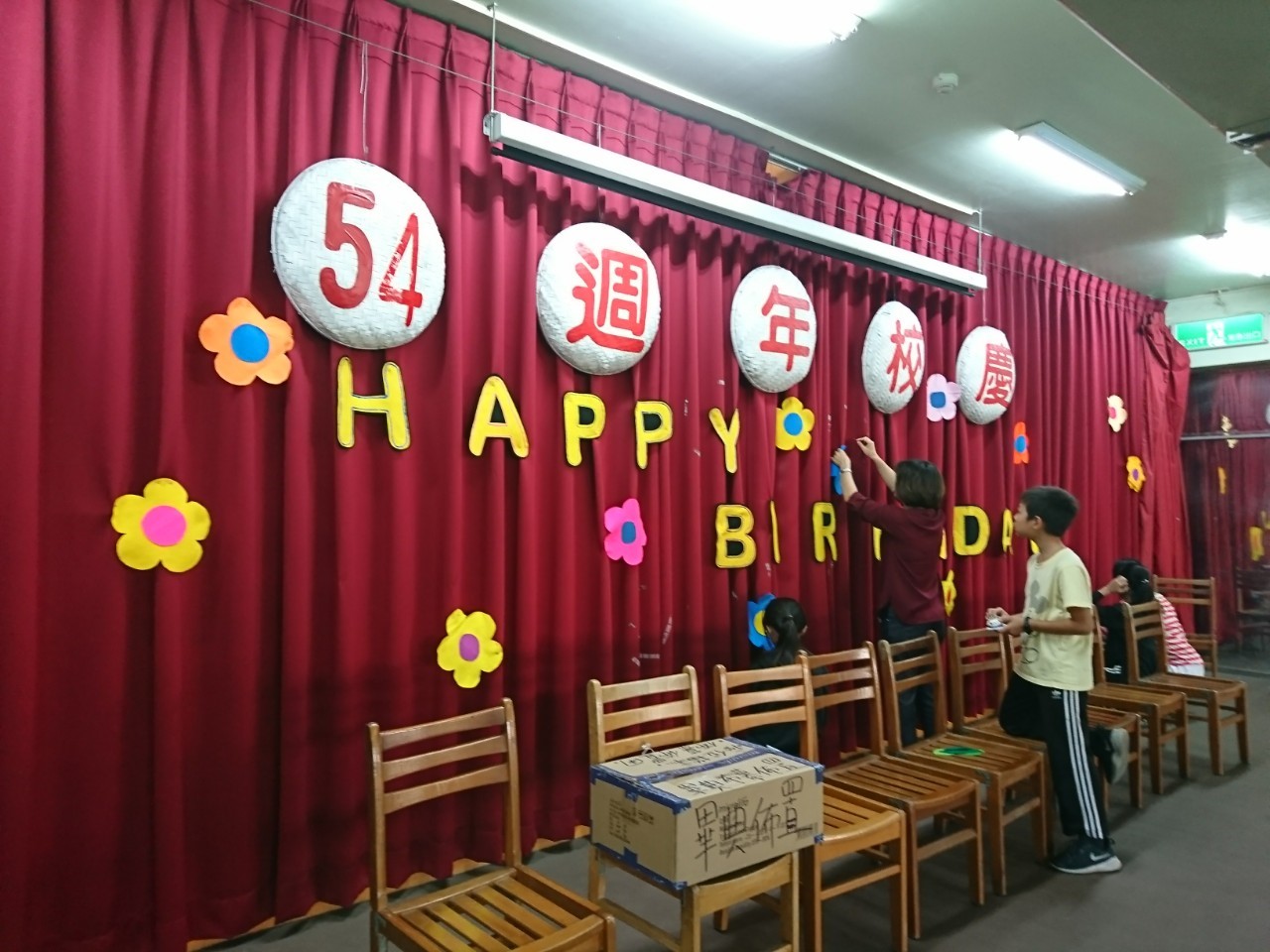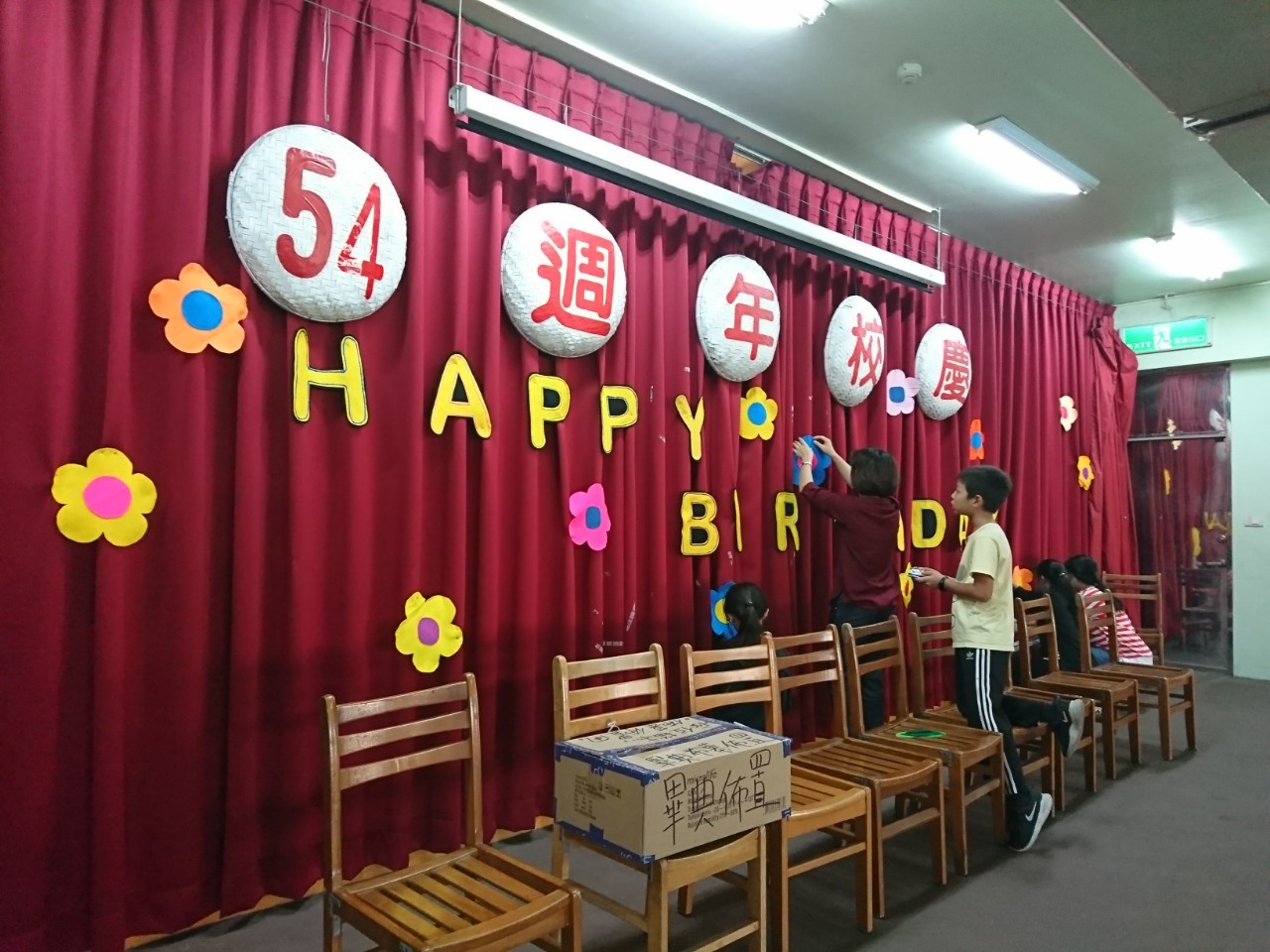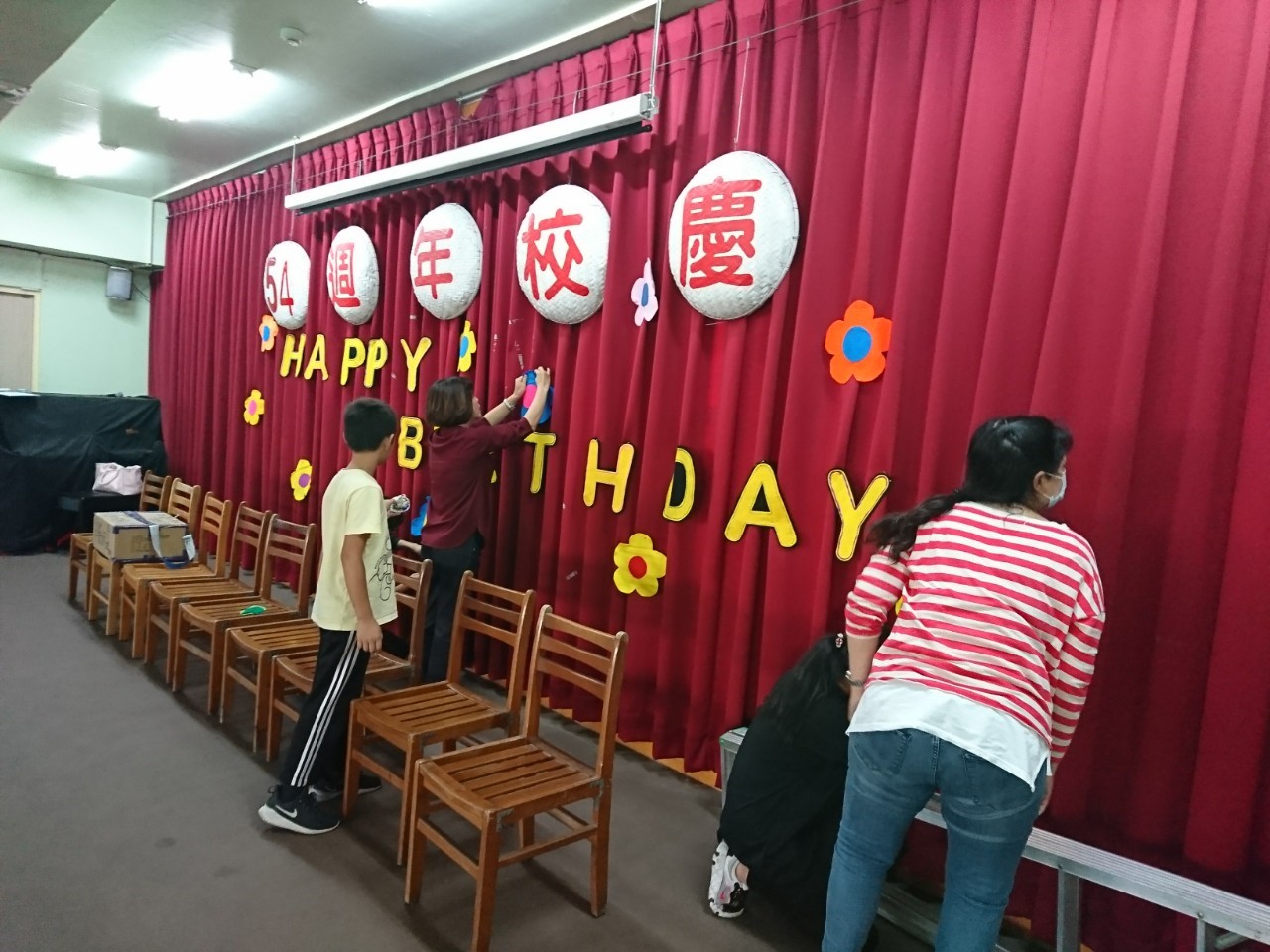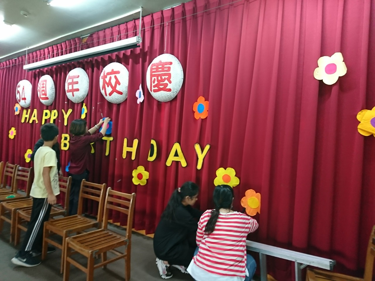 為迎接54周年校慶運動會,港南團隊均奮力表演並且動手進行各項布置。在今日下午,由教務處 琦崴主任、怡青老師帶著六年級的學生們共同在體育館內進行布幕的布置作業,以不織布裁剪成美麗的英文字型並搭配可愛的花朵,共同為54周年校慶活動開始進行慶祝準備!