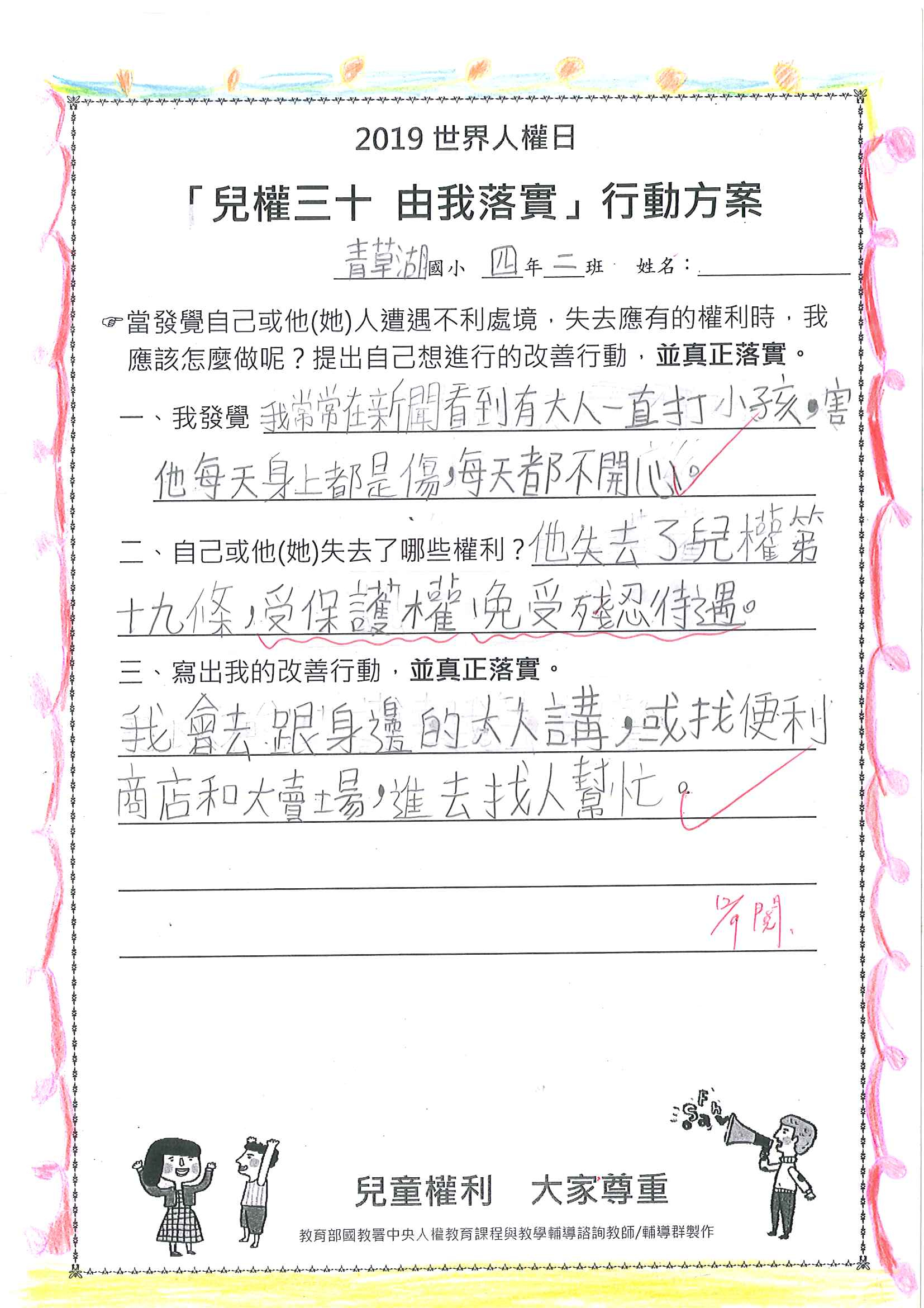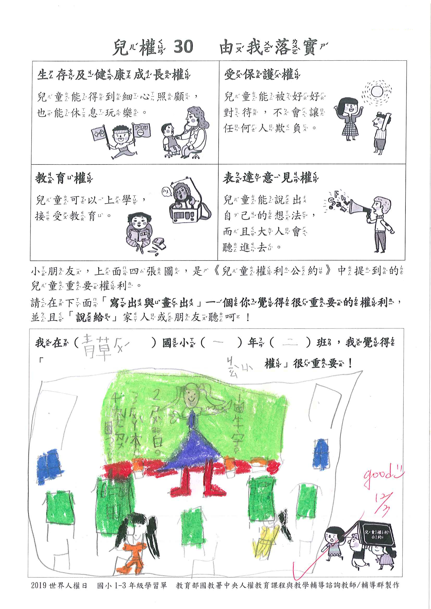 除了上課踴躍的發言、認真地聆聽以外,孩子們在教學後的成果表現也非常優異。透過繪畫的方式,能夠讓1到3年級的孩子理解基本兒權的四大權利--生存及健康成長權、受保護權、教育權、表達意見權,孩子們也用他們自己的語言與方式表達出自己認為最重要的權利。而在4到6年級的課堂中,孩子除了能逐條解釋兒權公約的幾項重要條例外,更能設身處地的為故事中的主角設想、據理力爭其所喪失的權利,甚至還能針對兒童的權利提出行動方案,由此可見青小孩子看待兒權的重要性。