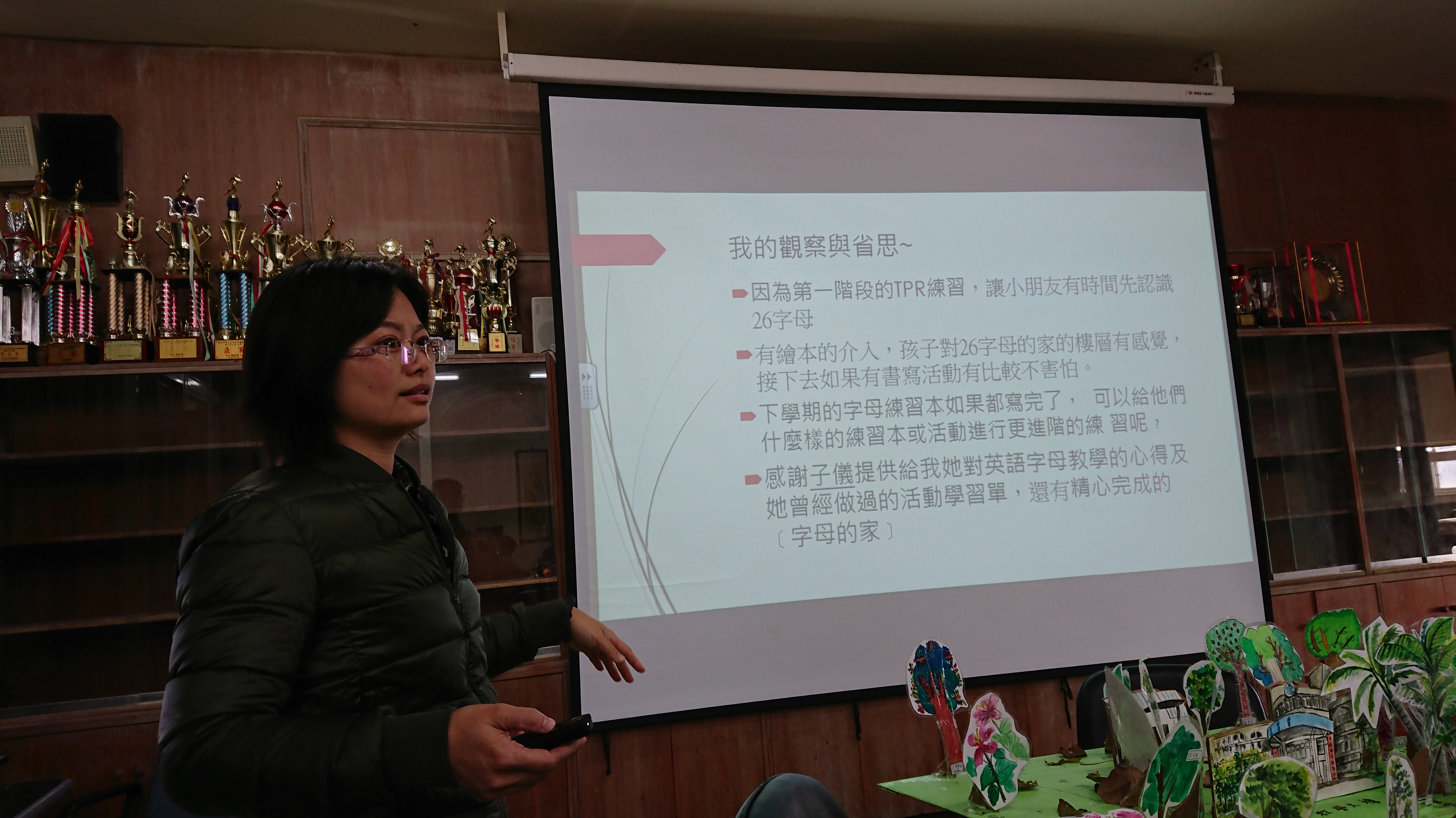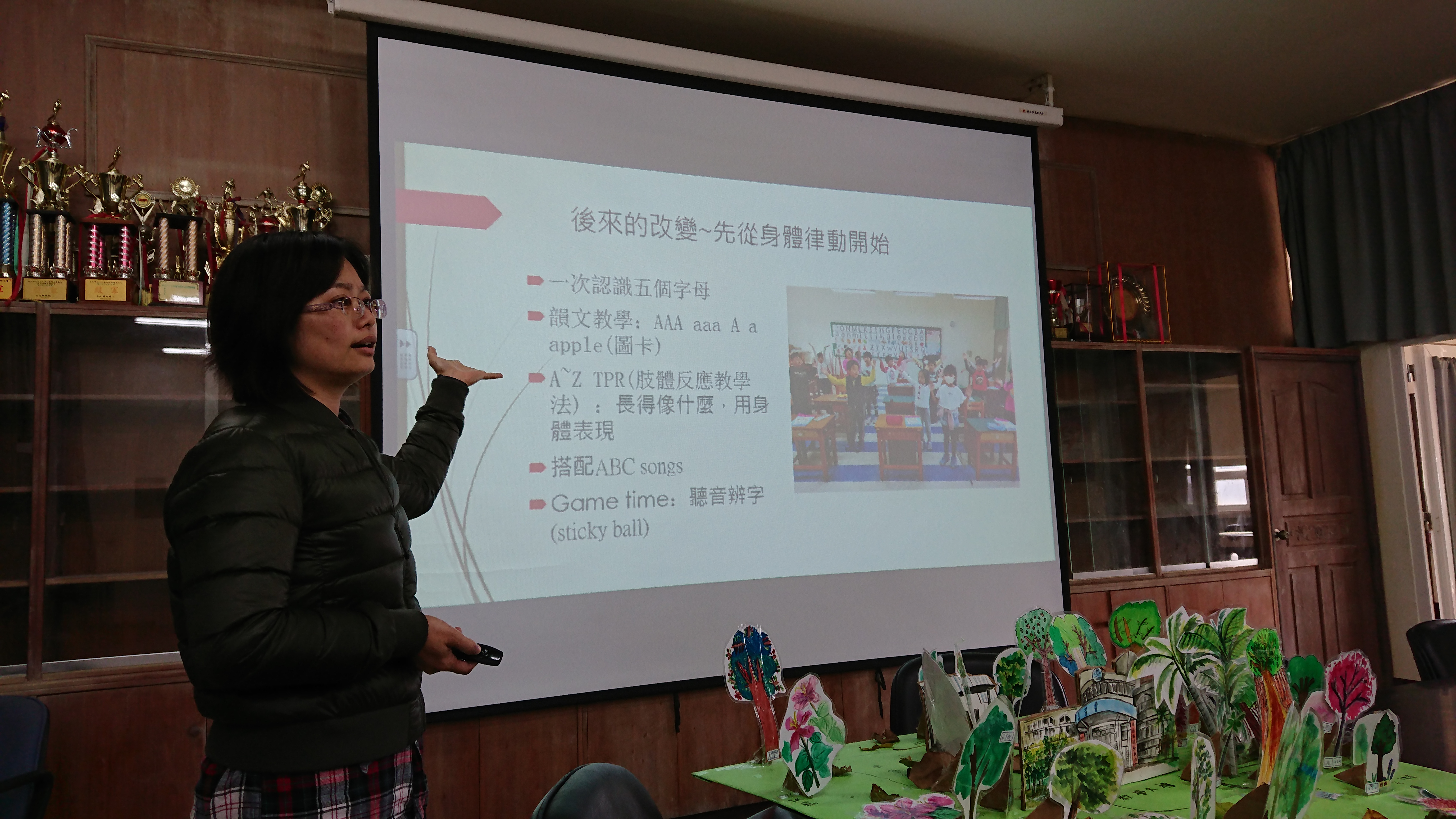 淑珍老師進行108課綱一年級在彈性學習「Fun遊世界」教學歷程,參考新竹市的英語課程內容及各校公開觀議課的經驗進行課程調整,一年級的小朋友也可以透過身體律動、故事引導、英語童謠教學、書寫練習,過程中與子儀老師共同討論低年級的學習樣態,也適時進行課程調整與補充,因應一年級兩班孩子的特質與能力需求,未來也將透過校內任教英語的教師群進行討論,可以建構出最符合朝山毎一年段孩子的英語課程能力指標或內容。