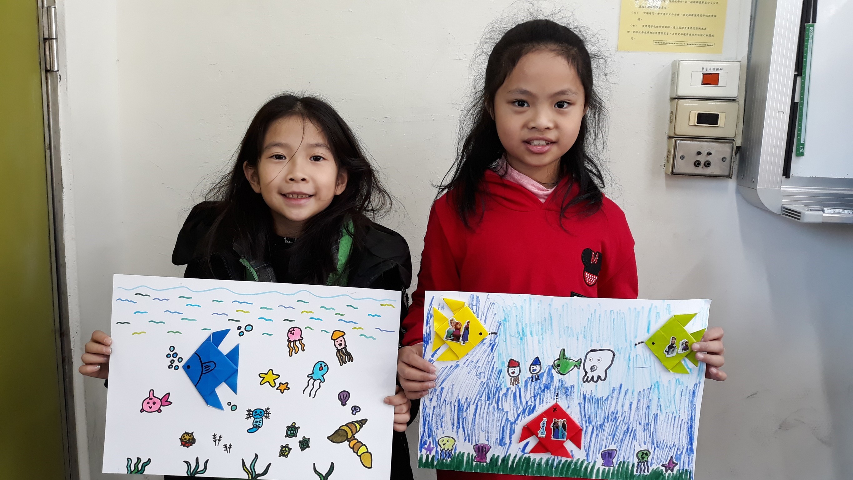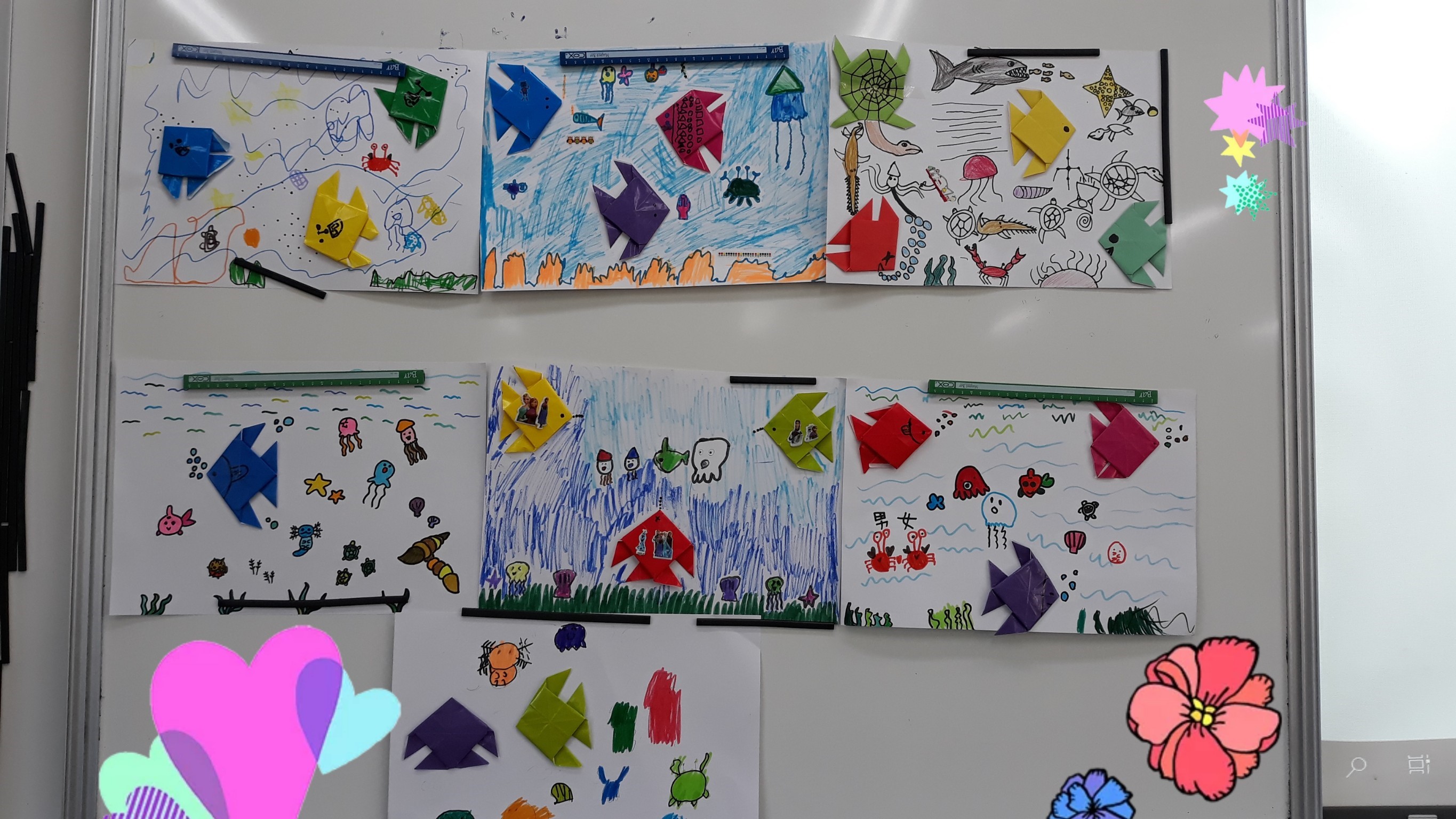活動中,先教孩子們摺出一隻隻可愛的小魚,緊接著貼在圖畫紙上,自己利用色筆等繪畫,分享他們所認識的海中生物並且畫出來,就這樣一幅幅美麗的海底世界圖。