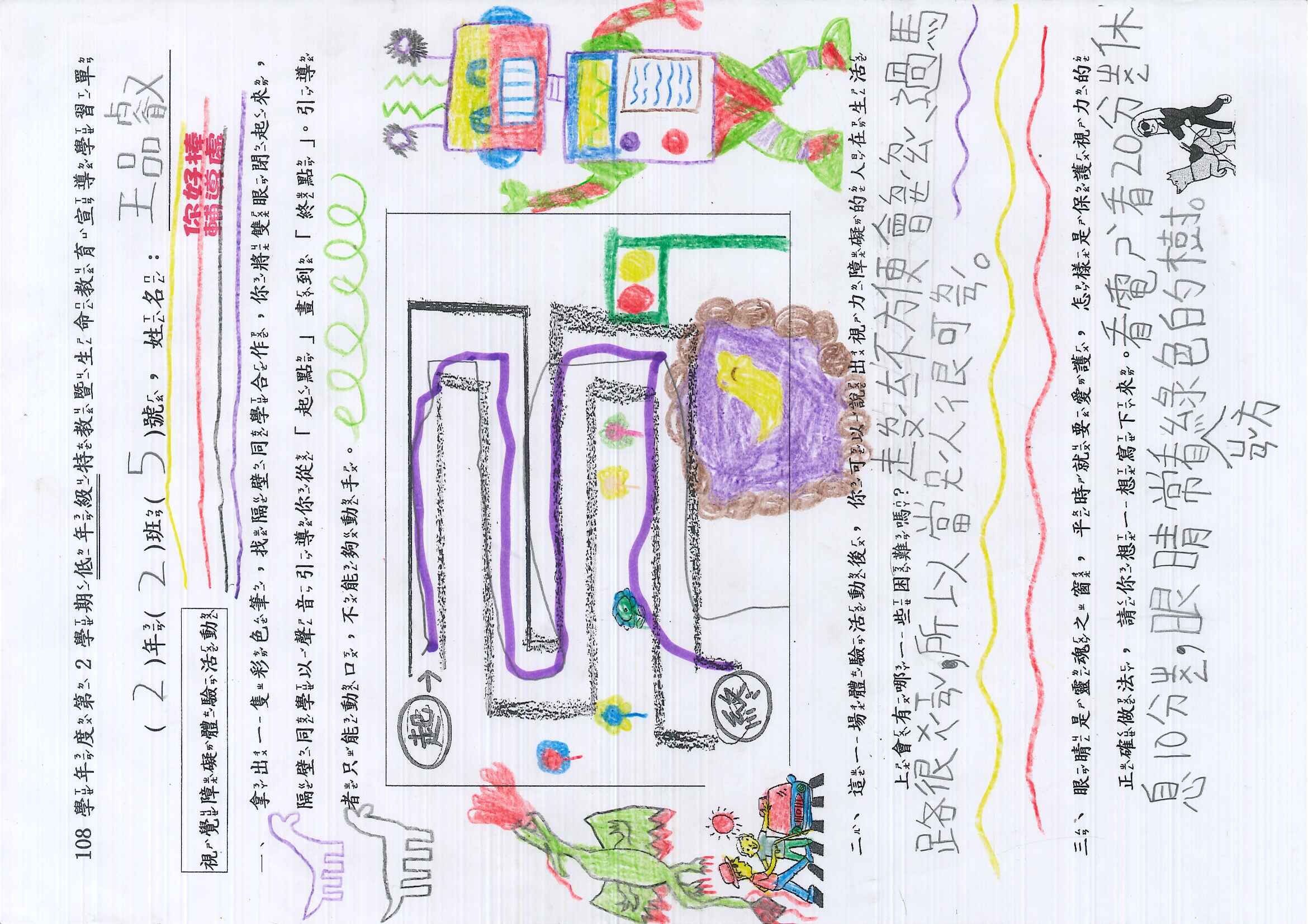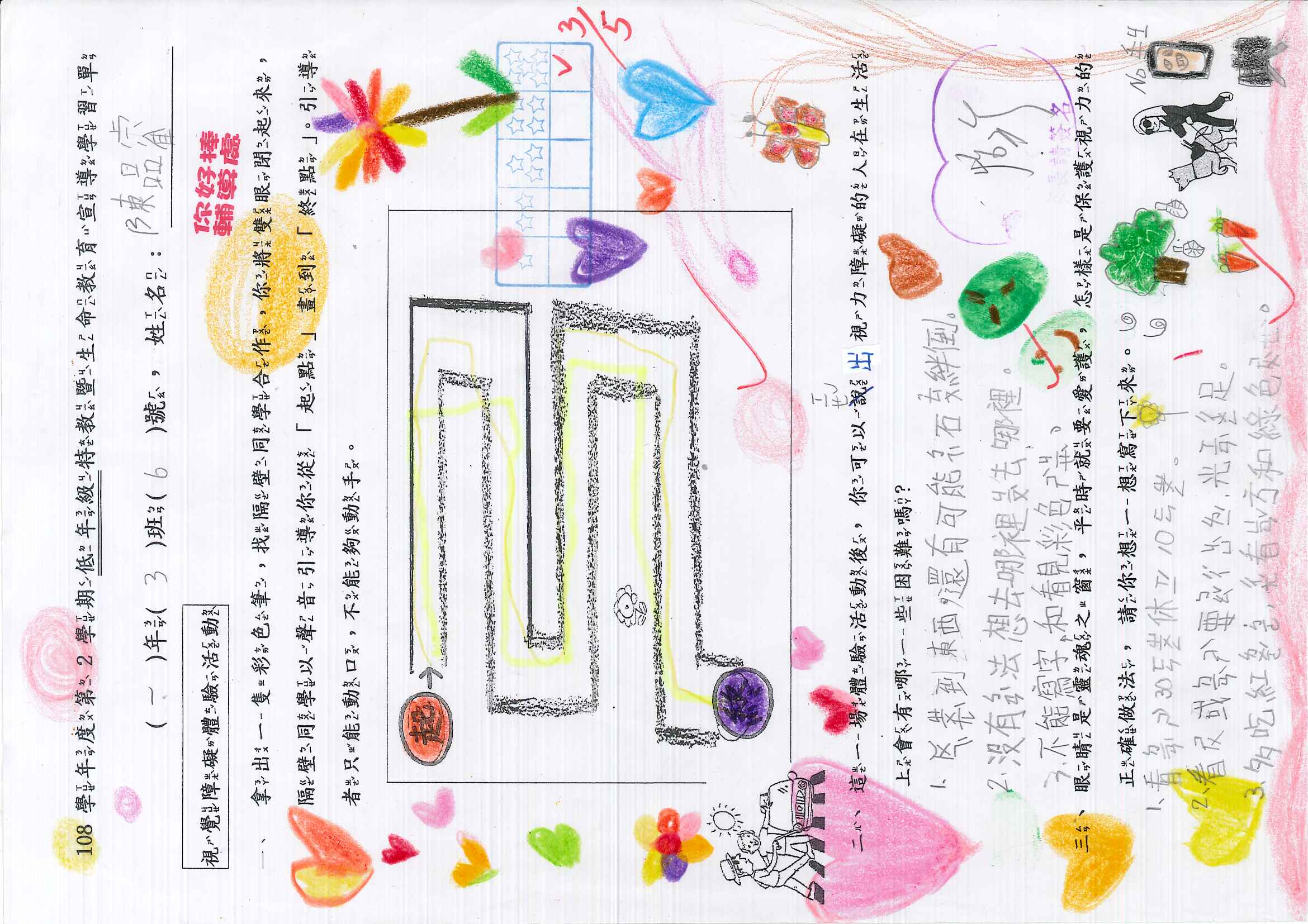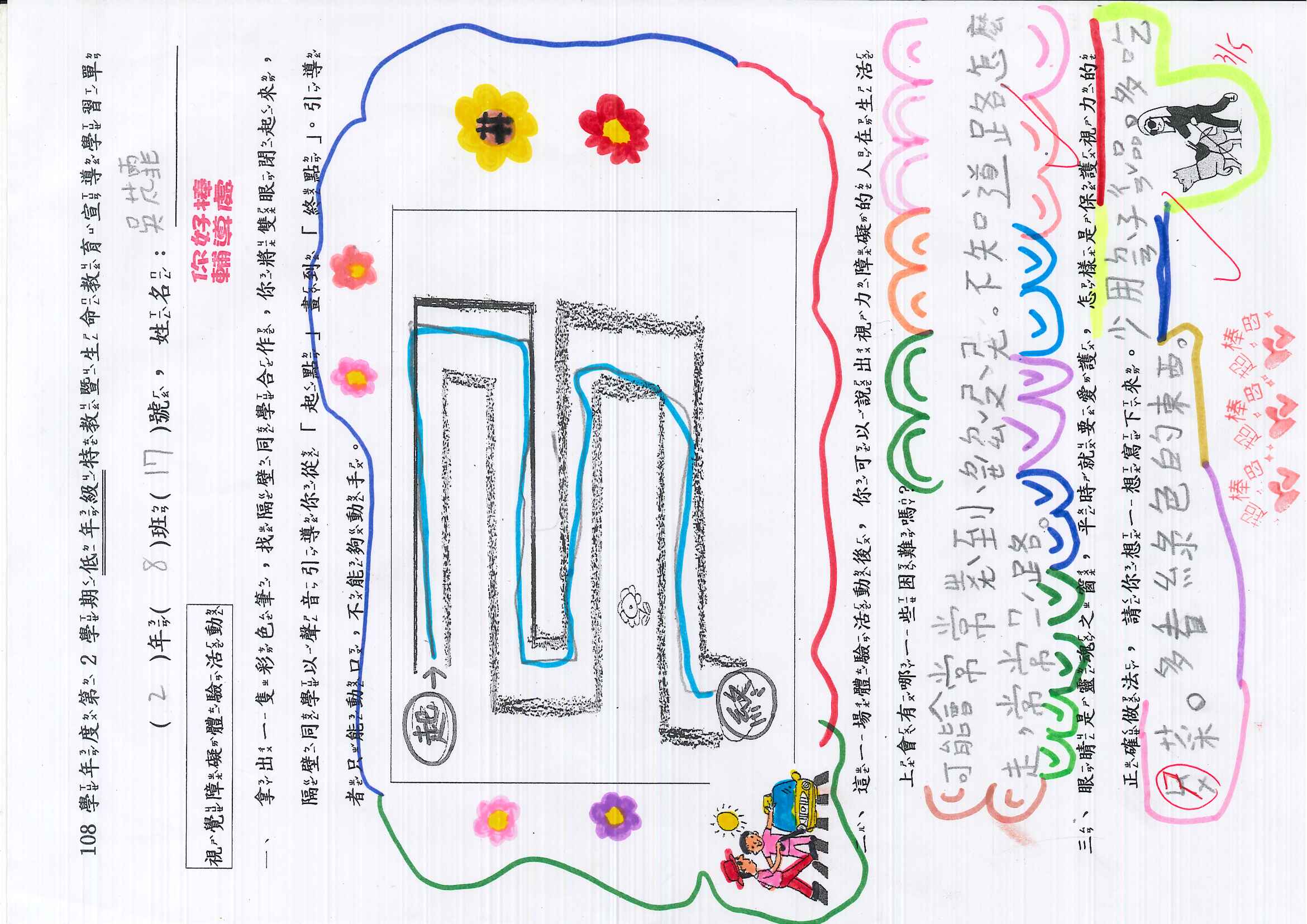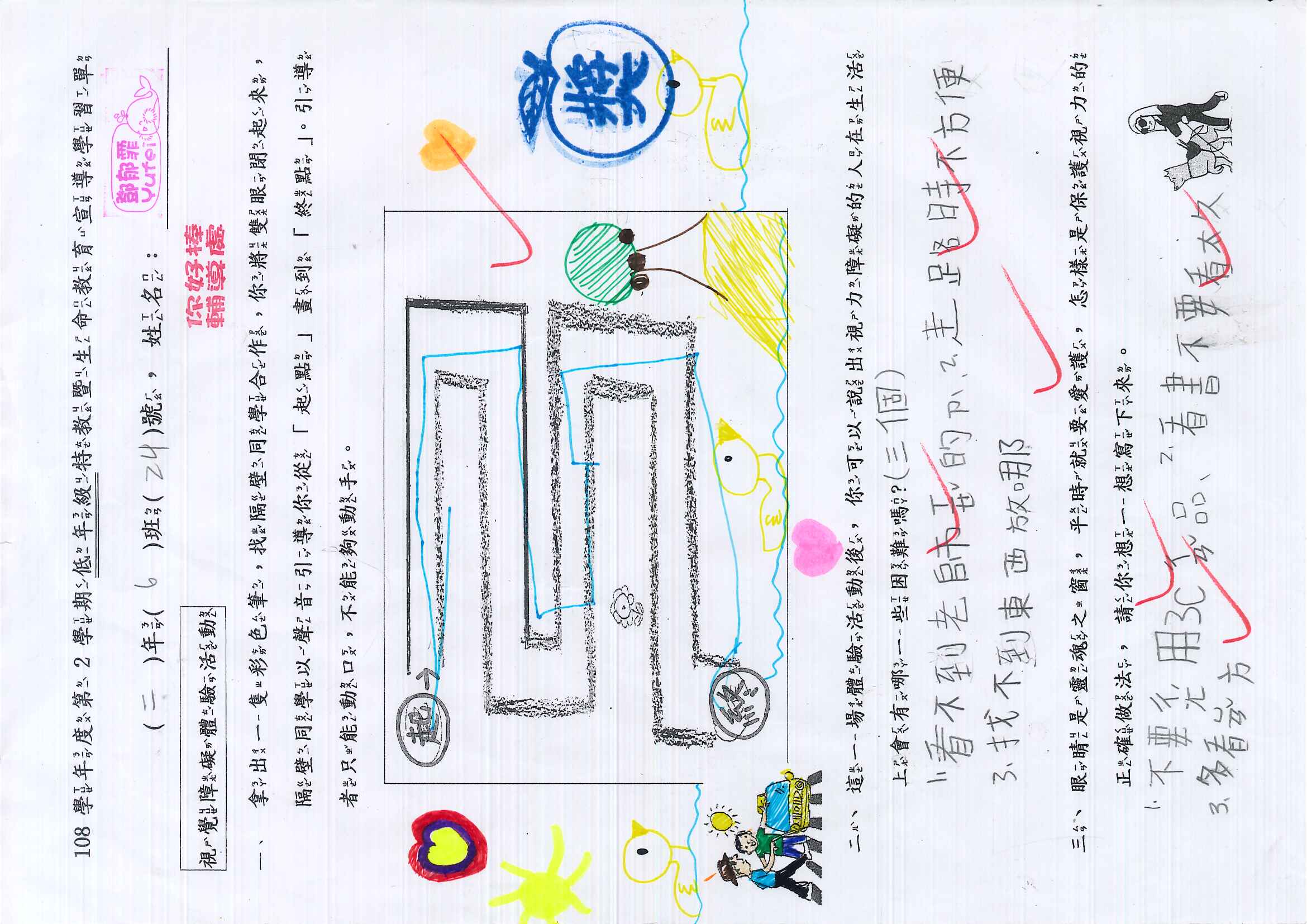 除了學習單,老師也規劃了體驗活動,雖然是低年級,也很認真的參與,慢慢體會視障人士的危險與不便。希望他們能懂得體會他人的不便,更珍惜自己擁有健康的身心。