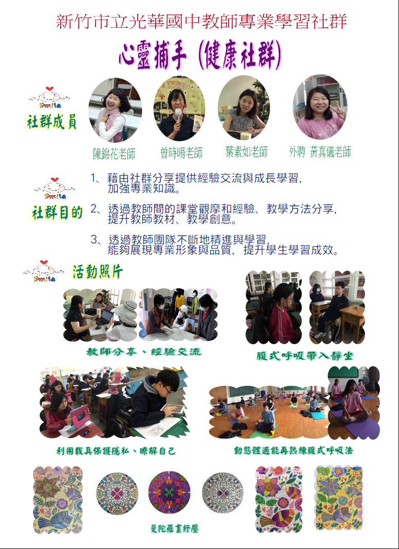 懵懂的青春期,遇到壓力如何調適?藉由課程帶領孩子認識自己的情緒及特質,並學習腹式呼吸、靜坐、體適能搭配腹式呼吸以及曼陀羅畫紓壓,時刻學會照顧自己的身心靈。