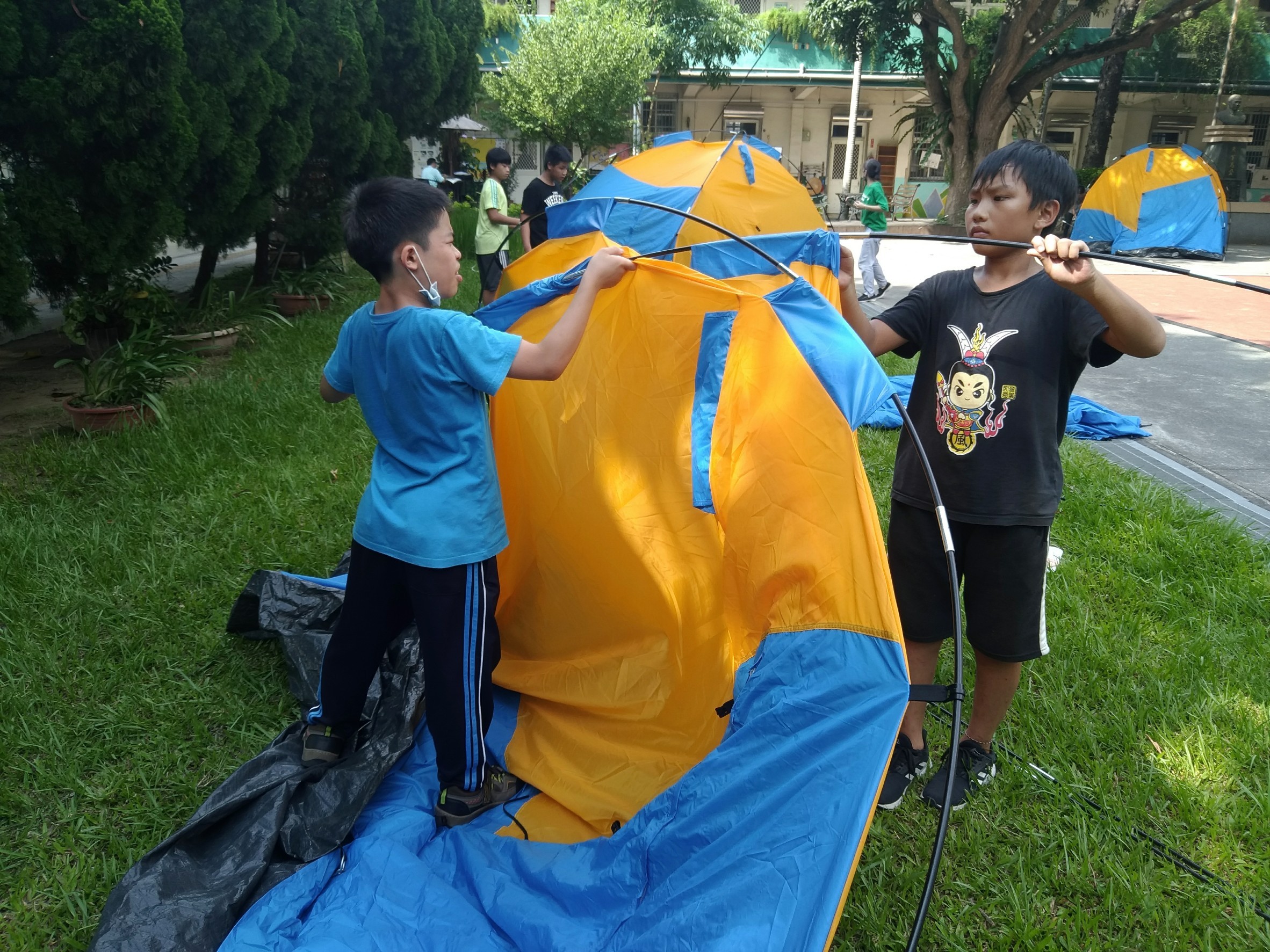 換孩子們自己動手搭帳棚。