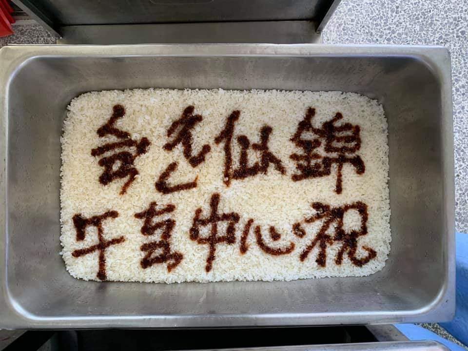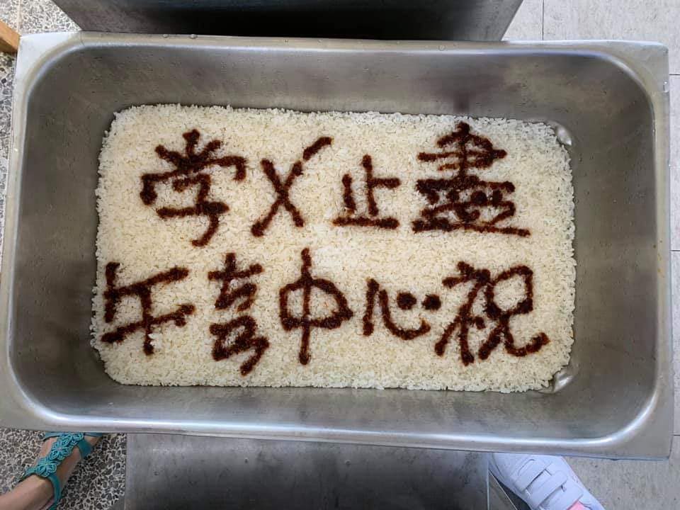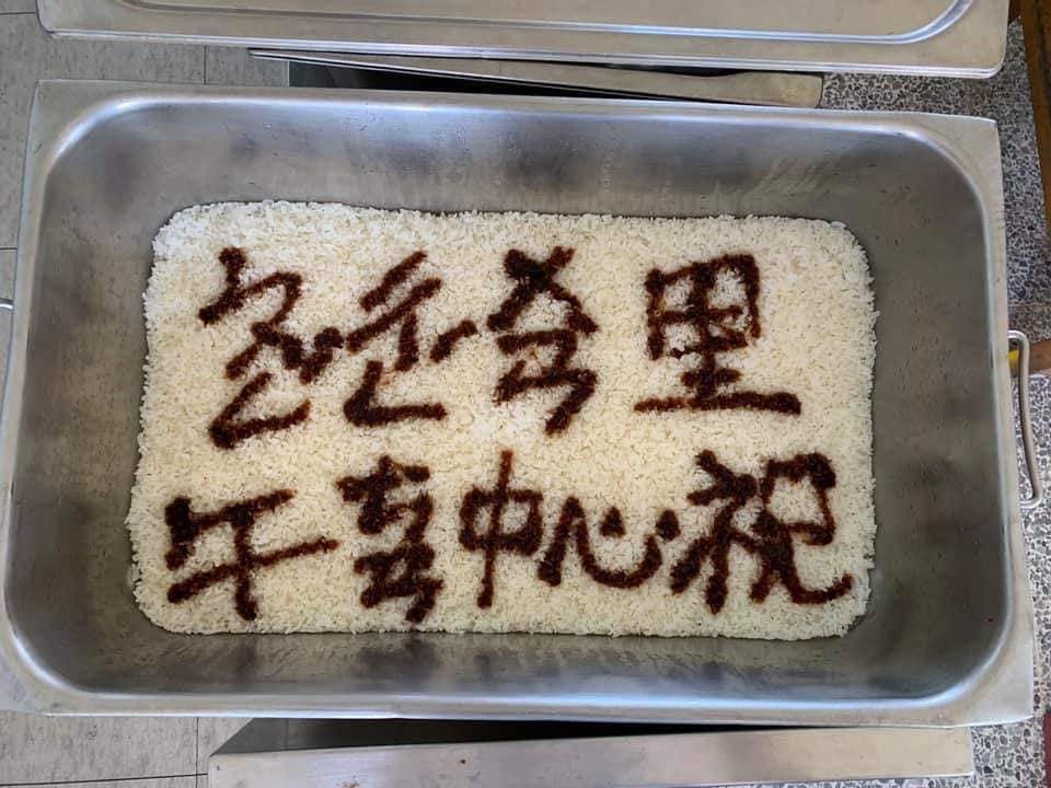 謝謝辛苦的午餐中心阿姨,特別在白飯上寫下畢業祝福。學生好感動喔!每班都不ㄧ樣。