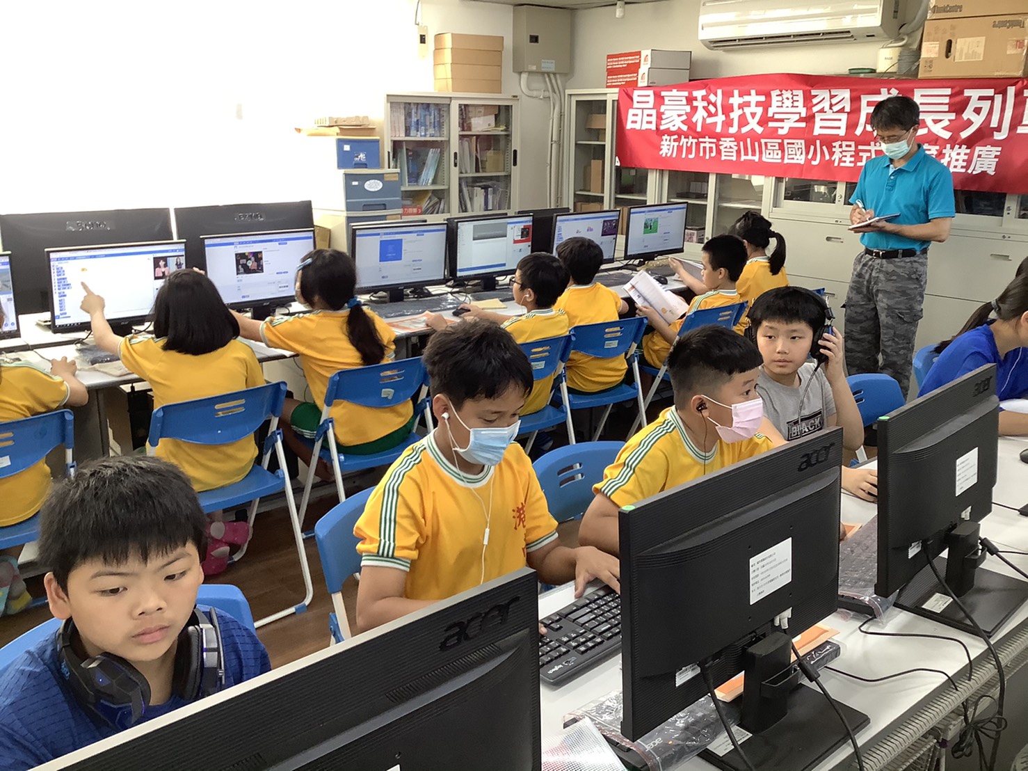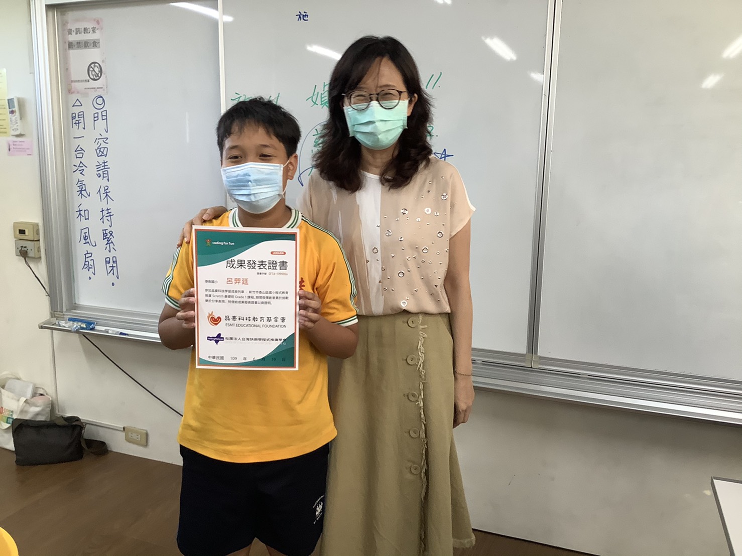 2020年06月19日是港南國小程式設計設成果發表的日子,小朋友輪流上台報告自己的作品,後投票選出四位優秀作品,由晶豪科技教育基金會執行長蕭敏小姐頒發獎品。最後由蕭執行長頒發結業證書。