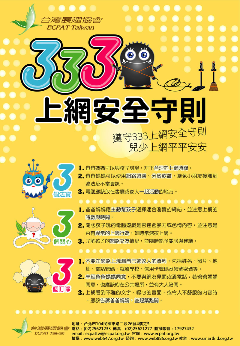 網路已融入大眾生活文化,親師生都需注意手機使用管理。學校、家長應建立與兒童及少年間的信任,協助兒童及少年建立良好健康上網觀念。以下分享《333上網安全守則》,家長們可和孩子們一起留意以保平安喔!