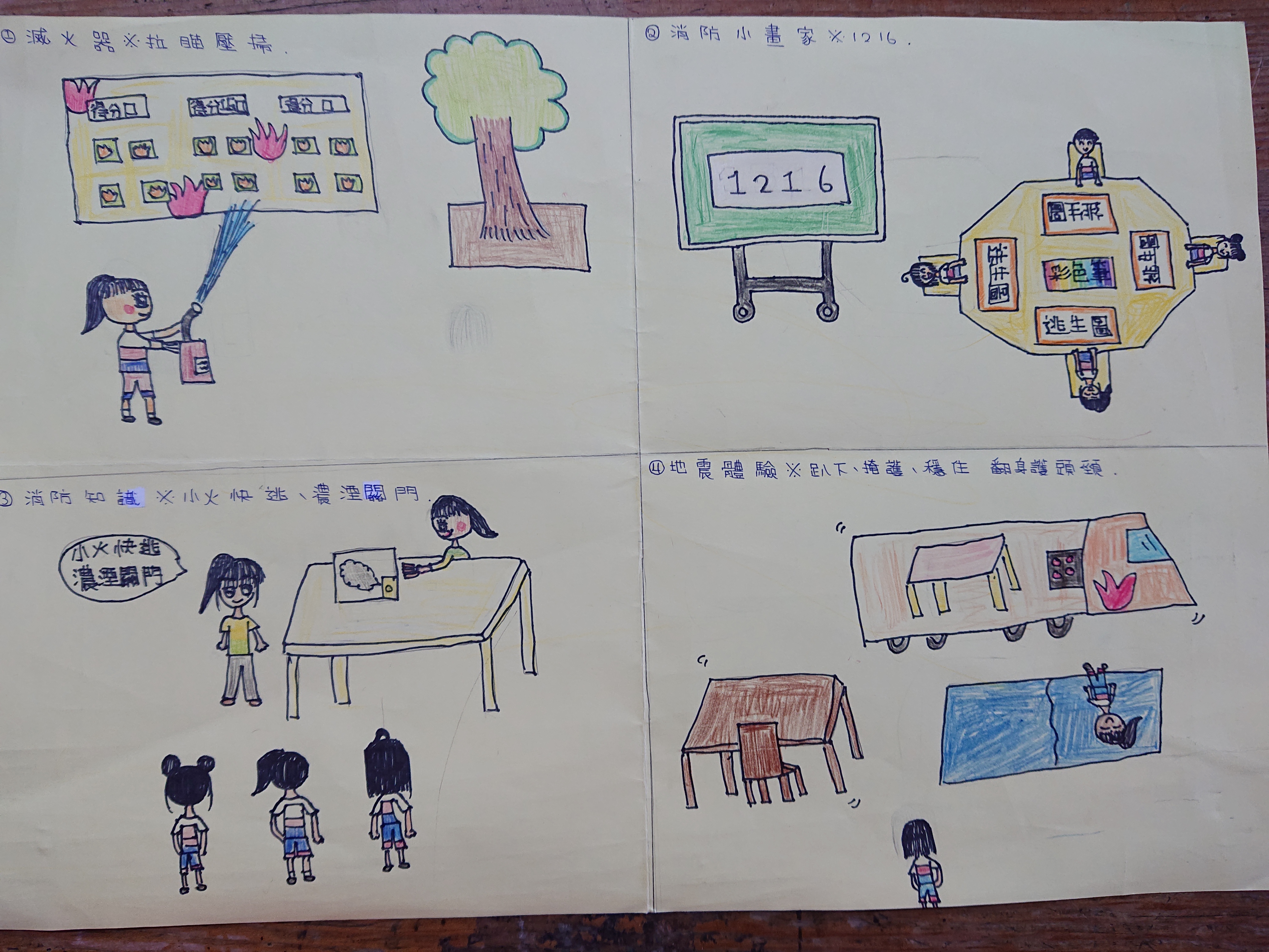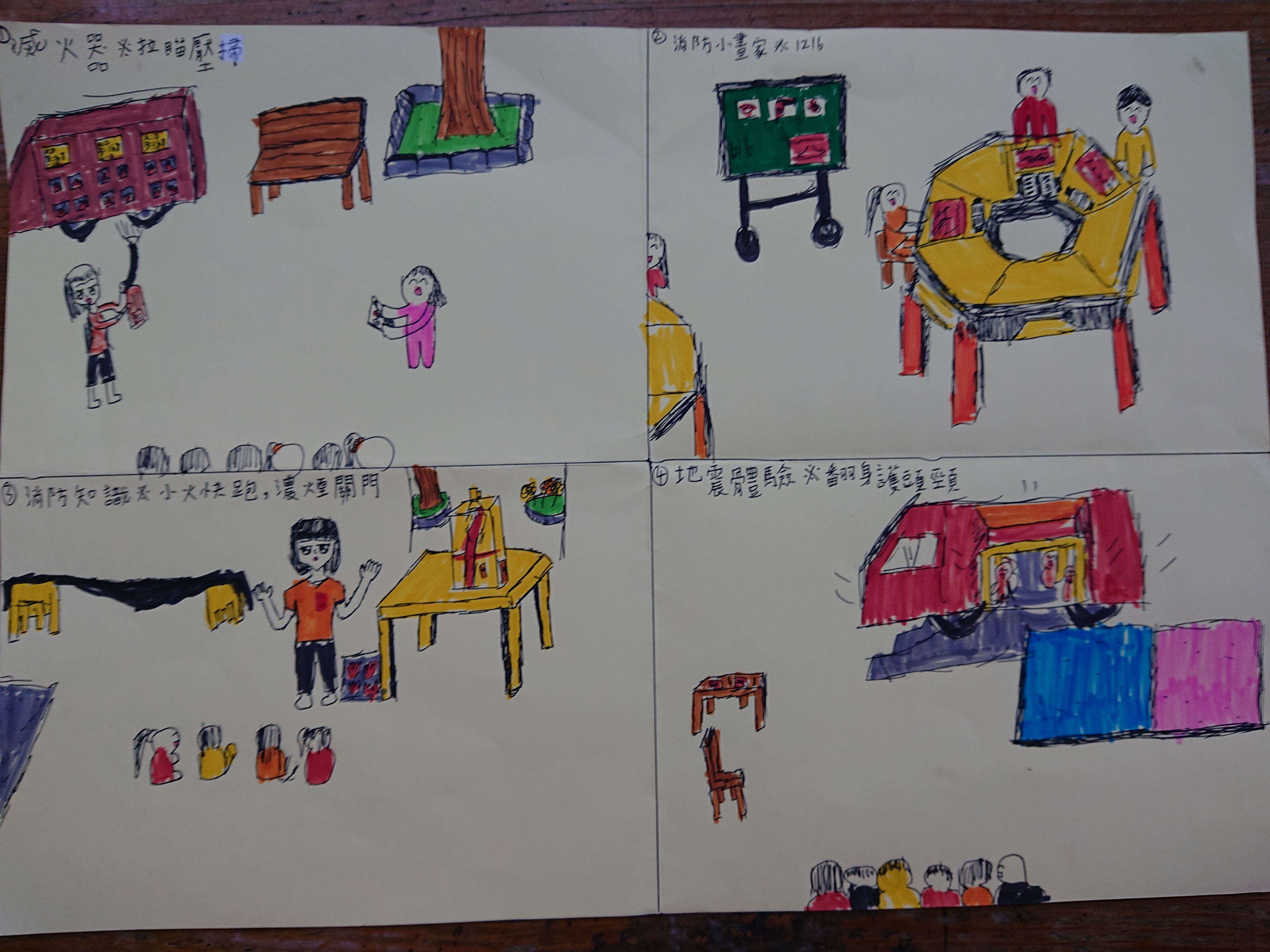 消防護照活動體驗之後,健康課的內容剛好有防災相關的課程,課堂上討論後,將消防大哥帶領的四個闖關活動,以四格漫畫的方式表現出來,小朋友的繪畫真令人驚艷ミ
