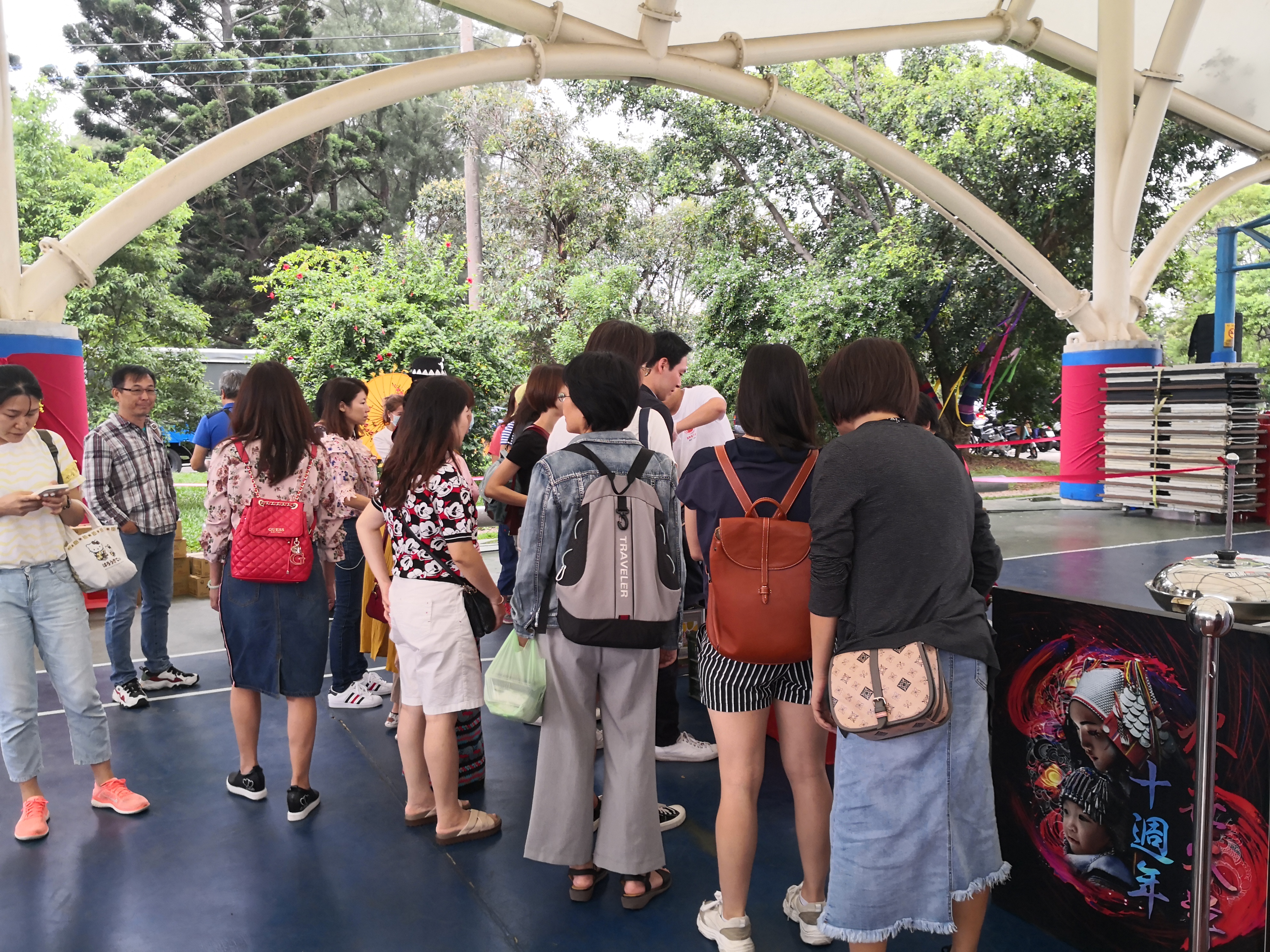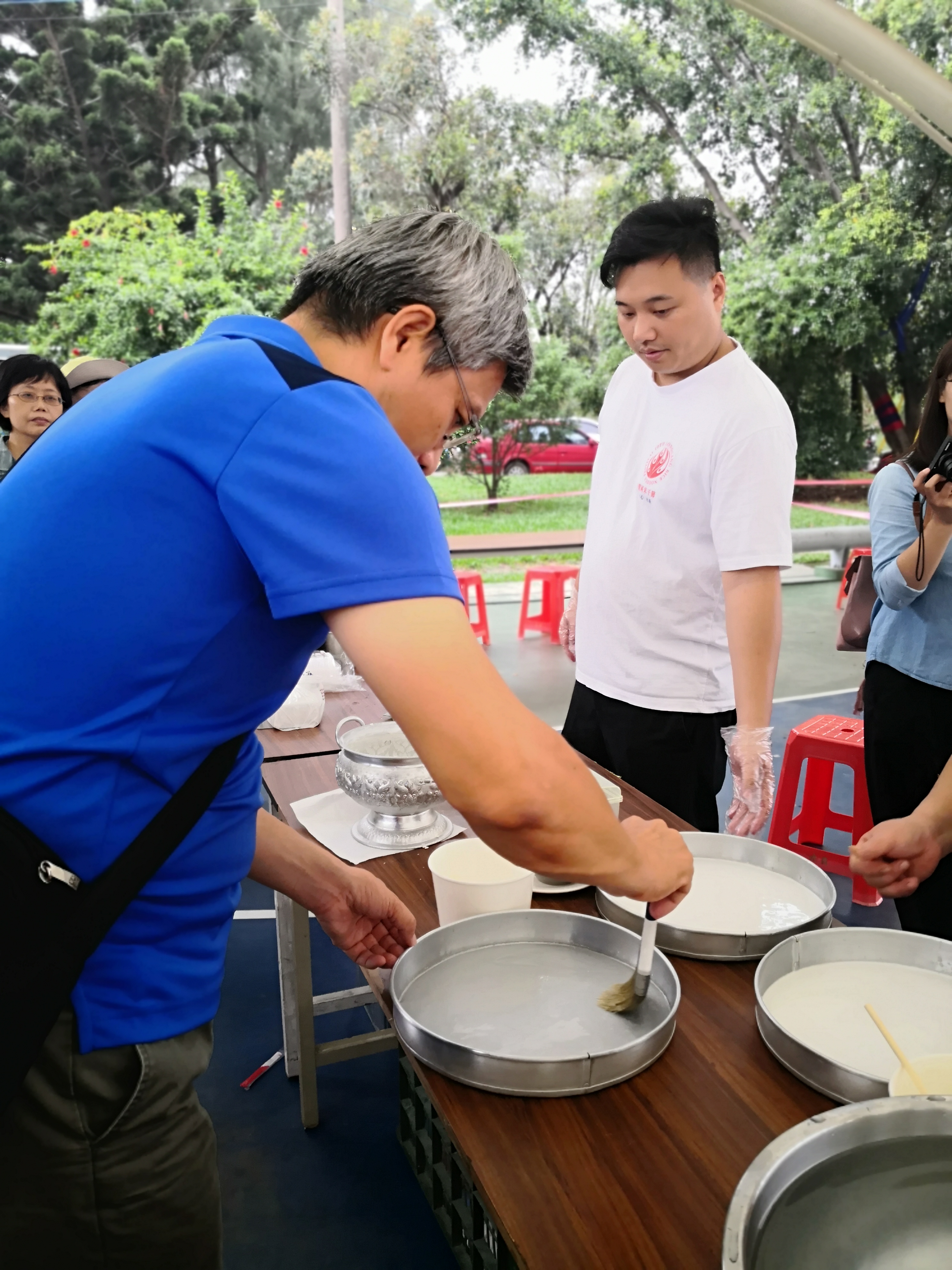 接著我們又來到隔壁攤位繼續體驗緬甸和東南亞文化,這個體驗是能夠自己製作米干,就像是台灣板條一樣,從米漿開始製作,大家將米漿撈到圓鐵盤上,均勻加熱後,就成了一片薄薄的米干,再將它切成一條條的米干,原來米干的製作就是這樣完成的。