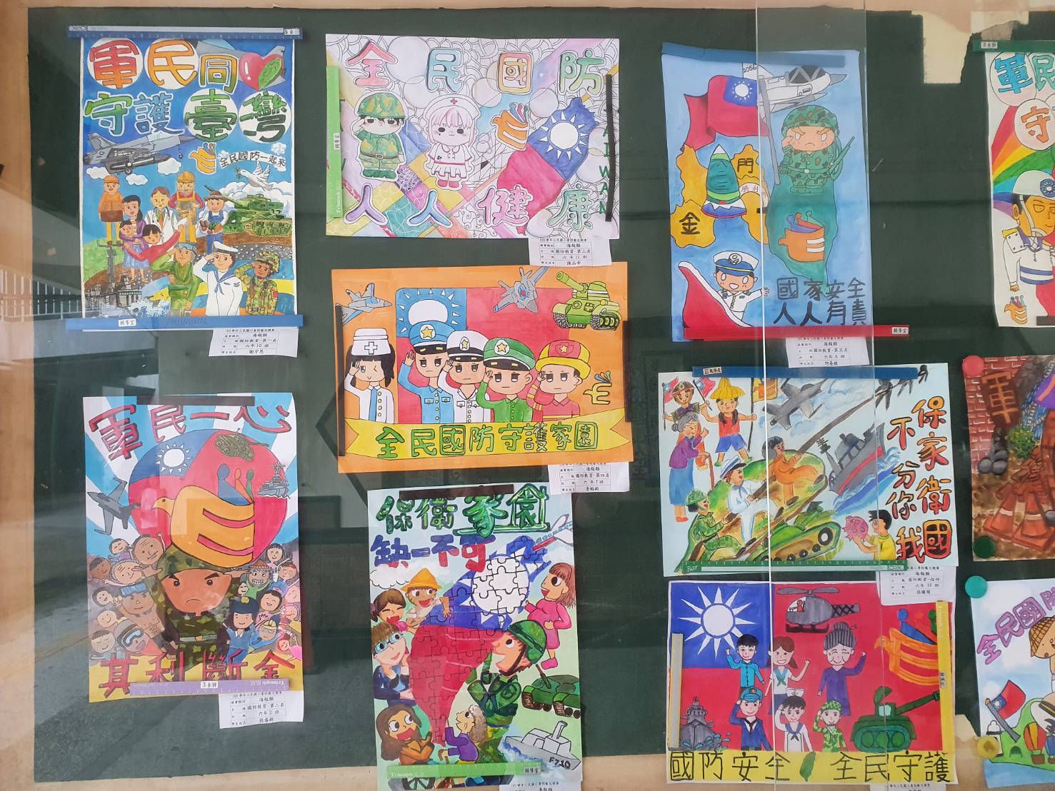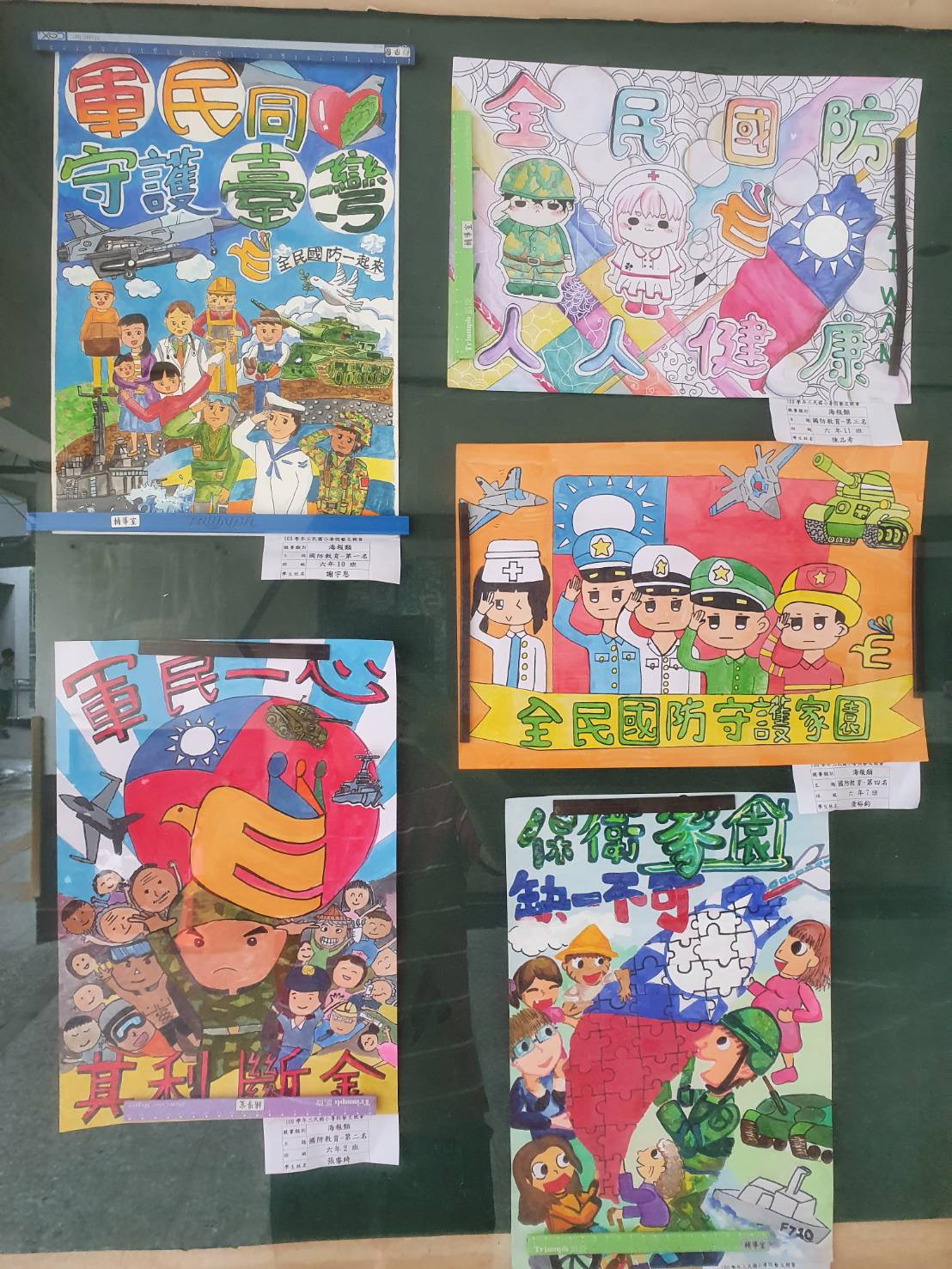 本校在今年暑假前針對六年級指定「國防教育」海報設計做為其中一樣作業,學生利用近45天的時間去構思及完成作品,因為是針對全體學生發下比賽用紙,因此每位學生在製作作品時,便需花時間去了解國防教育的意思何在,才能開始下筆製作海報,無形中也讓孩子自己主動去了解「國防教育」,進而達到學習的目的。開學第一週收齊作品後,由本校專業的美術老師擔任評審,評選出前六名及佳作六名,以下是學生的優秀作品,請大家一起欣賞囉!