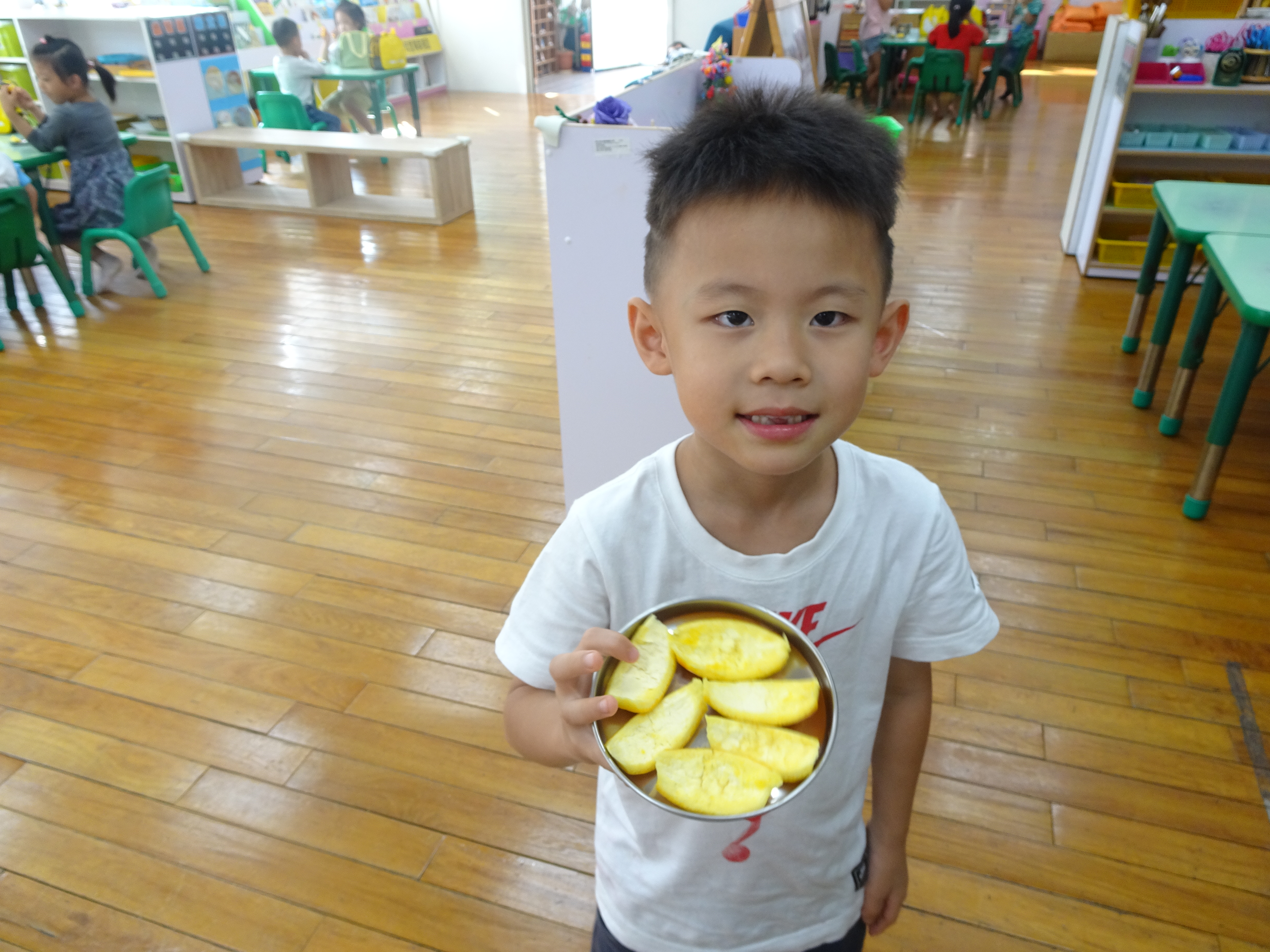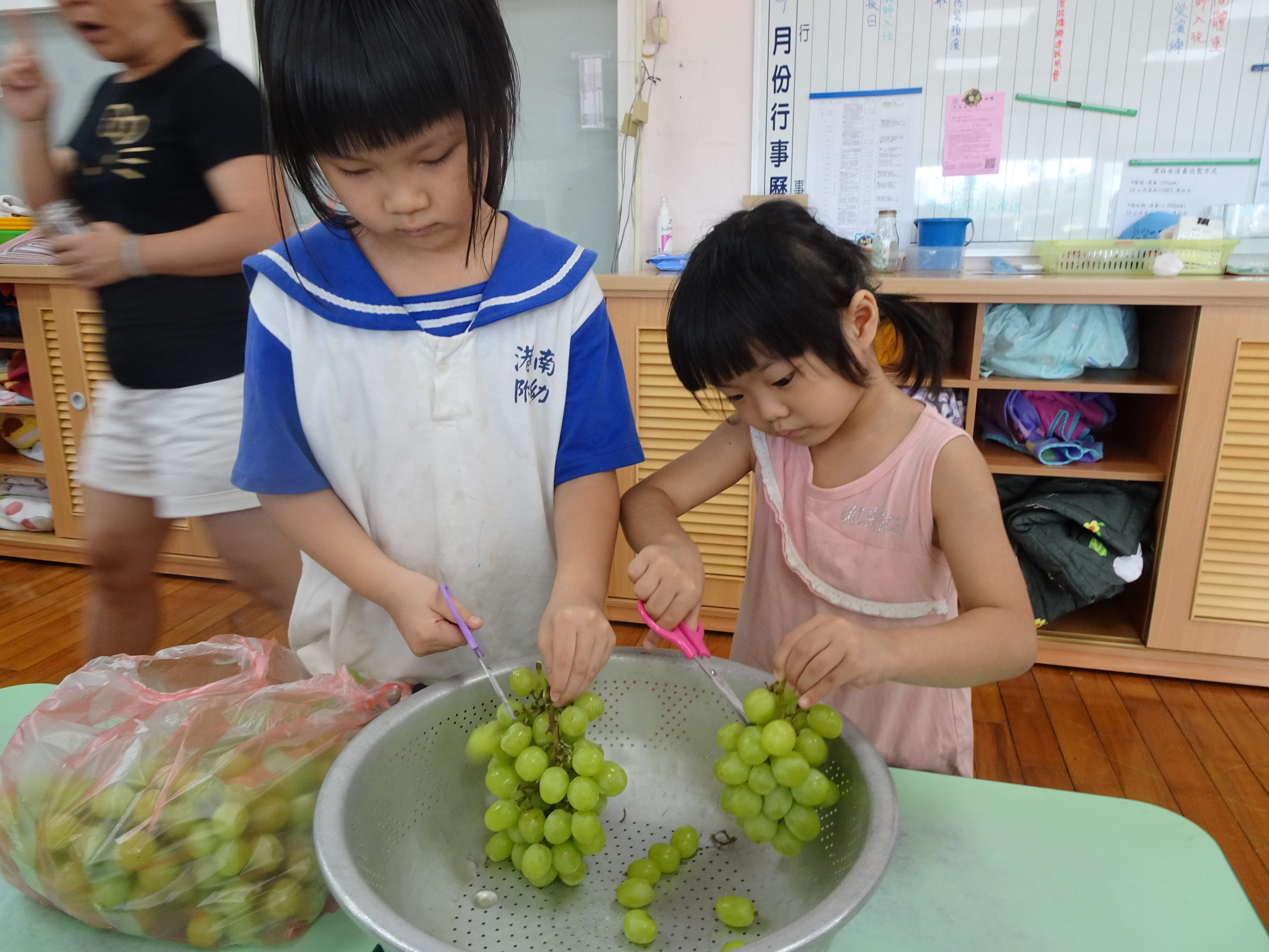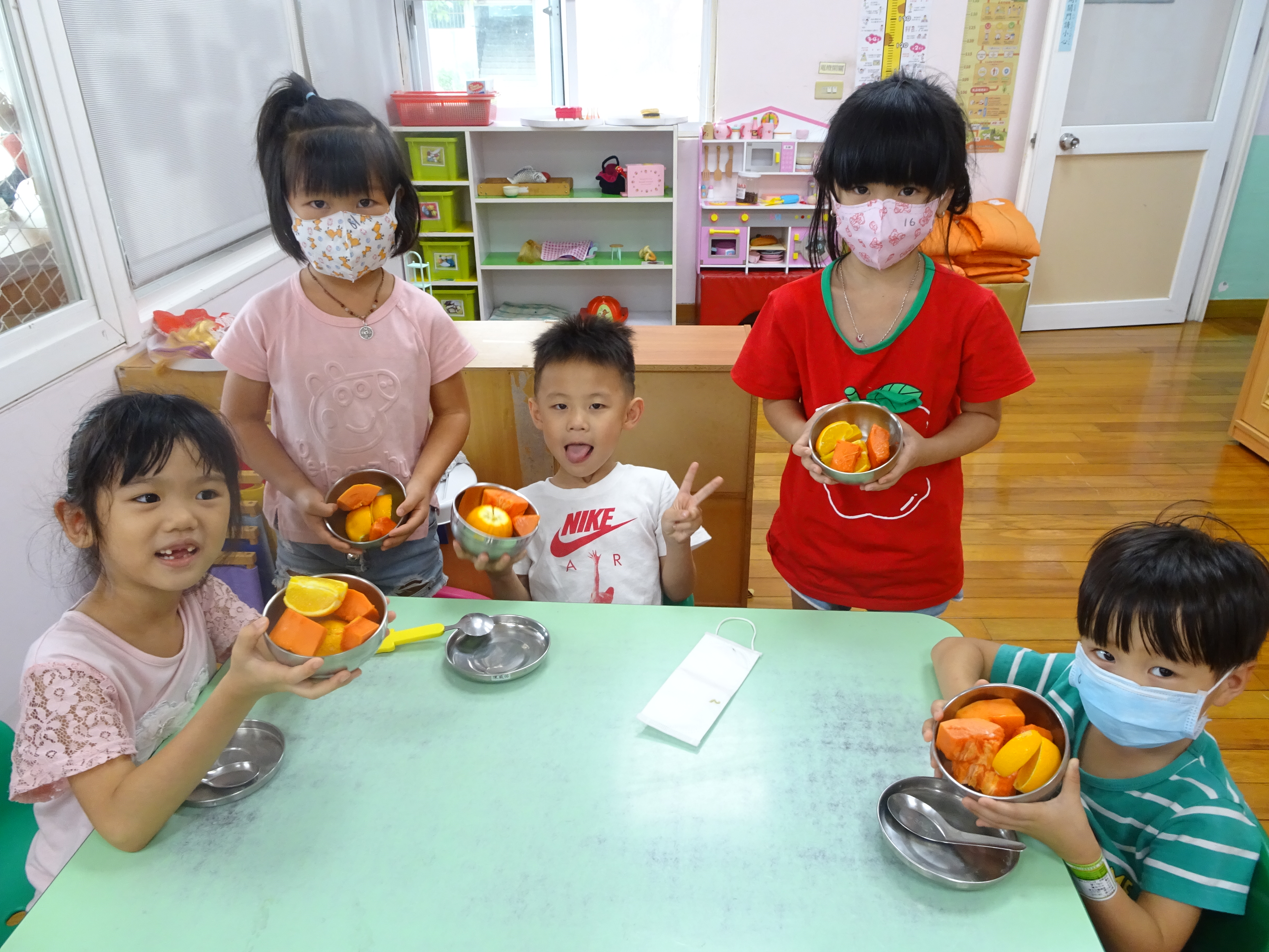 在一個每個星期有2餐以上的水果拼盤的港南幼兒園的學校中,住著一群愛吃水果的小朋友,再酸的香吉士也能一顆一顆地吃掉,而且能將果肉吃得非常乾淨,水果裡的營養真的很多很豐富耶~老師更會鼓勵快生病的孩子要多攝取水果中的維他命C,希望每個孩子都能健健康康的。有時會有一串串的葡萄,孩子們很勤快地將一串串的葡萄剪下來,藉此機會訓練小肌肉,持剪刀的能力,孩子們自己剪水果、洗水果非常有成就感,相對的也能開心地吃水果。