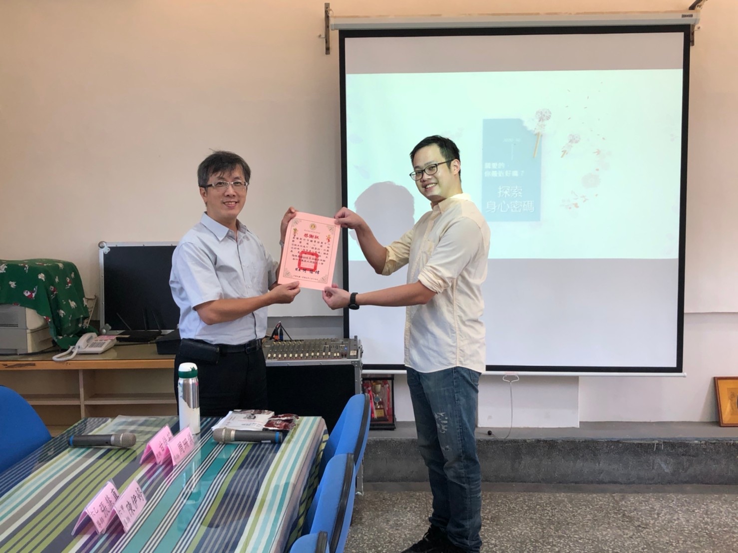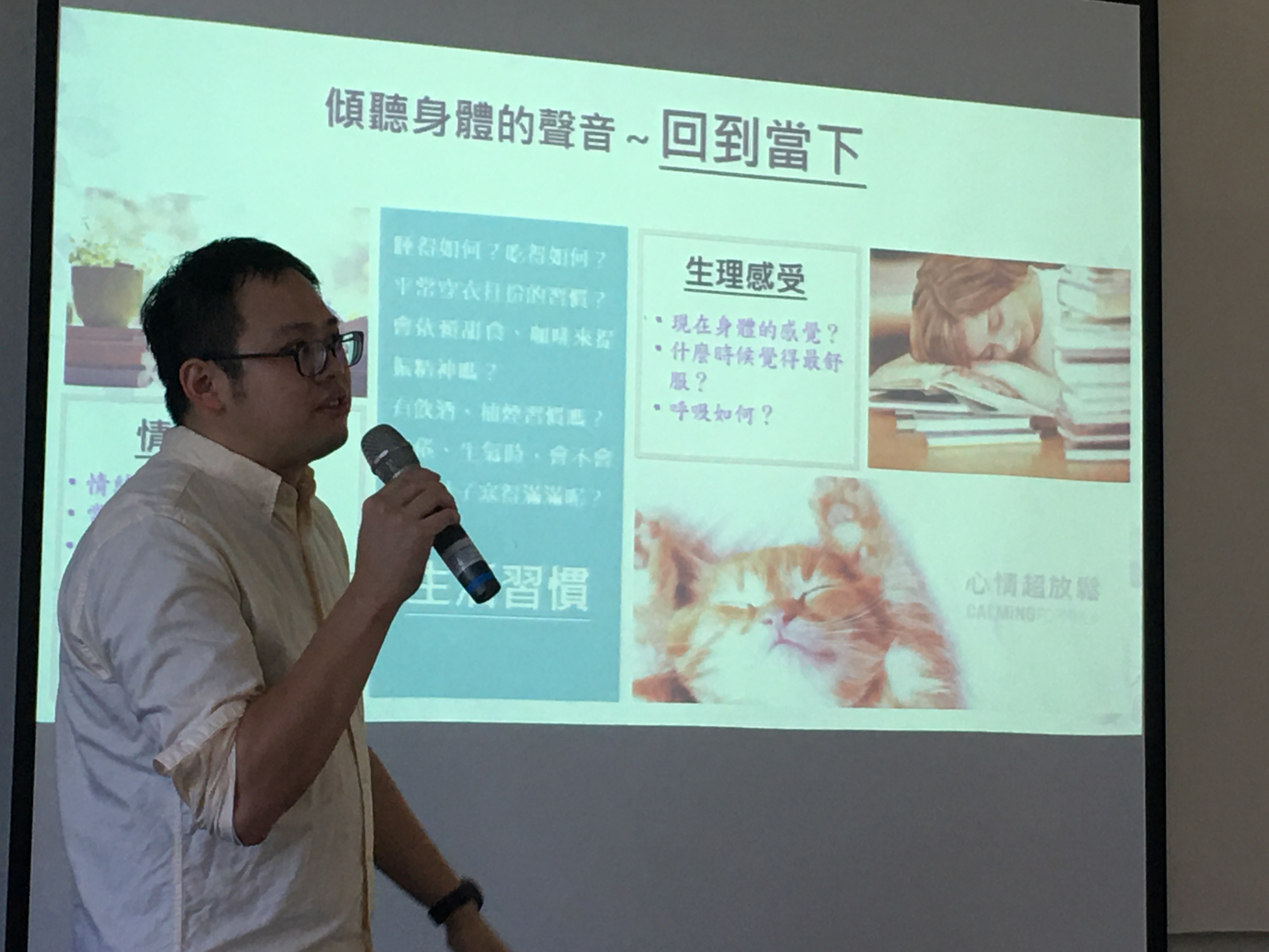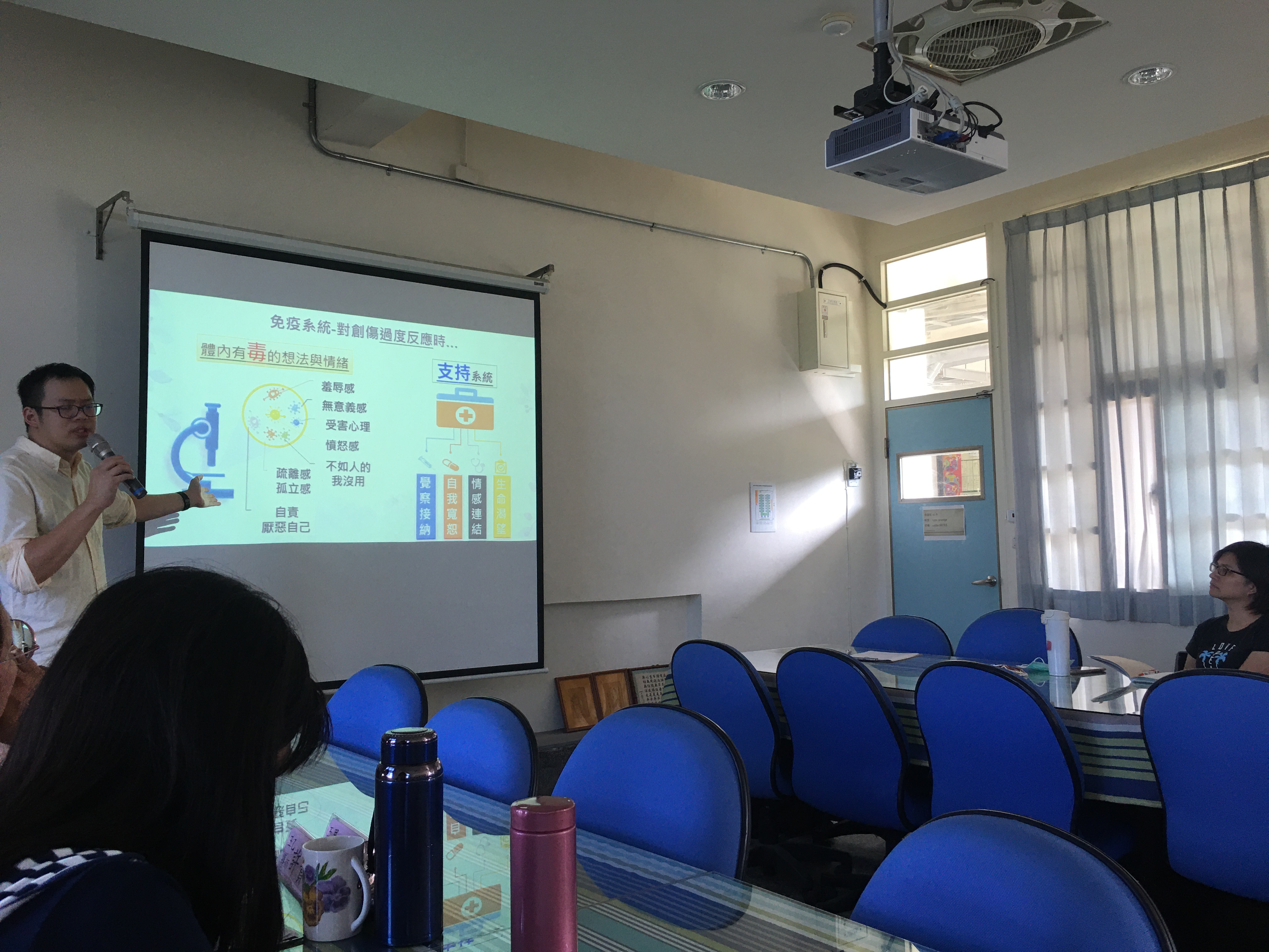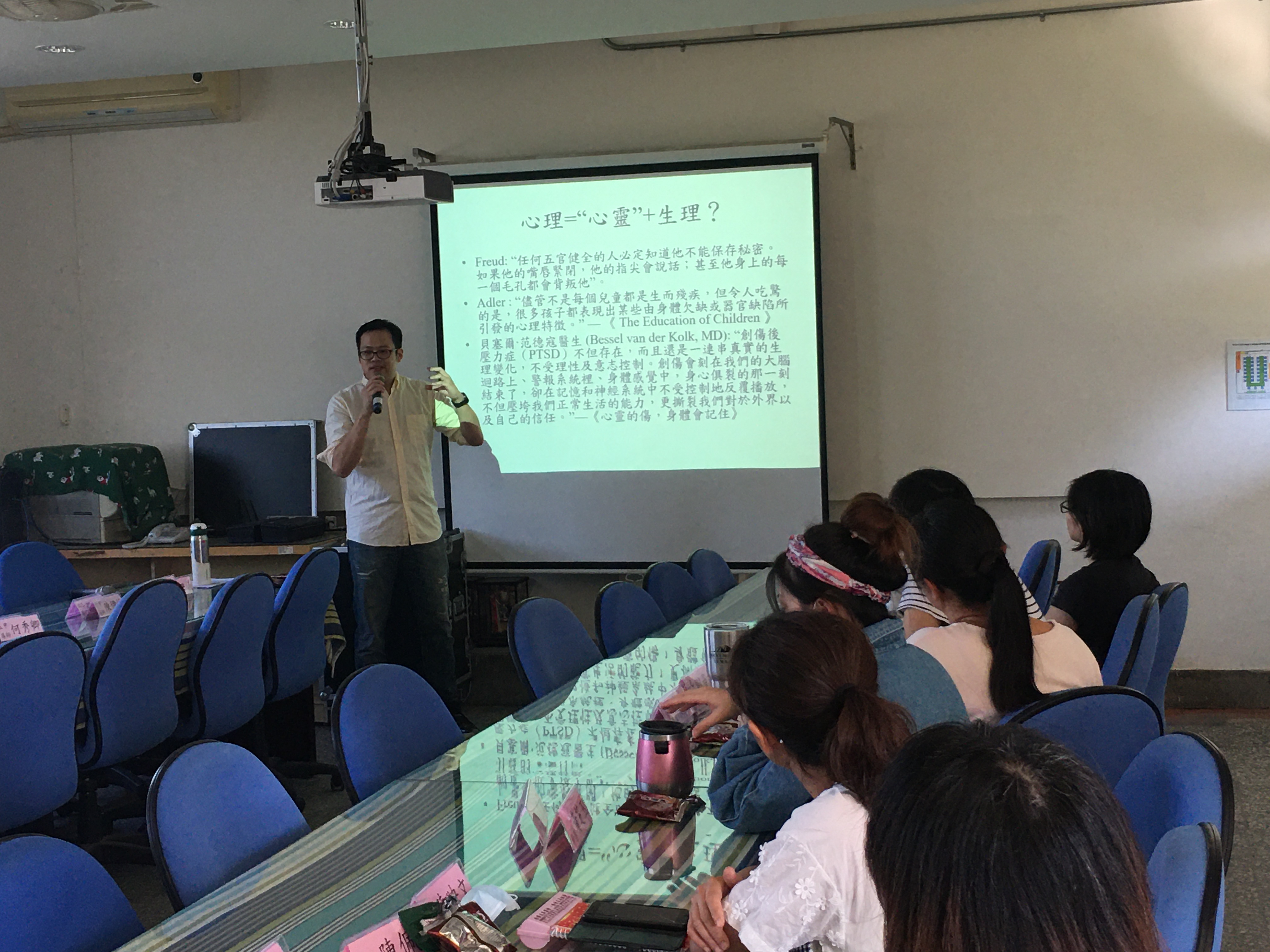 今天的講師鄭心理師-ㄧ個看起來有點愐腆的大男孩。他從[心理=心靈+生理?]的觀點切入主題。也請我們思考甚麼樣的關係是滋養自己?甚麼樣的關係是造成自己的耗損?也請大家思考,當心理有情緒時,身體部位會有哪些感覺和感受,還談到情緒對身心和疾病的影響。還提到心靈容納之窗的概念,並介紹了一本談身心與疾病的書籍-[身心調癒地圖],供大家傳閱……。最後心理師還帶大家做正念的身體掃描,讓大家的身心都得到很好的放鬆,也讓大家更知道要覺察與善待並照顧自己的重要。感謝輔諮中心心理師鄭博鴻心理師今天的蒞校分享。