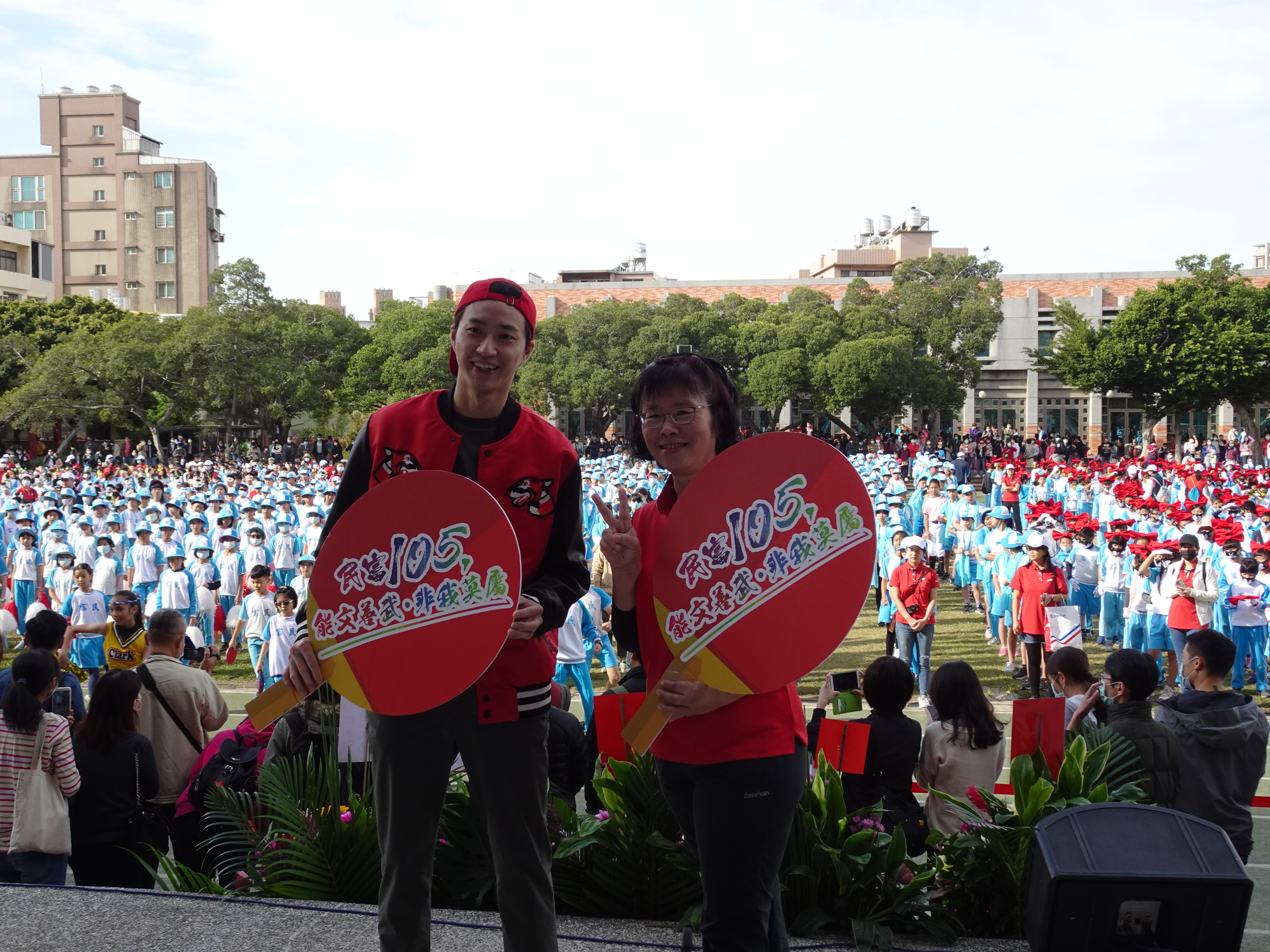 慶祝民富國小105週年校慶,會場上有很多嘉賓蒞臨,還有我們的大學長江宏傑桌球國手也到場,幼兒園寶寶穿著活力四射、可愛無敵的啦啦隊服,一起參與盛事,大聲祝賀民富國小生日快樂。