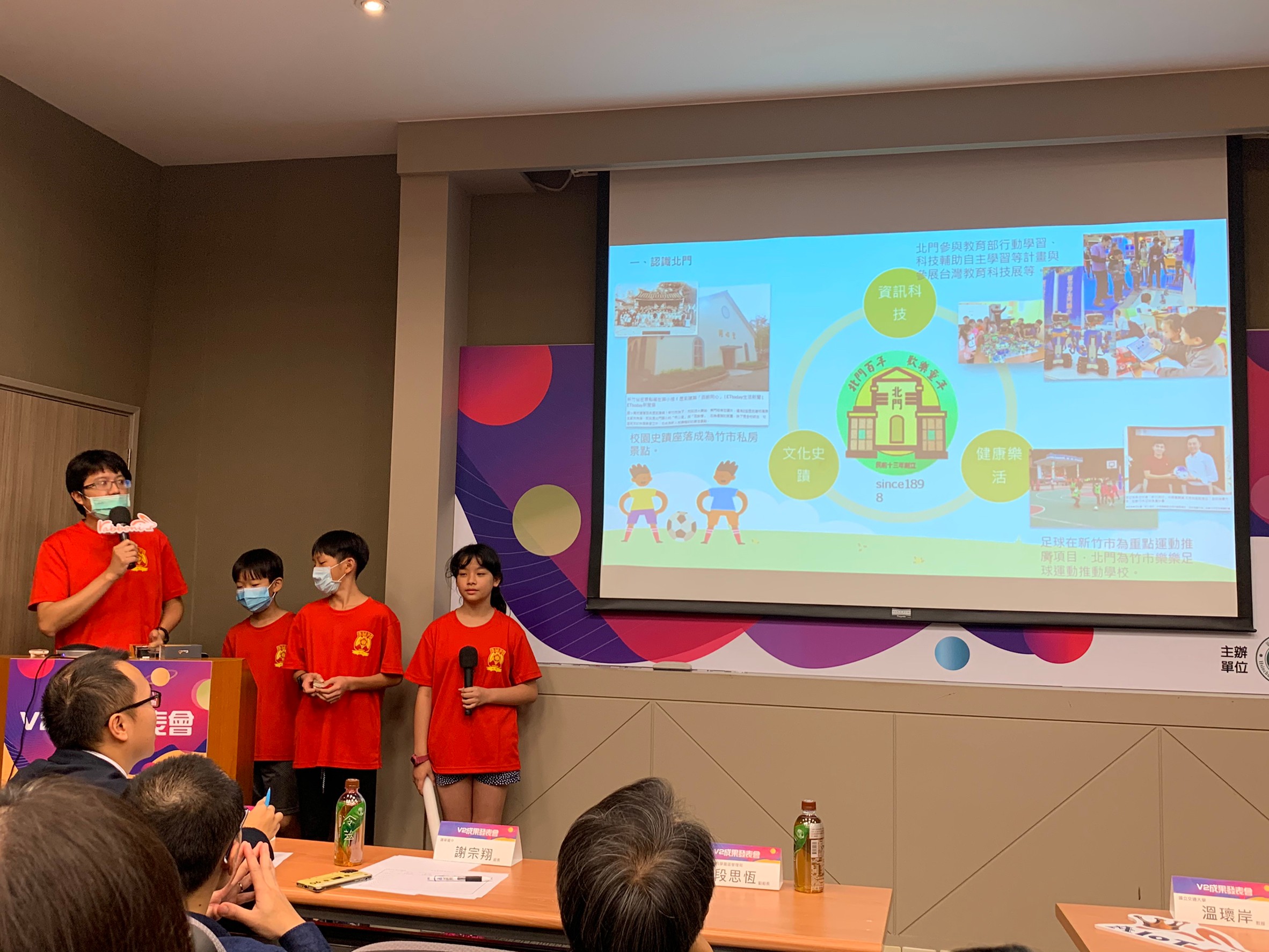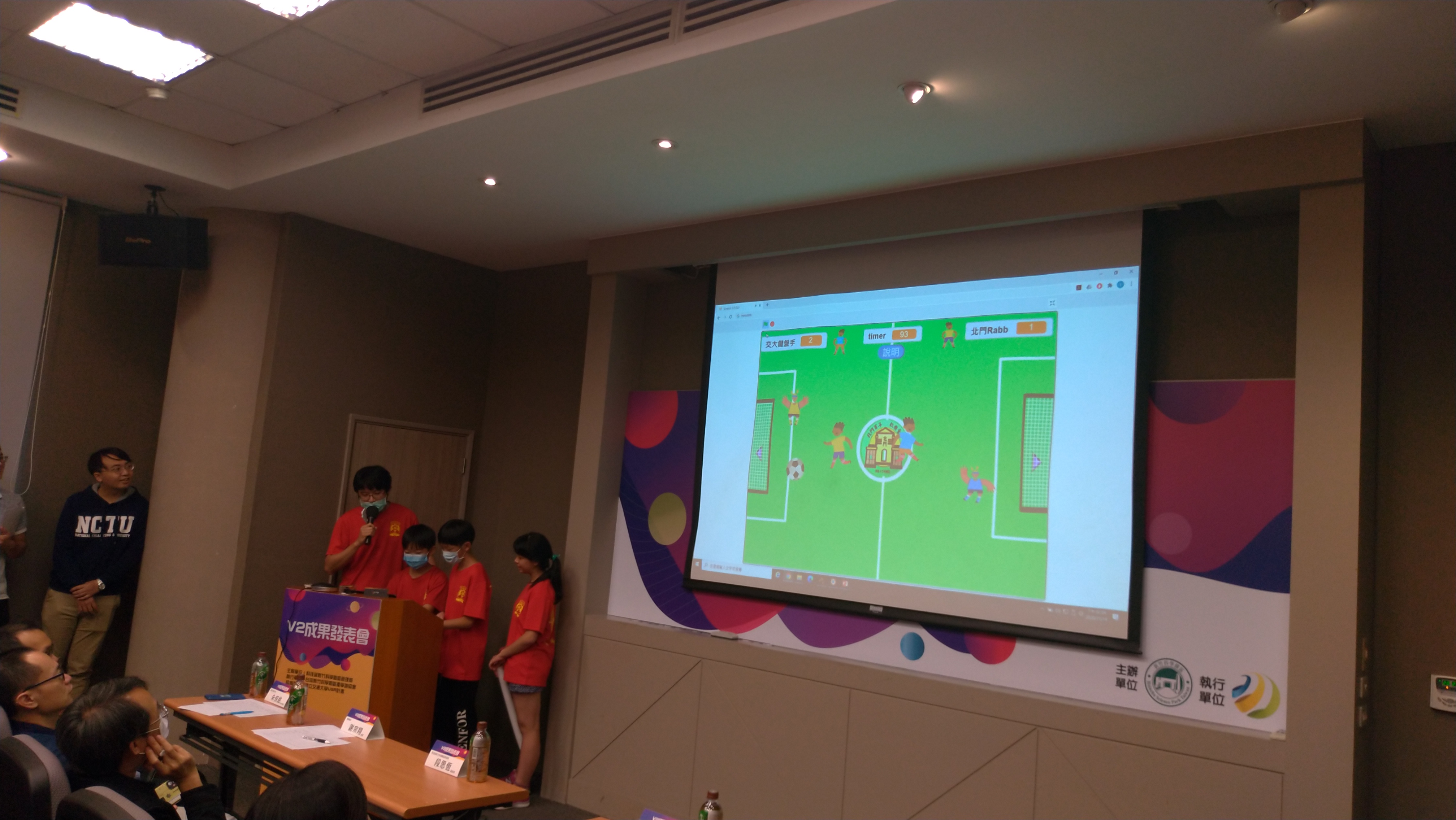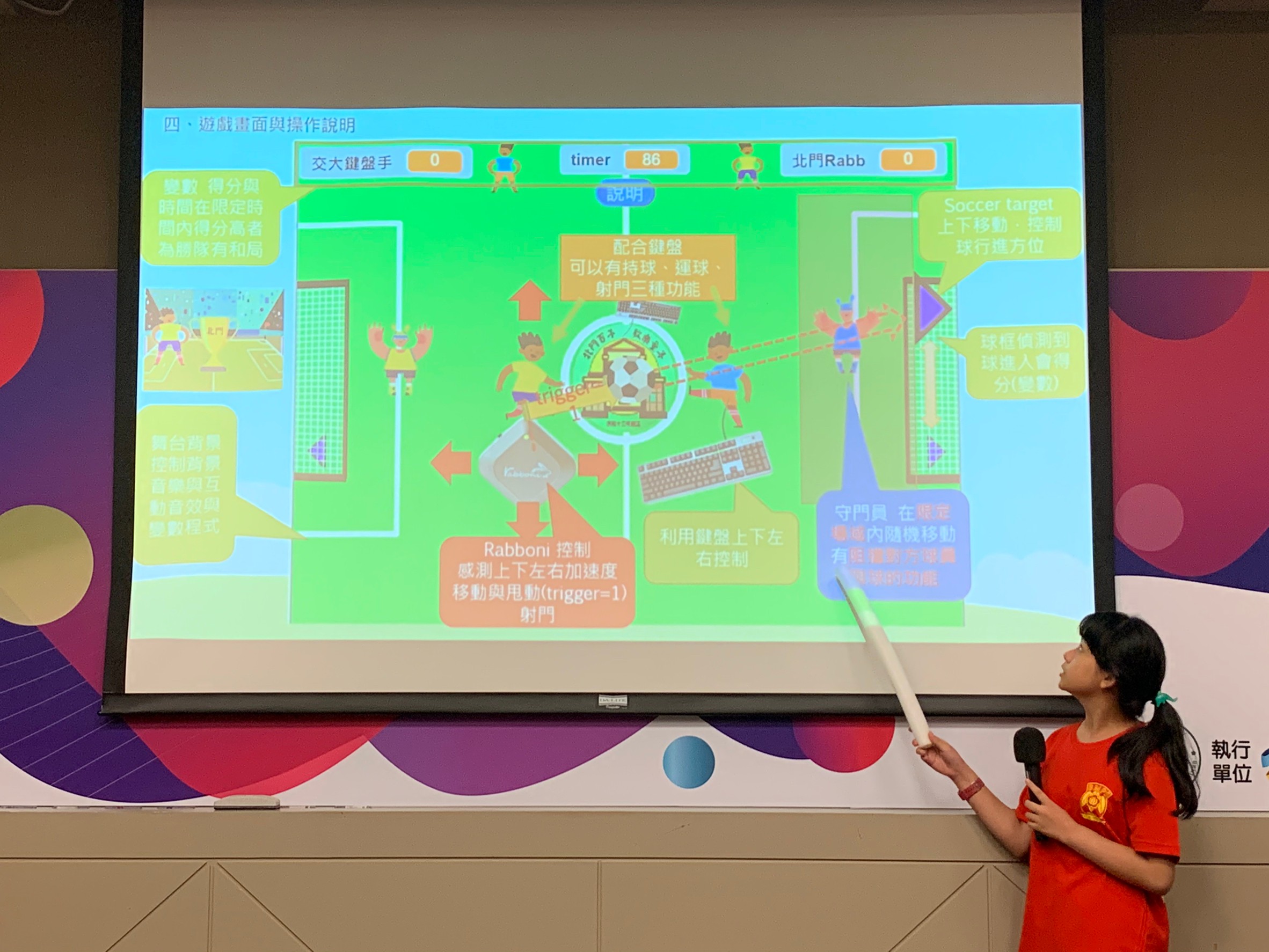北門國小團隊參加科技部新竹科學園區管理局主辦之V2程式教育親師觀摩展活動,榮獲金獎及銀獎各一名,感謝資訊團隊老師及高年級同學的用心準備與付出,本次活動學校共派出兩組參賽,一組是由資訊組長永浩老師及子寧、昀庭、宇喆同學所製作的-北門Rabboni體感足球樂,另一組是由資訊教師湍勝老師及學務處桂里主任、總務處志銘主任與嵃可、禹鈞、宥辰同學所製作的-玩賞北門趣,運用台積電設計的Rabboni晶片及Scratch程式設計,結合學校特色課程,由學生及老師合力完成程式設計與操作,並練習講解與演示,同學們都表現得很棒。