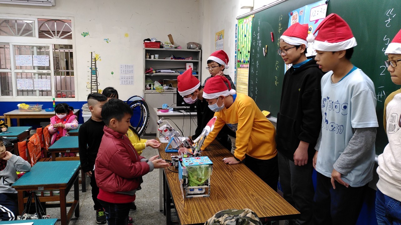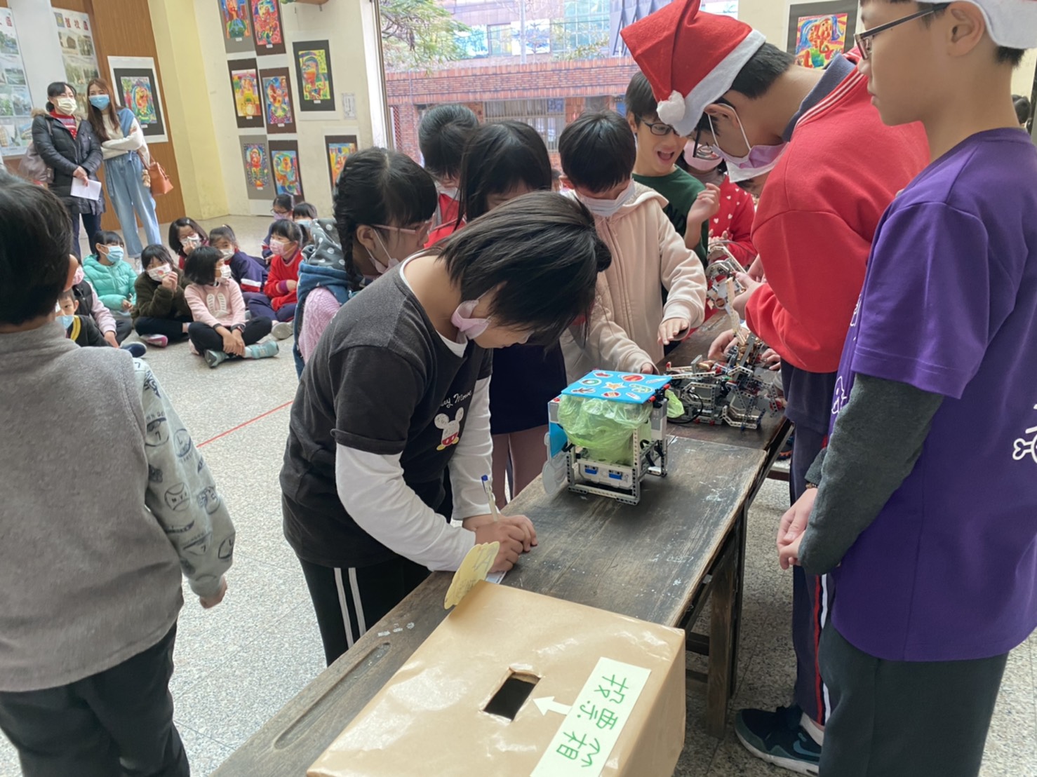 在課堂中,除了循跡車、長臂夾,更設計了酒精消毒機器人、糖果機和感應垃圾桶,在聖誕節時,入班或在中廊進行全學年的展演活動,讓其他尚未學習到程式的學弟妹或未曾接觸過的同學年同學,進行一個有趣的體驗活動,大家對這樣的人工智慧機器人大開眼見,還有好多低年級小學弟妹當場就預約:我要去參加!完成體驗後的孩子,也給這些展演的學長們投下支持的一票,給社團團員大大的鼓勵!