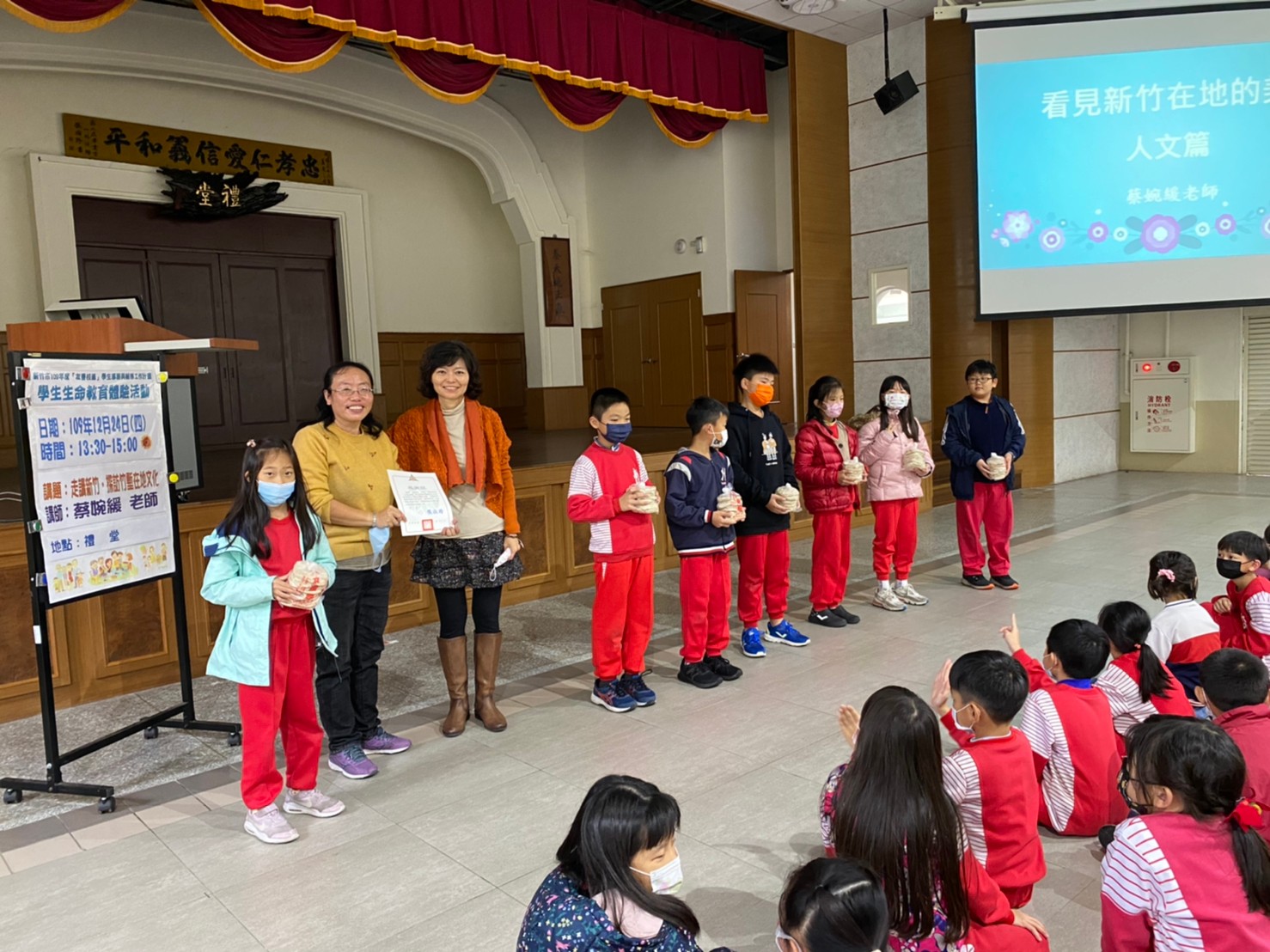 輔導室辦理四年級生命教育體驗活動,邀請本校的竹塹文化專家蔡婉緩老師擔任講師,帶給全體四年級師生們一同「走讀新竹,探訪竹塹在地文化」。蔡婉緩老師豐富的涵養與熱情的分享,讓師生們收穫滿滿,生活在新竹的我們,更應了解在地的文化特色並建立的本土文化帶給我們的意義與價值。聆聽完老師的講座後,老師更請我們常常竹塹特有的特色小點「水潤餅」,回想著老師介紹城隍廟的慶典活動、風光的鄭氏家族,發覺自己能生活在這個小城市真好!