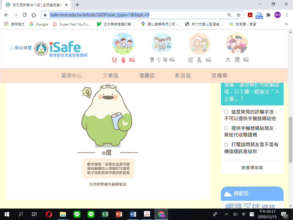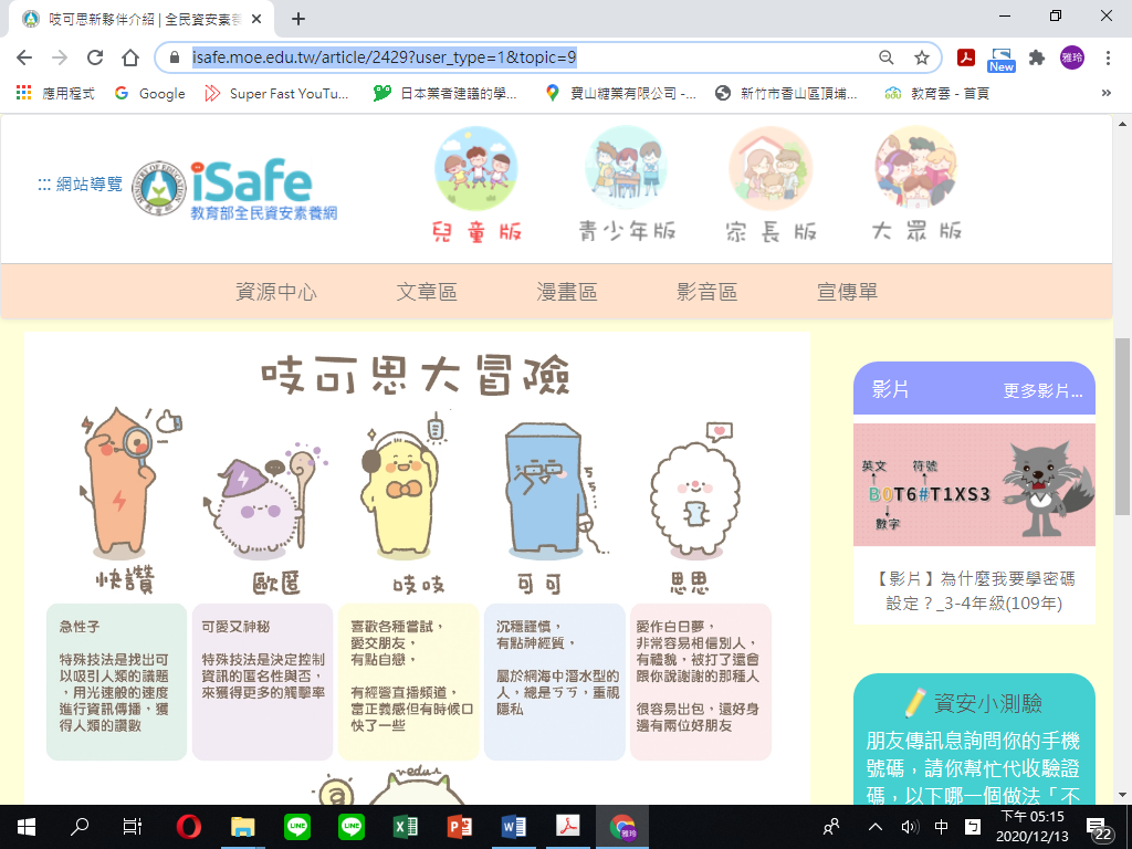 一年忠班的雅玲老師,透過教育部資訊及科技教育司特別設計的「吱可思」夥伴們,培養學生資安素養。並以一隻隻萌萌噠小生物提醒學生在網路世界上應該注意的事情,建立健康的數位使用習慣與態度及 注意網路安全議題。建立健康的數位使用習慣與態度與了解並遵守資訊訊倫與使用資訊科技的相關規範。