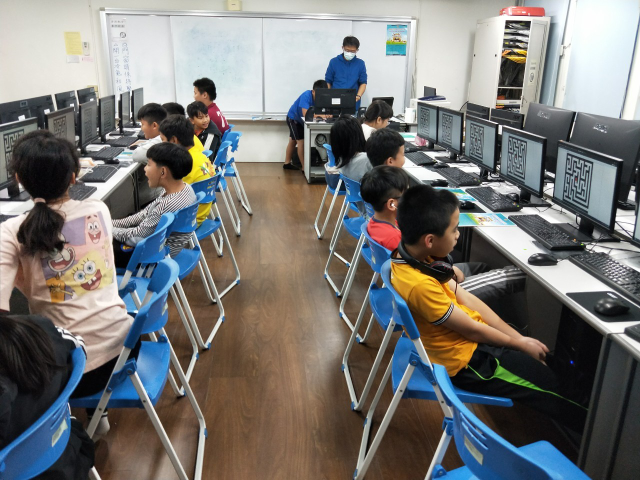 每週五的程式設計課程,在今天的主題是設計自己的作品,蔡老師藉由廣播系統,統一教學迷宮遊戲,孩子除了從影片學習SCRATCH的程式積木,更有老師細心在旁協助指導。
