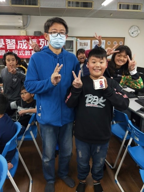 今天程式設計課程,學生在進行直升機進階遊戲中,蔡老師讓學生進行闖關活動,由葉同學拔得頭籌得到冠軍,並由蔡老師頒發小禮物。