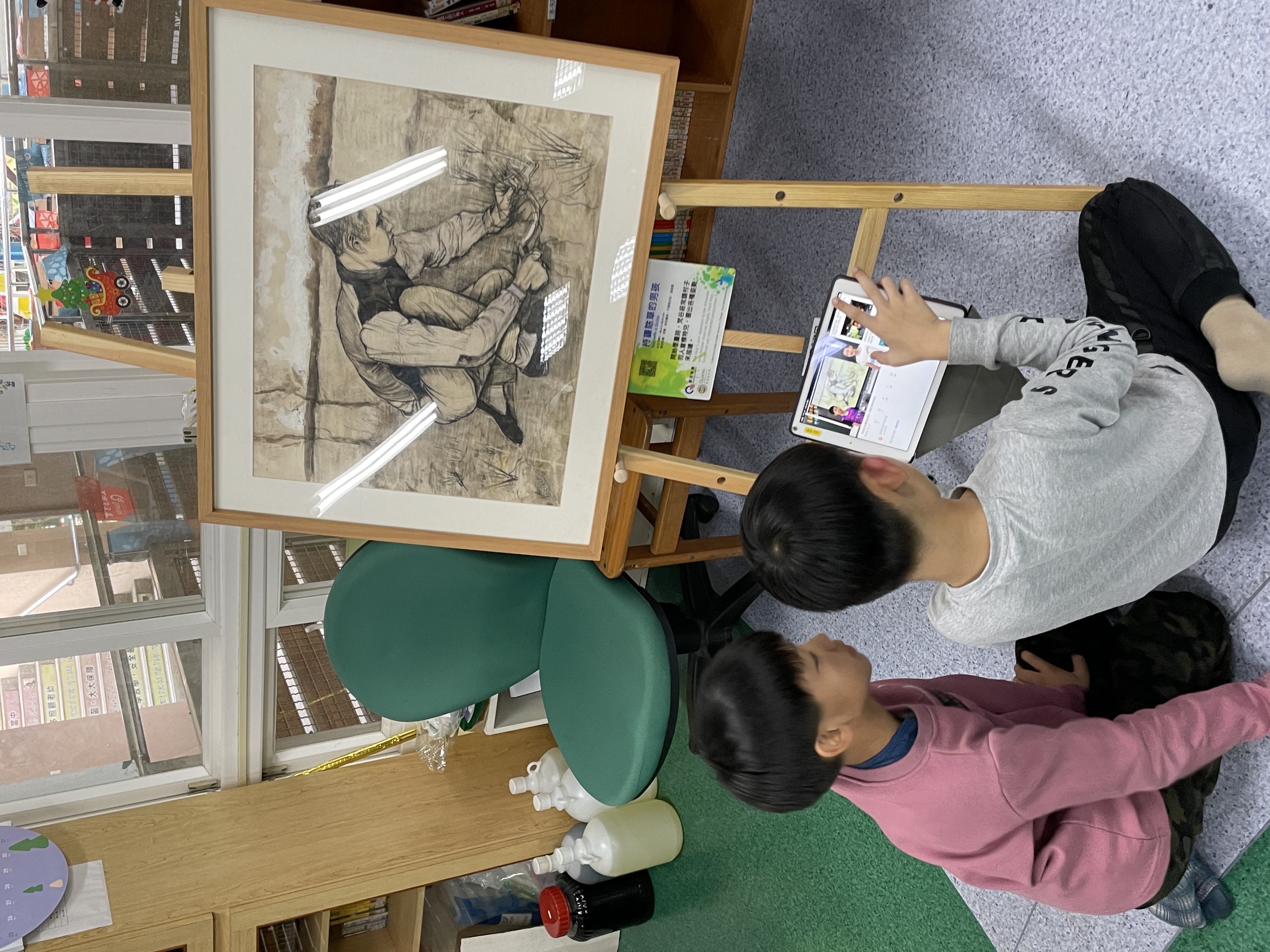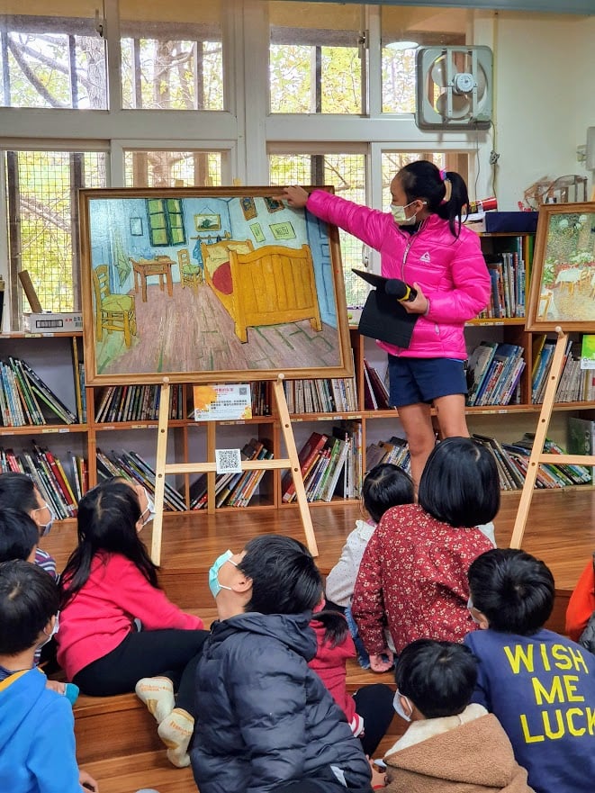 今年六甲的導覽小尖兵事先錄製導覽影片提三~五年級的孩子掃描QR Code觀看,並且為低年級學弟妹們進行現場導覽解說。在毓真老師和育慈老師的指導下,每位導覽小尖兵不但解析梵谷畫作內容、創作背景,並且還分享自己對於這幅畫的感受,加上怡仁老師的適時補充,讓孩子們收穫滿滿。