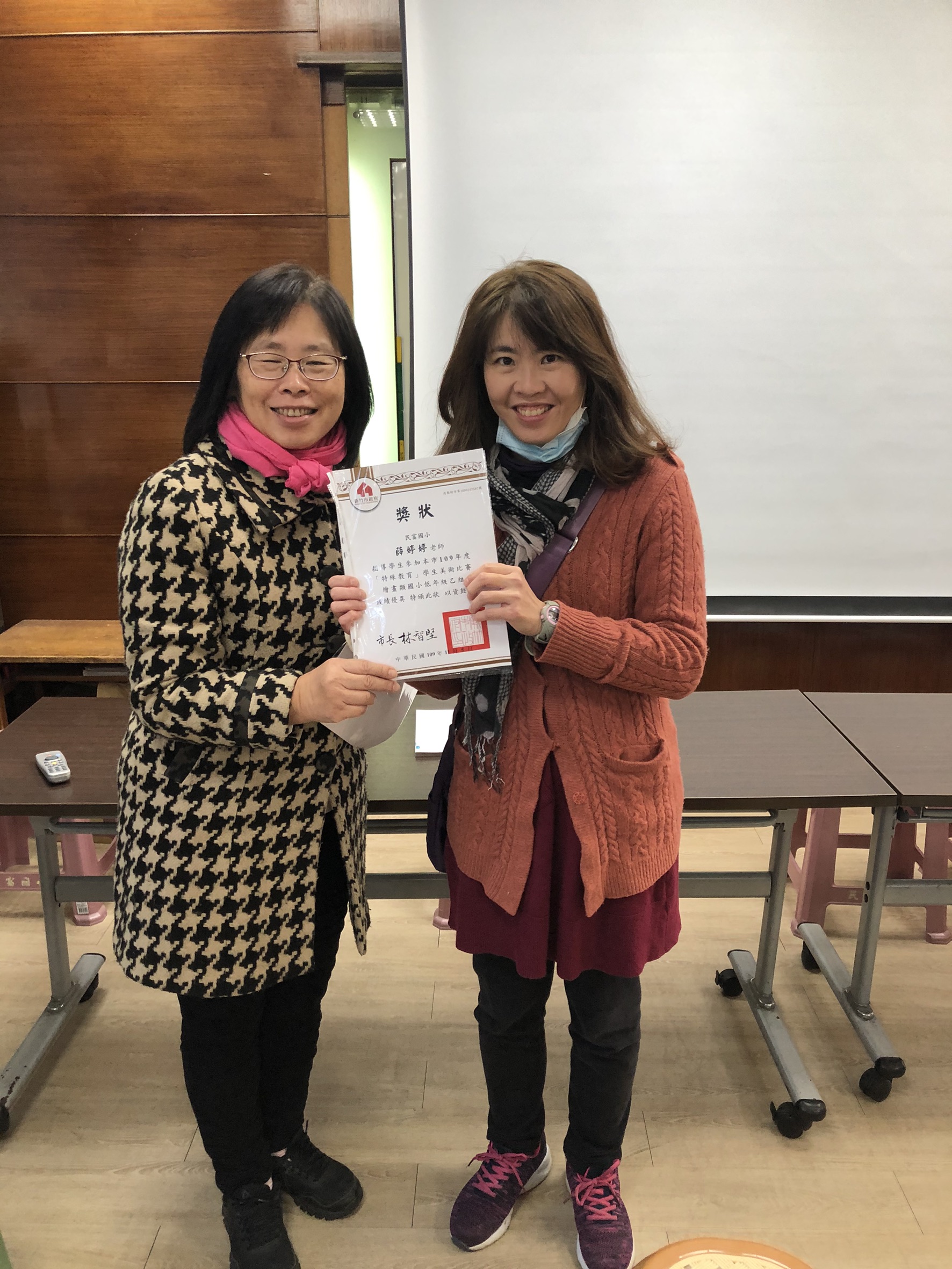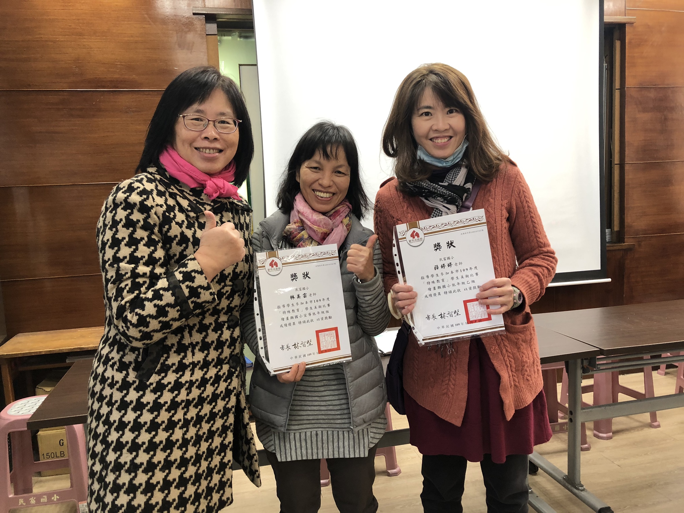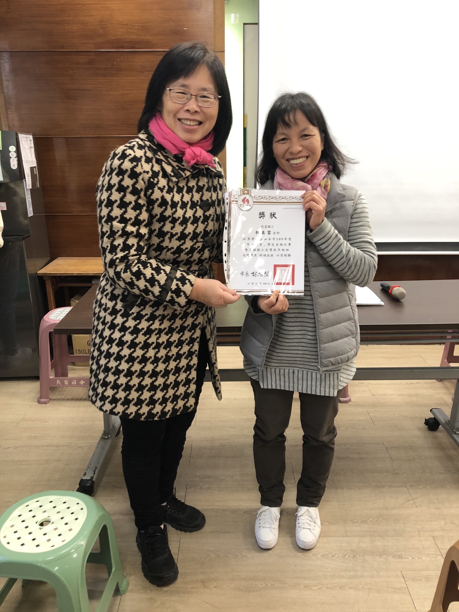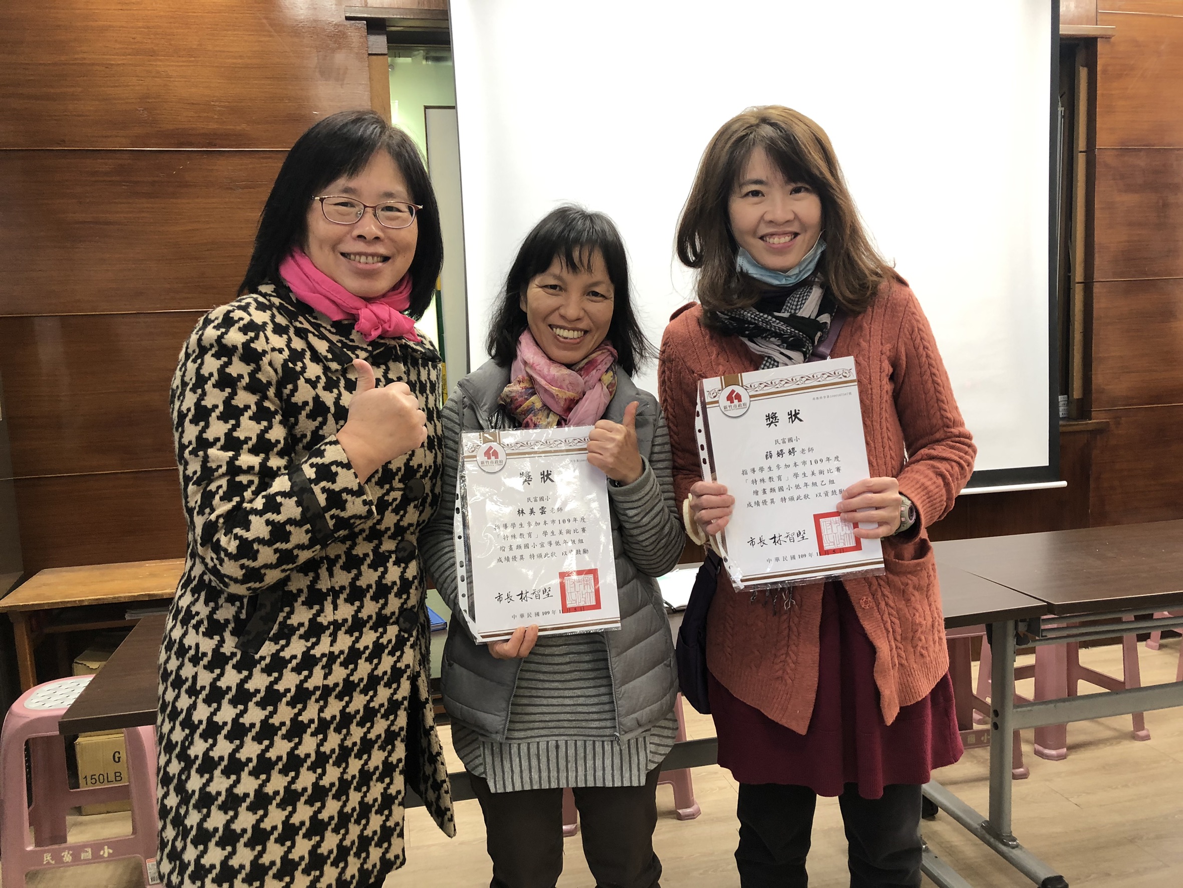 今天中午特別利用午會時間頒發特殊教育美展指導老師獎狀,本校共有兩位學生參加特教美展榮獲佳作,今天特以獎狀感謝指導的老師-林美雲老師、薛婷婷老師。特教美展舉辦目標如下:(一) 鼓勵特殊教育學生發展美術才能,進而能開發其潛能。(二) 提供特殊教育學生展現自我舞台,建立其信心與尊嚴。(三) 增進一般生主動關懷身心障礙者,協助特殊教育學生。(四) 藉由特教美展活動建構關懷圖像,達成「因礙而愛」情操。今年宣導組參賽作品以「有愛無礙 融合共好」為主題。本校老師們積極指導孩子們進行繪圖,感謝老師們的用心。