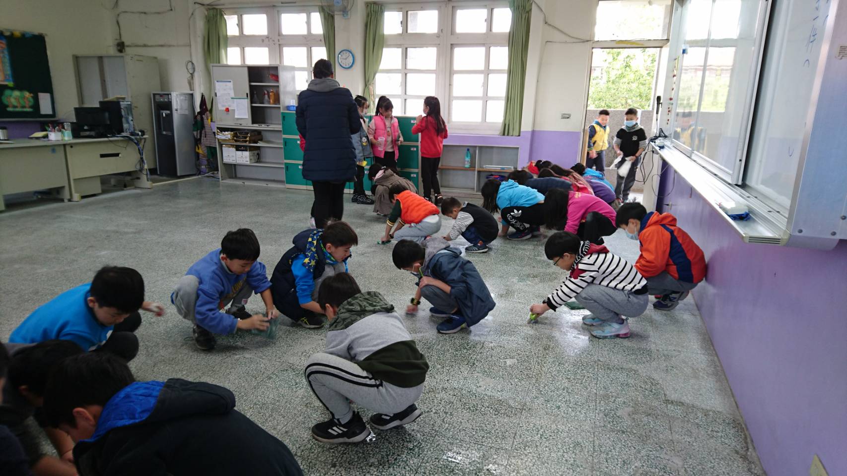這周就要結業式了,所以今天全校總動員開始大掃除。小孩各個摩拳擦掌捲起衣袖,雖然因為疫情關係,很多班級每天放學老師都會清潔消毒,教室內外一直維持得很乾淨,但每個孩子仍仔細地擦拭桌子椅子、櫃子、門窗,接著用稀釋過的漂白水消毒一遍,學校就是我們第二個家,身為家的一份子,我們要一起努力唷!!