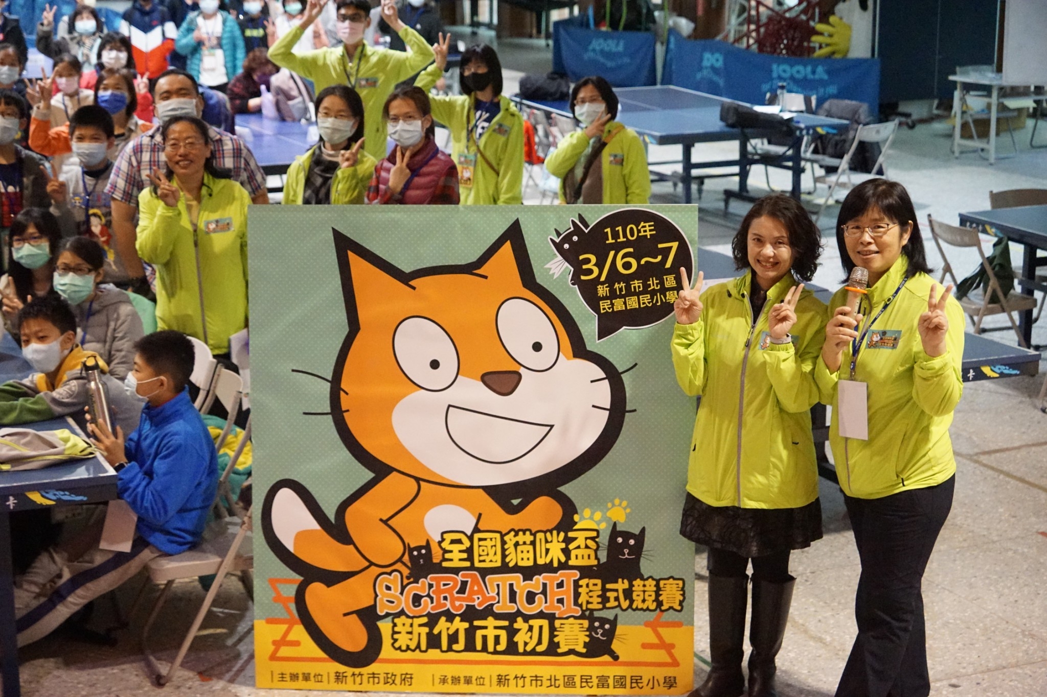 今早雨勢不小,感謝各校帶隊老師,假日辛苦陪同學生,參加在民富國小舉行的全國貓咪杯SCRATCH程式設計(新竹市初賽)盛會。更感謝教育處學管科張品珊科長、各校校長(舊社莊傑志校長、朝山李麗娥校長、水源何信煒校長、大湖徐美玉校長、富禮凃靖娟校長)親臨民富指導並鼓勵學生。