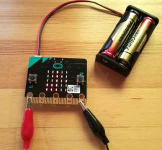 Micro:bit的操作方式不太難,可以將建立的程式檔案複製到micro:bit之後,即使沒有電腦也可以執行。電源供應方面,則是將USB傳輸線連接到智慧型手機用的電池上,或是將3V電池座連接到micro:bit的電源連接器上。