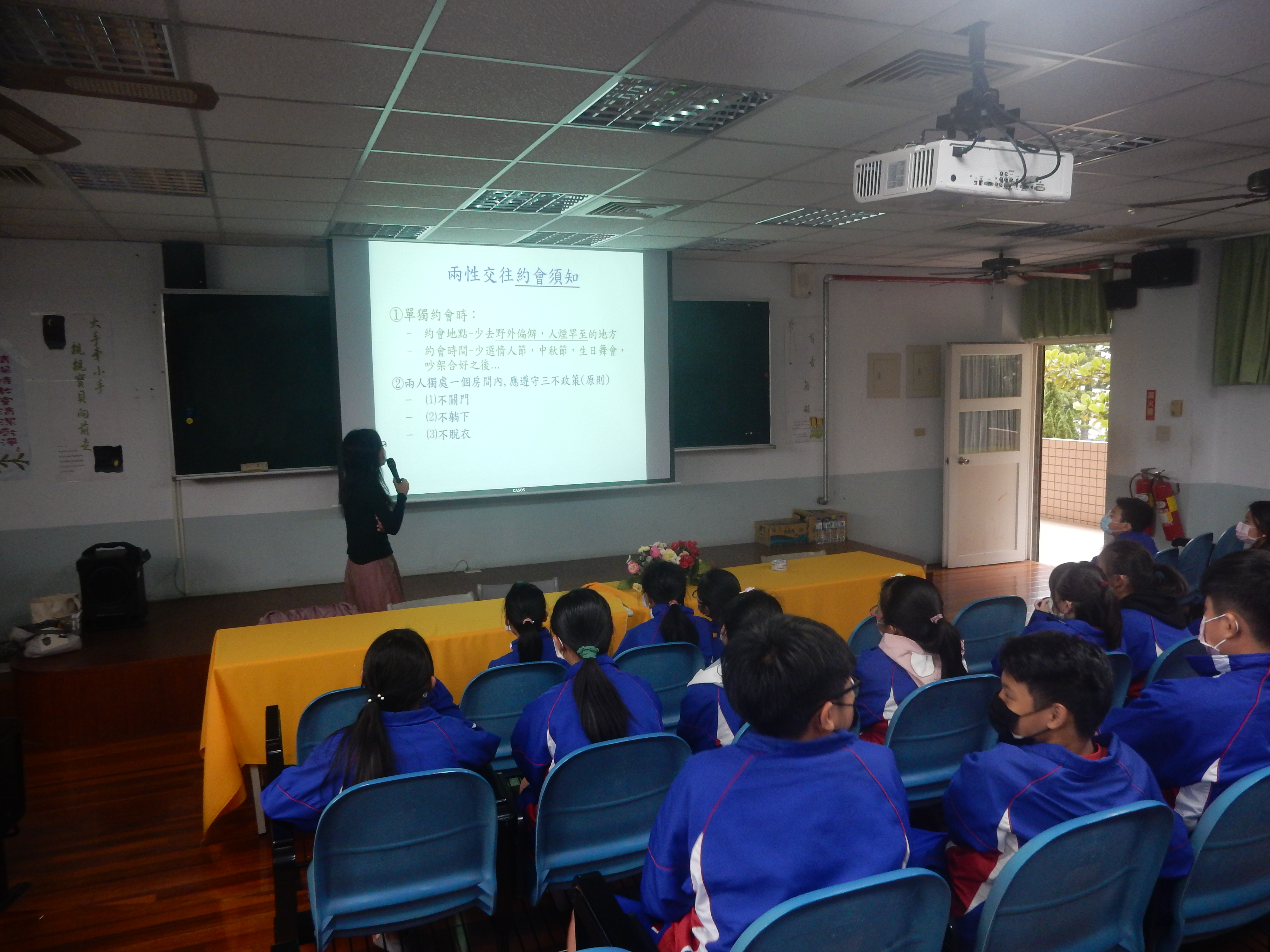 邀請元培科大汪惠芬助理教授蒞臨本校跟同學們分享兩性交往約會須知;堅持約會三不原則:不關門、不躺下、不脫衣;「性」不等於愛-戀愛是用談的,不是用做的;愛他就應該要等待,婚前性行為「快樂最短暫,後悔最長久」希望女同學要勇敢說不,才不會面臨意外懷孕的煩惱。