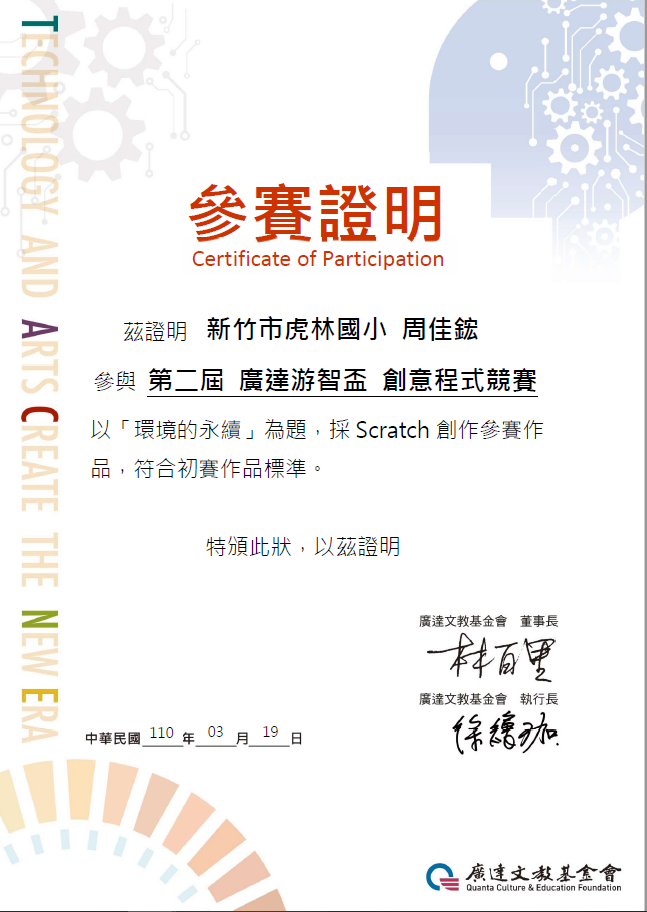 恭喜本校6年愛班萬品宸、周佳鋐同學參加第二屆廣達游智盃創意程式競賽,以環境永續為題,採用SCRATCH設計「海龜吃什麼」作品入選初賽。