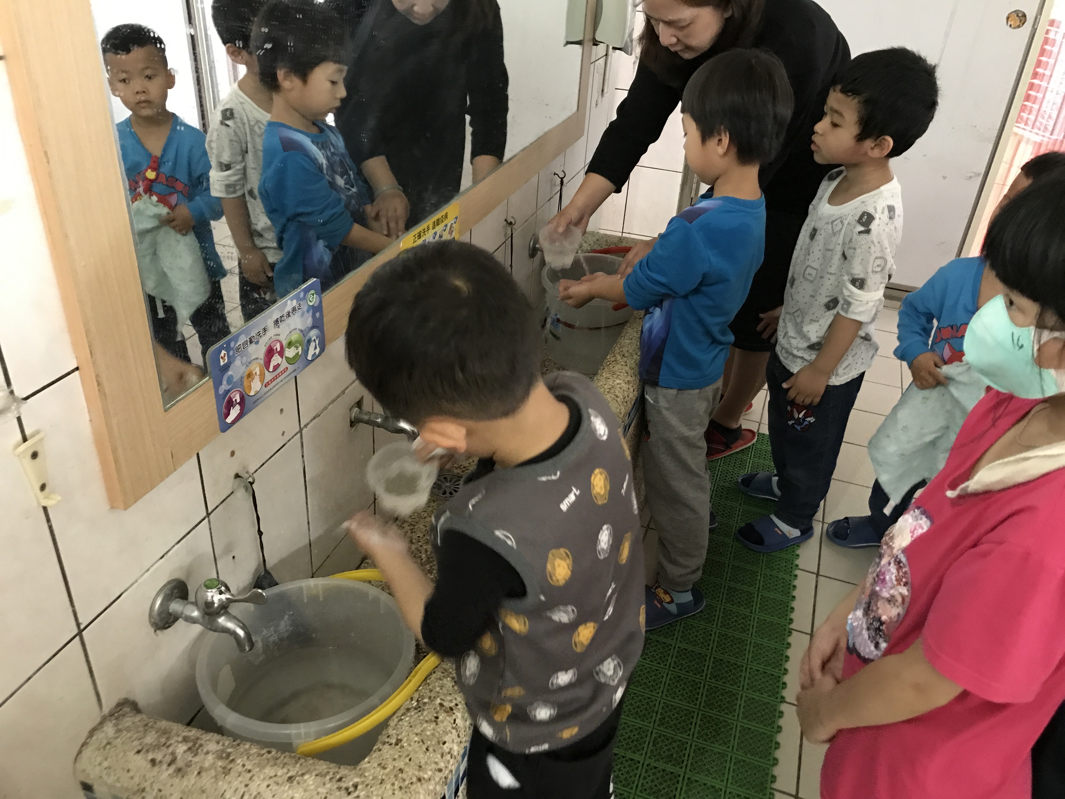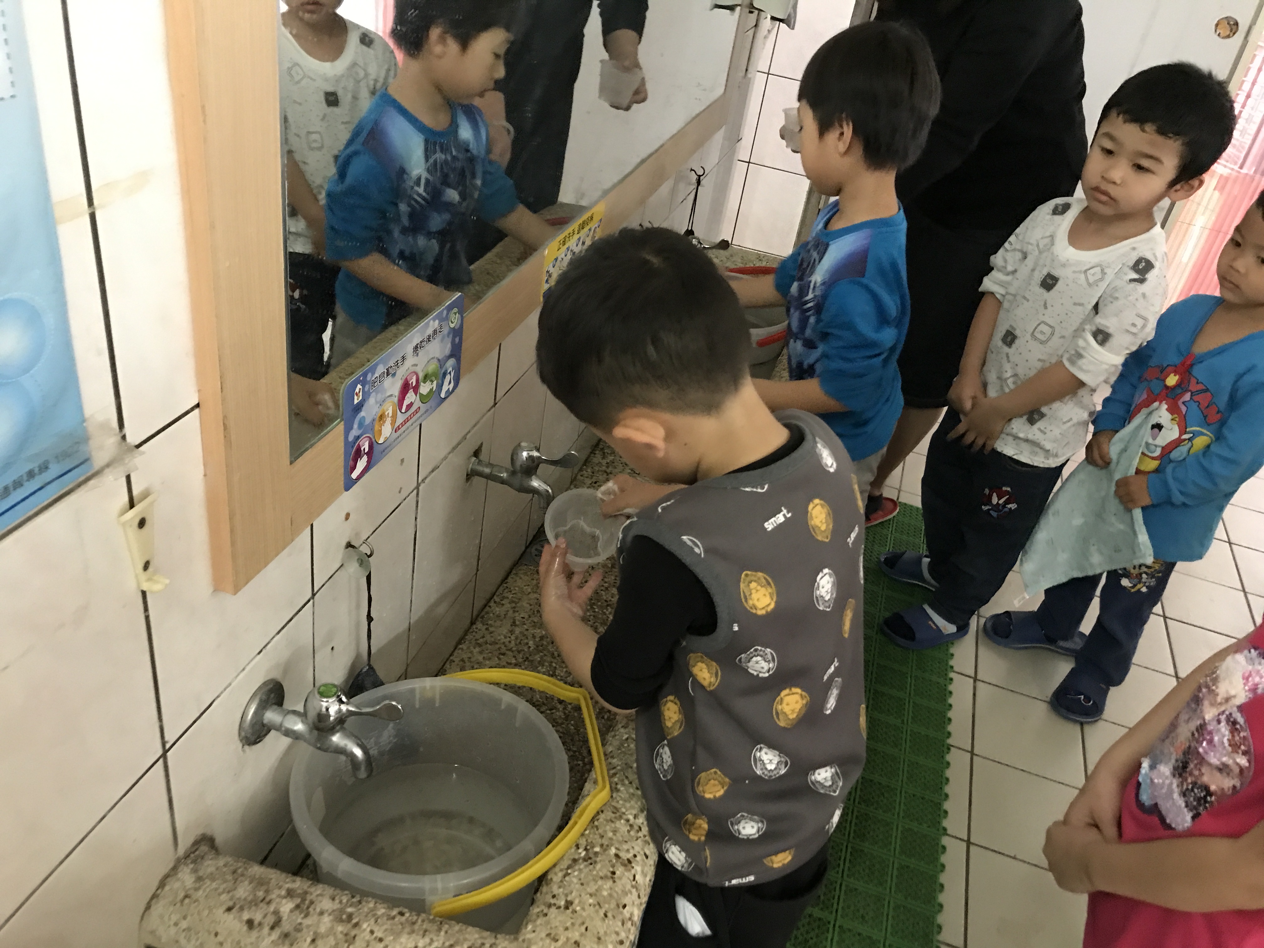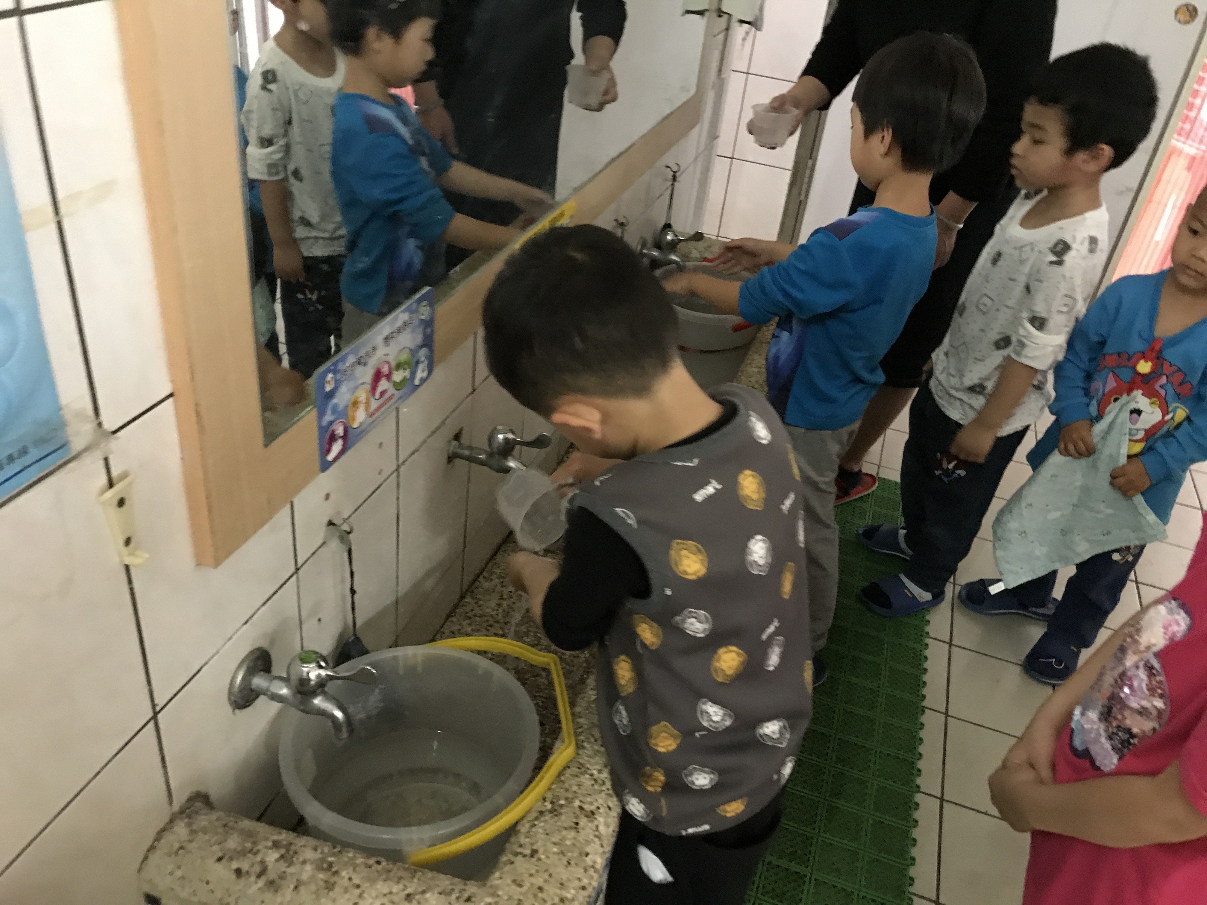 昨天幼兒園停水一天,孩子們發現用水桶及小水瓢洗手很方便也非常省水,而且也可以把手洗乾淨,決定繼續實施省水的模式,幫忙珍惜資源節約用水。在台灣水資源太豐富了,我們常常習慣水龍頭一打開就有水流出來,如果能養成好習慣,可以學會惜福與珍惜資源,是非常好的品德。