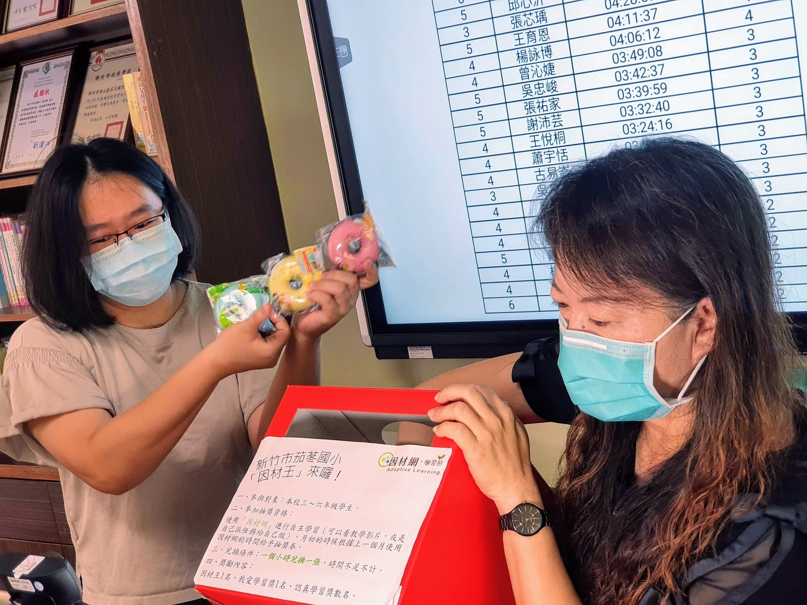 這學期最後一次因材王抽獎,育慈老師、孟宣主任、玲芳主任積極推動教育部「因材網」線上學習平台,準備精美實用的獎品,鼓勵孩子使用因材網進行自主學習。六月份學習時數累積最多的是程皓、祐真和子寧,分別獲得八張摸彩卷!