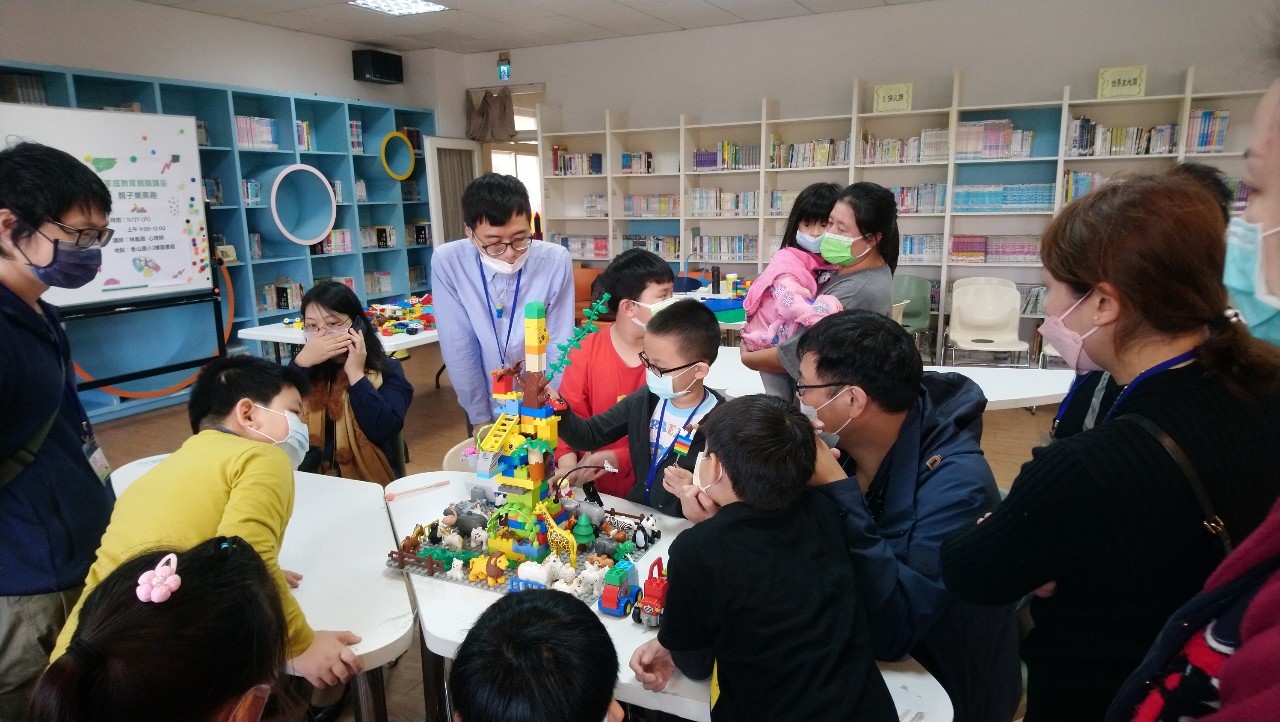 今年邀請到擅長以樂高積木進行親子互動及諮商的林胤國(果果)心理師到校進行「樂高親子趣」的親職講座。心理師將家中常見的樂高積木玩具,變成親子之間互動的橋樑,果果心理師設計了許多合作的任務,讓參加的家長及孩子們彼此之間合力完成作品,在互動的過程中,也能從旁學習到不同家長與孩子們相處的模式。