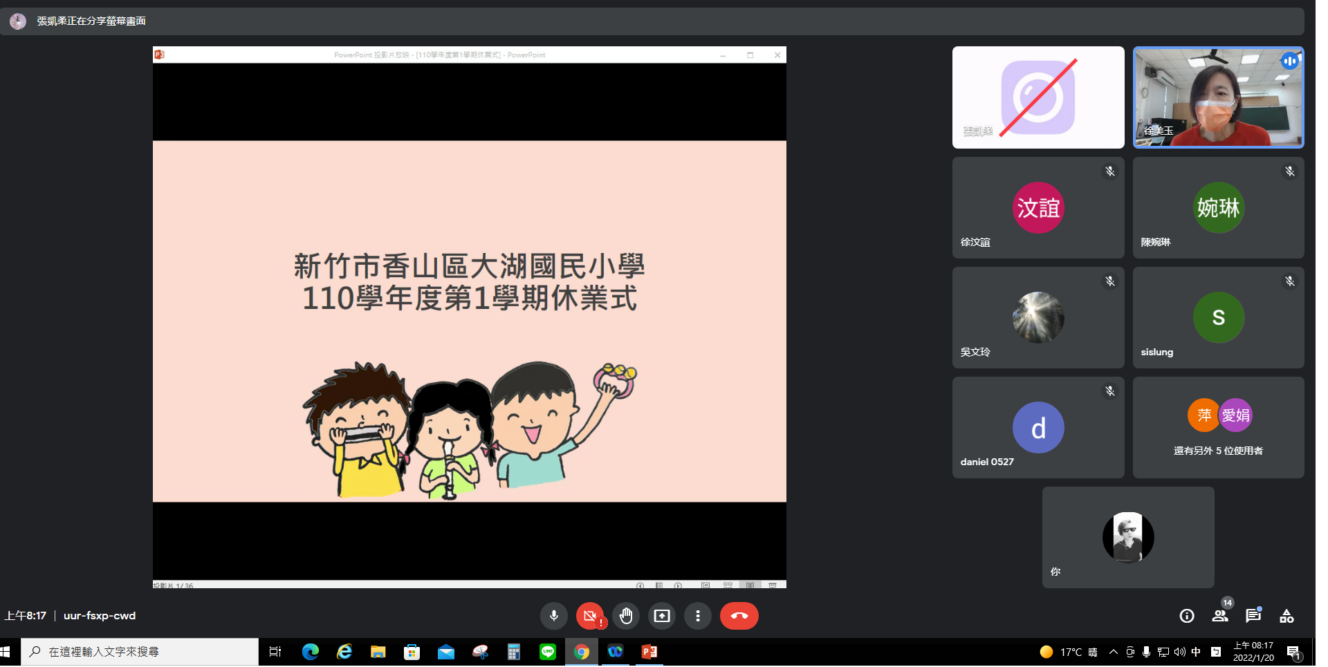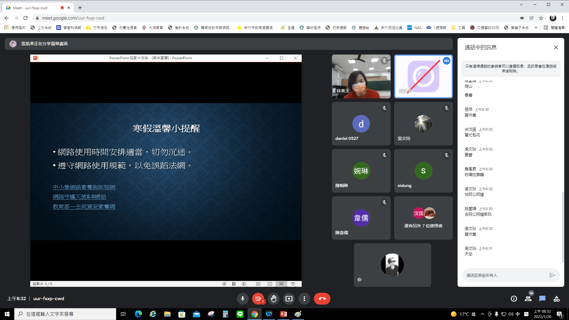 大湖國民小學因應疫情,利用google meet進行線上寒假安全宣導。凱柔主任利用繪本作為前導,叮嚀學生寒假期間學生須遵守網路禮節與安全、相關法律常識,以及防疫工作、交通安全、口腔衛生…等;翰博老師也叮嚀學生們寒假期間必須注意的事項,與室內及戶外的各項宣導,希望學生們都能平安快樂的度過這個寒假。