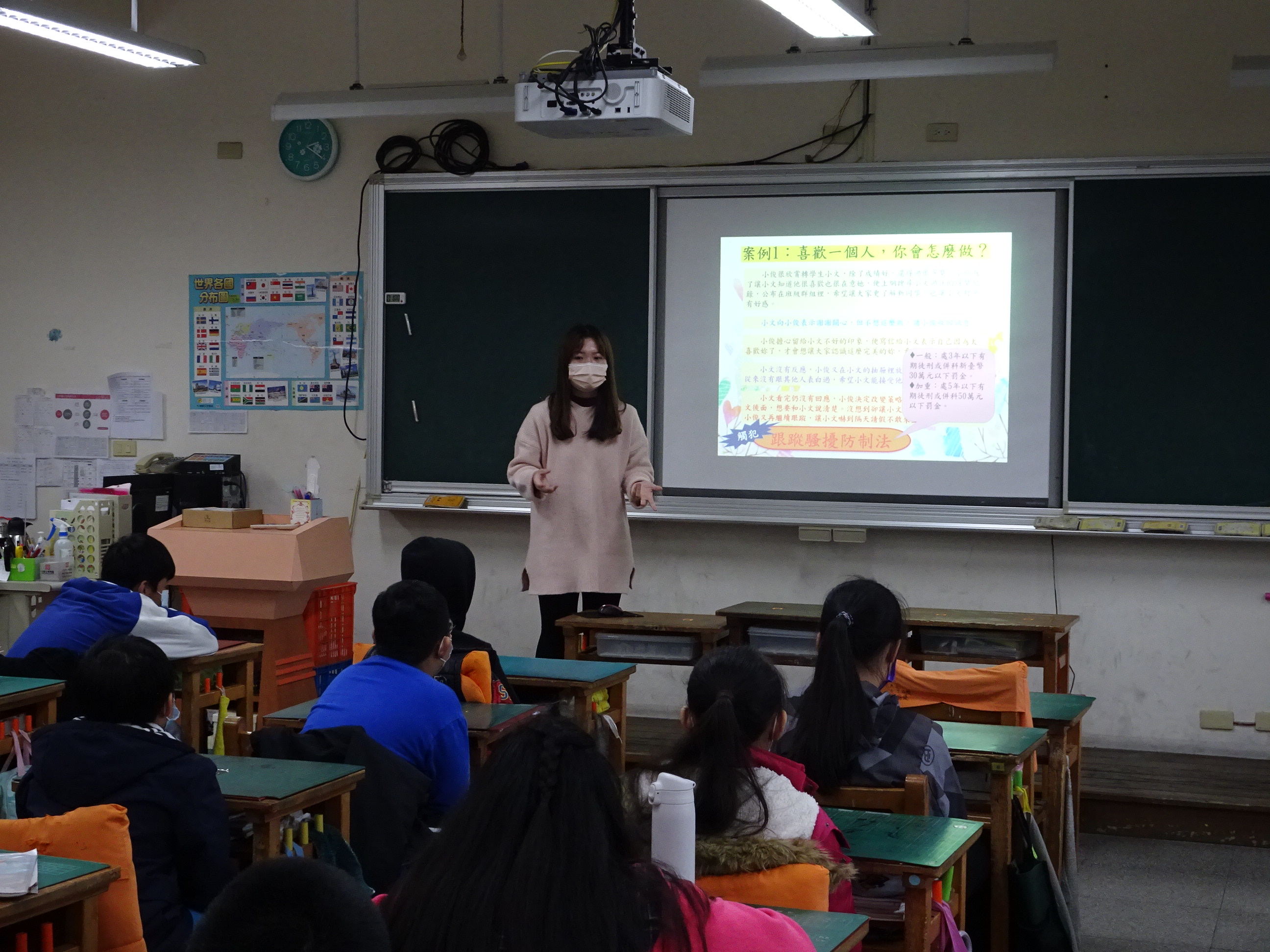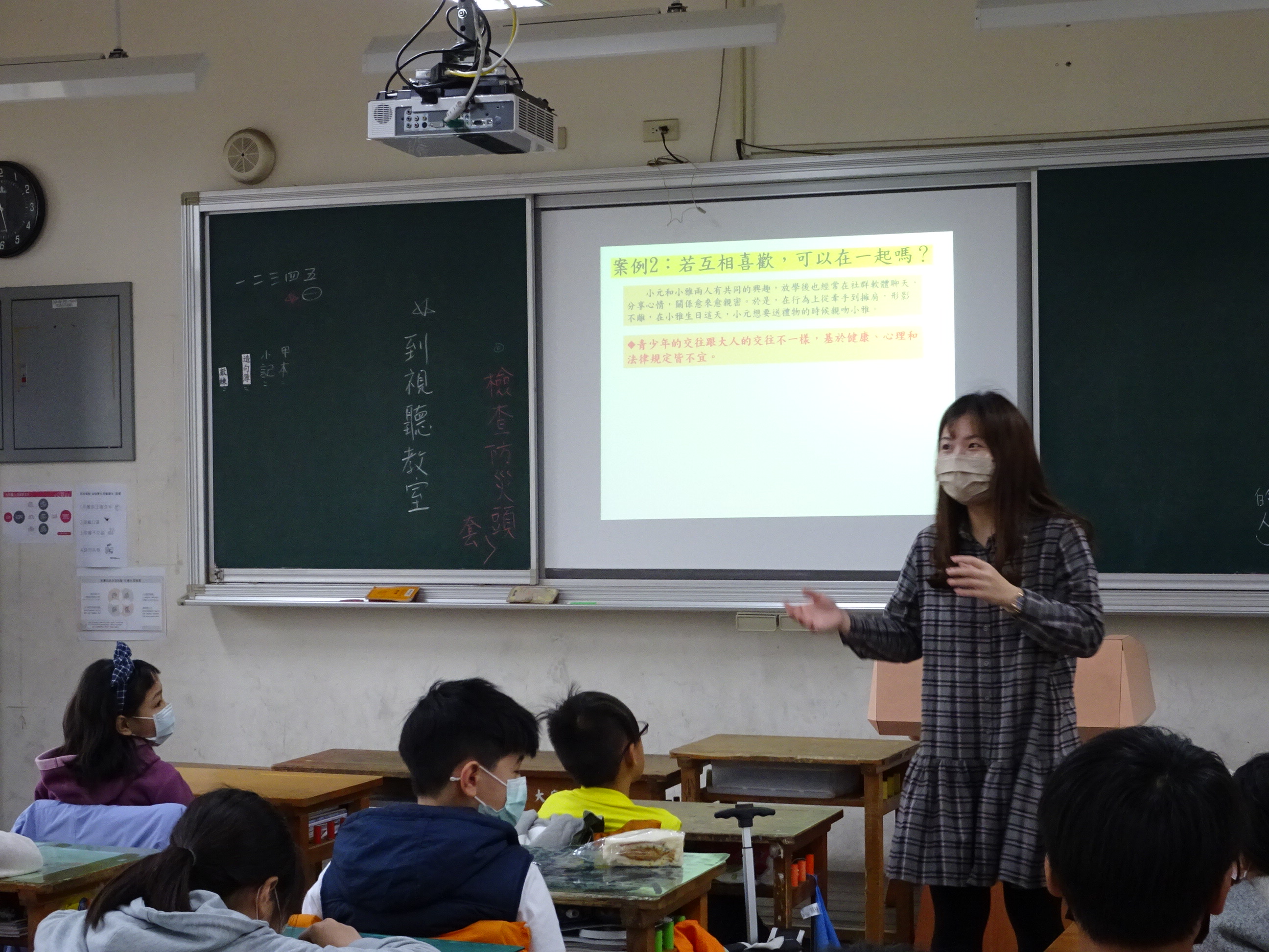 本校專任輔導老師利用六年級去畢旅之前,到高年級各班進行一堂<談「心」時刻>,融入性別平等、情感教育及網路安全上的宣導。老師循序漸進地舉了五個生活情境案例,皆是青春期孩子感興趣及躍躍欲試的議題,例如:喜歡一個人會怎麼做?雙方未成年互相喜歡就可以在一起嗎?引導孩子做思考,喜歡一個人沒有錯,但不能讓人不舒服;人際關係的相處需考慮對方的個性及感受。也讓孩子明白制定法律的主要目的是用來保護我們,青少年的交往和大人的交往是不同,要明白相處上的身體界線,在適當年齡做適當的事,才是最自然、也最不妨害身心發展的。另外,孩子常會利用手機分享訊息或影片,也提醒孩子每個人都有隱私權,不能無故偷拍或偷錄未經他人許可的畫面及聲音,在不確定影片的合法性之前,更不能隨意轉傳影片,小心會觸法!這堂課讓孩子學到愛人之前,要先愛自己、保護自己,不用傷害自己的錯誤方式去引起他人的注意!