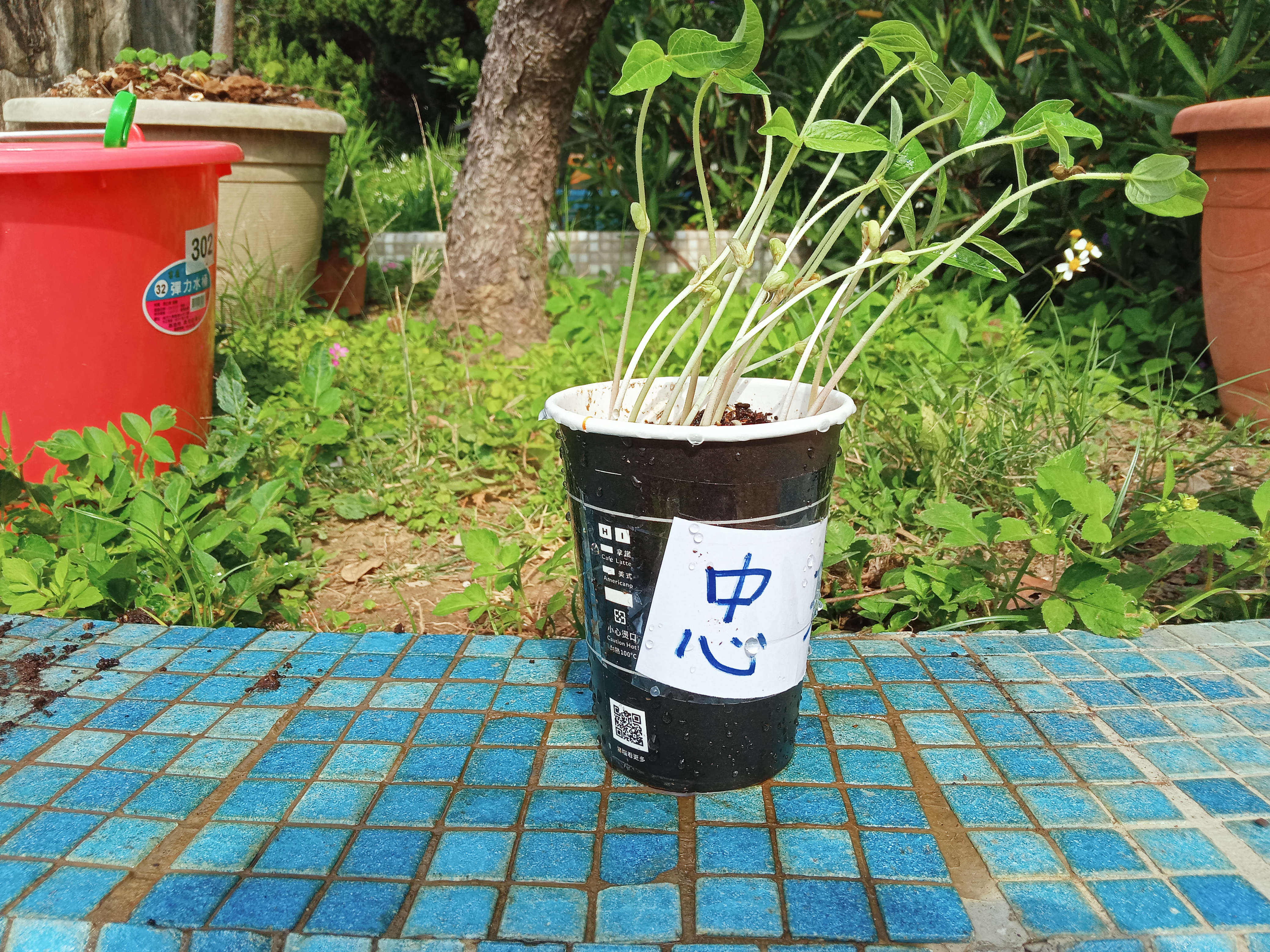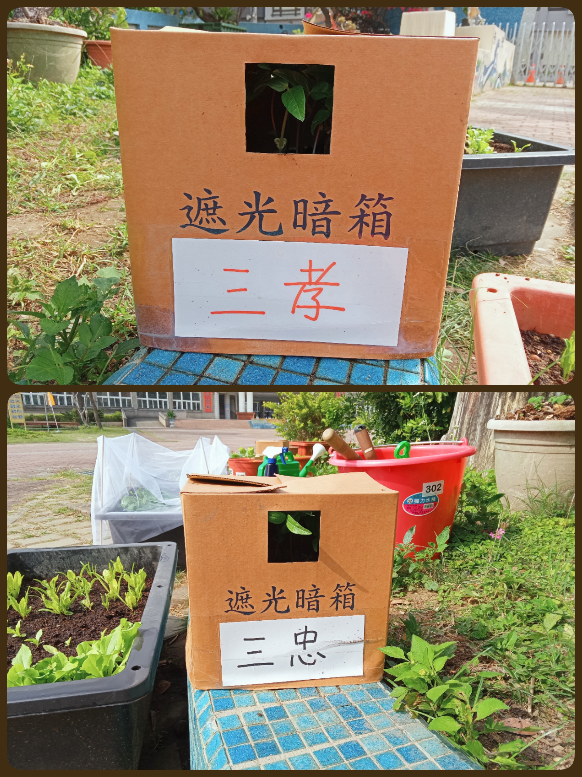 另外,我們為了讓孩子認識植物的向光性,種了三盆小綠豆,兩盆罩上開有洞口的紙箱、一盆直接置於陽光下,讓孩子們觀察對照,一週後孩子們清楚的看到了大自然的奧妙:「生命會自己奮發向陽,自找生路!」😆