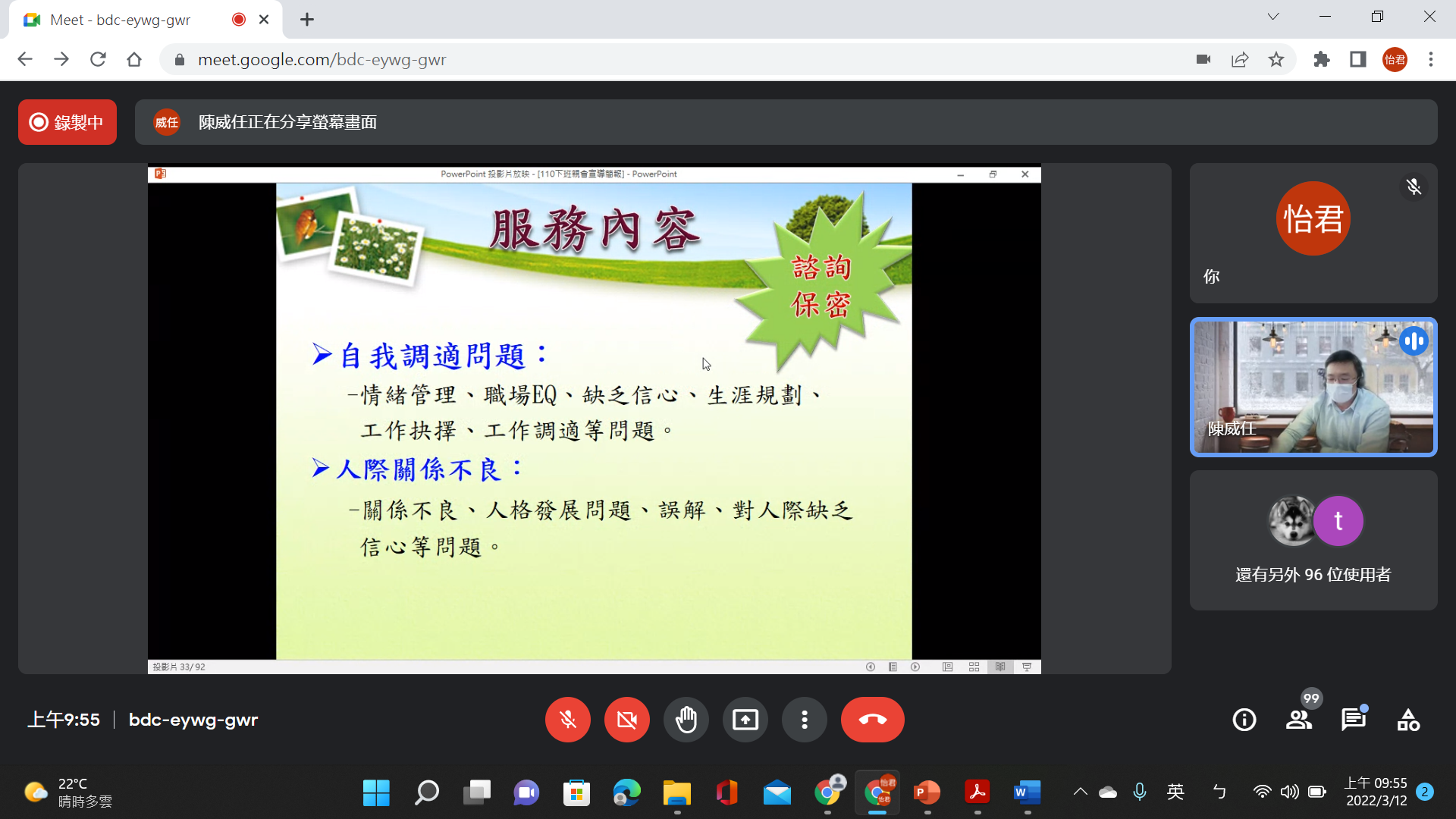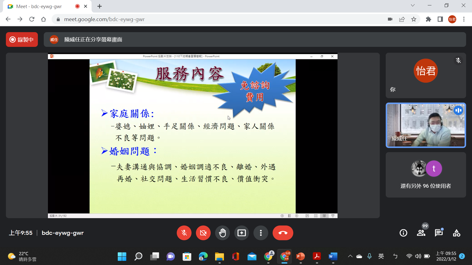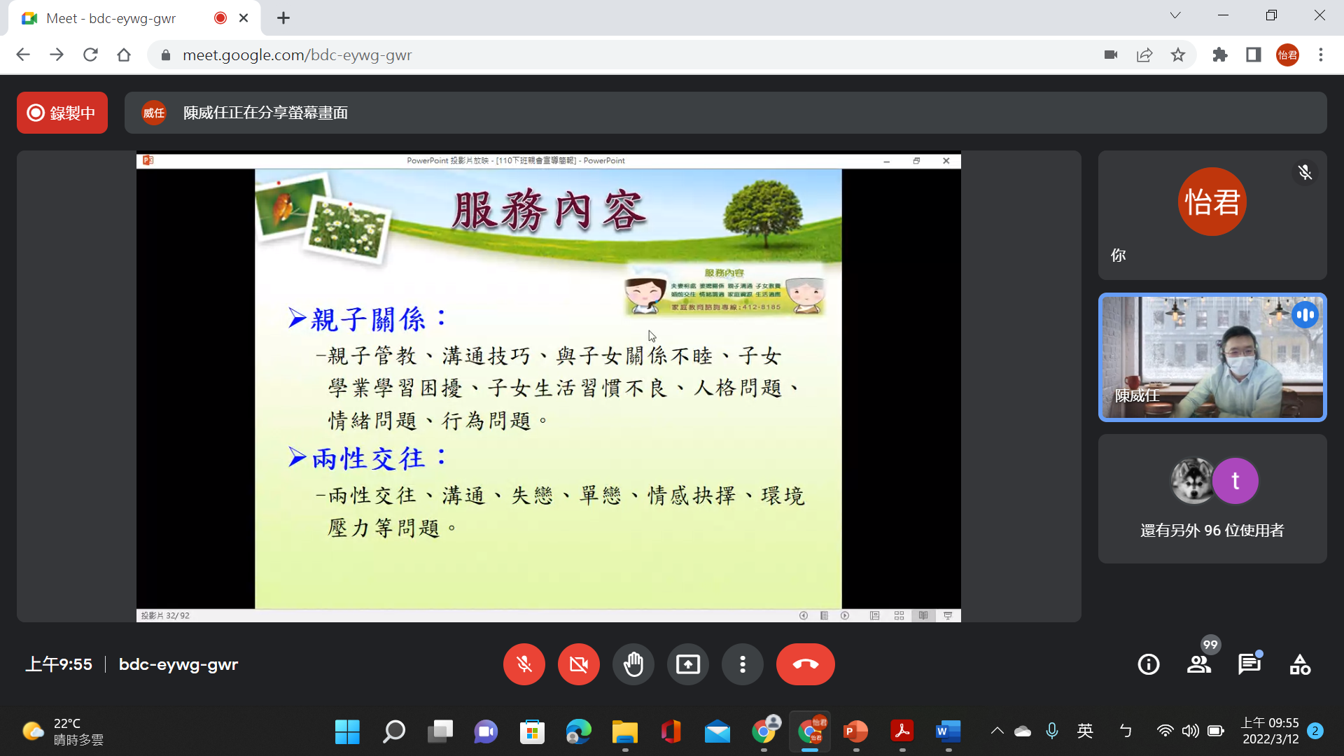 本校於111.03.12舉辦線長家長日,宣導家庭關係建立與暴力防治,內容包含家庭關係、親子關係、兩性關係、家庭教育諮詢專線…等。以及自我調適問題和人際關係不良。